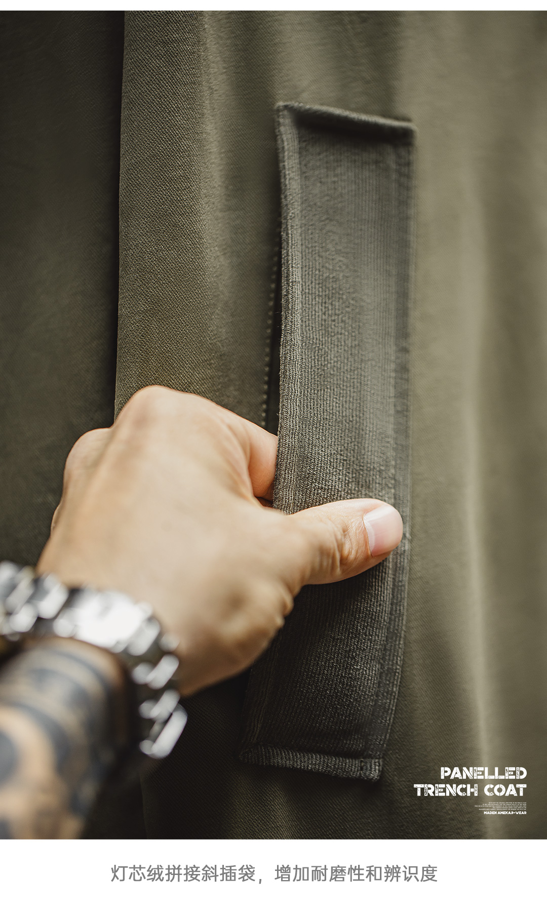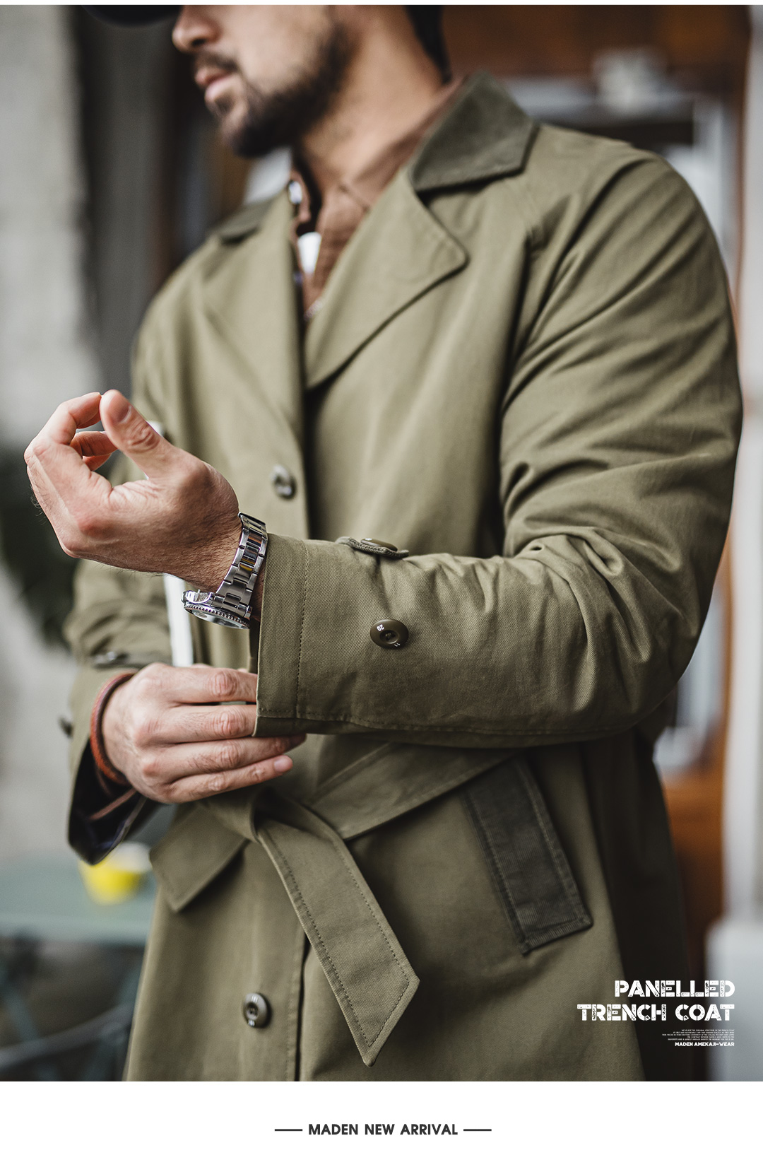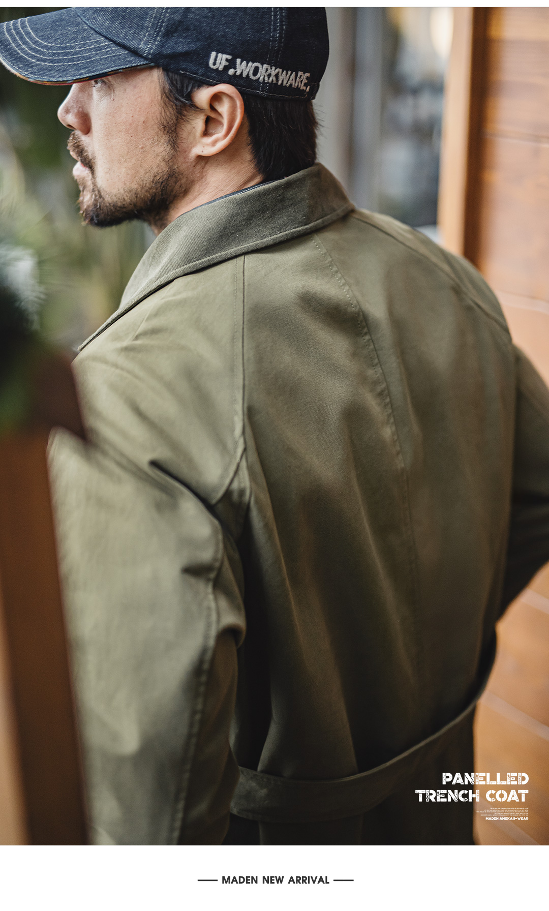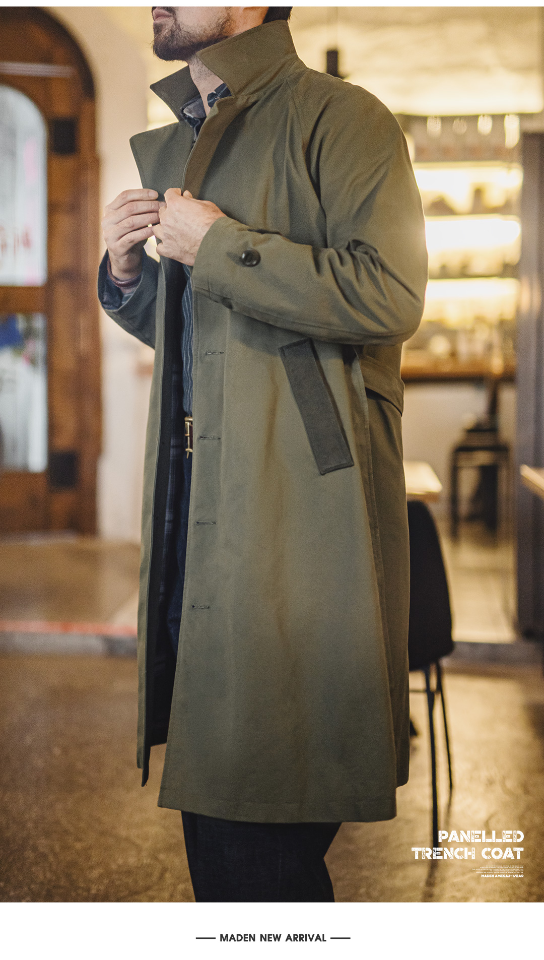 马登工装美式复古战壕风衣军绿色中长款翻领纯棉大衣外套男款春