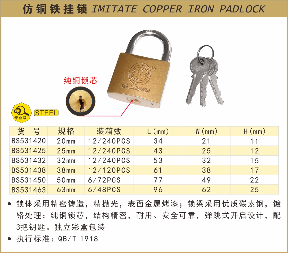 波斯 仿铜铁挂锁 25mm BS531425