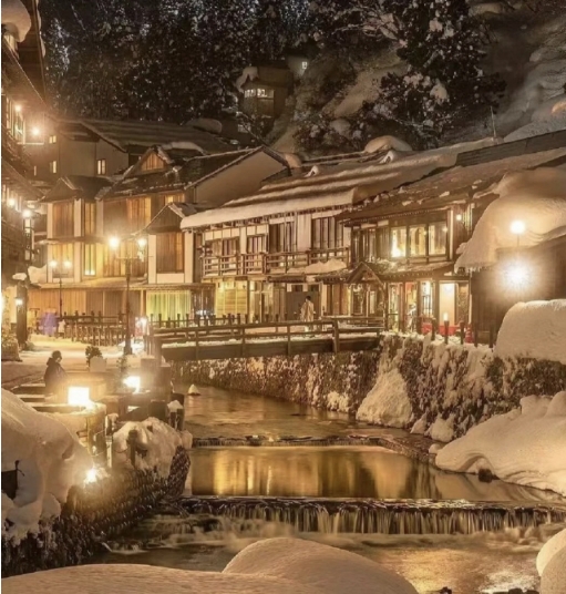 银山温泉位于山形县的尾花泽市,因为500多年前发现银矿而得名。这里的冬季有着丰富的降雪,温泉街上的百年木屋银装素裹,如梦似幻,仿佛时光就此静止。银山川清冽的河水冒着热气穿流其中,气氛宁静,宛如世外桃源,还有被誉为现实版《千与千寻》中的油屋。