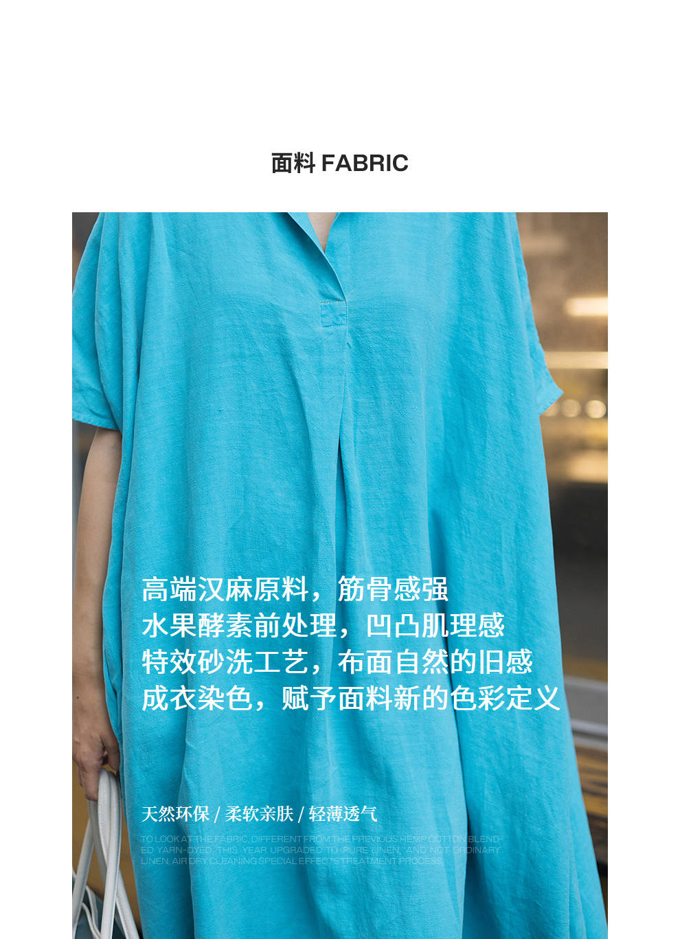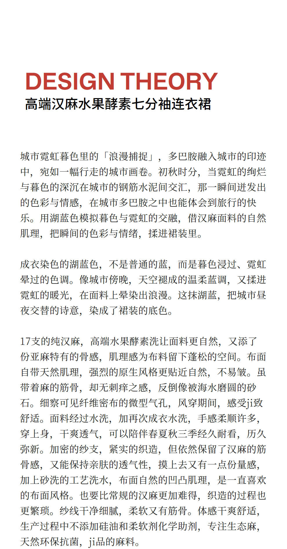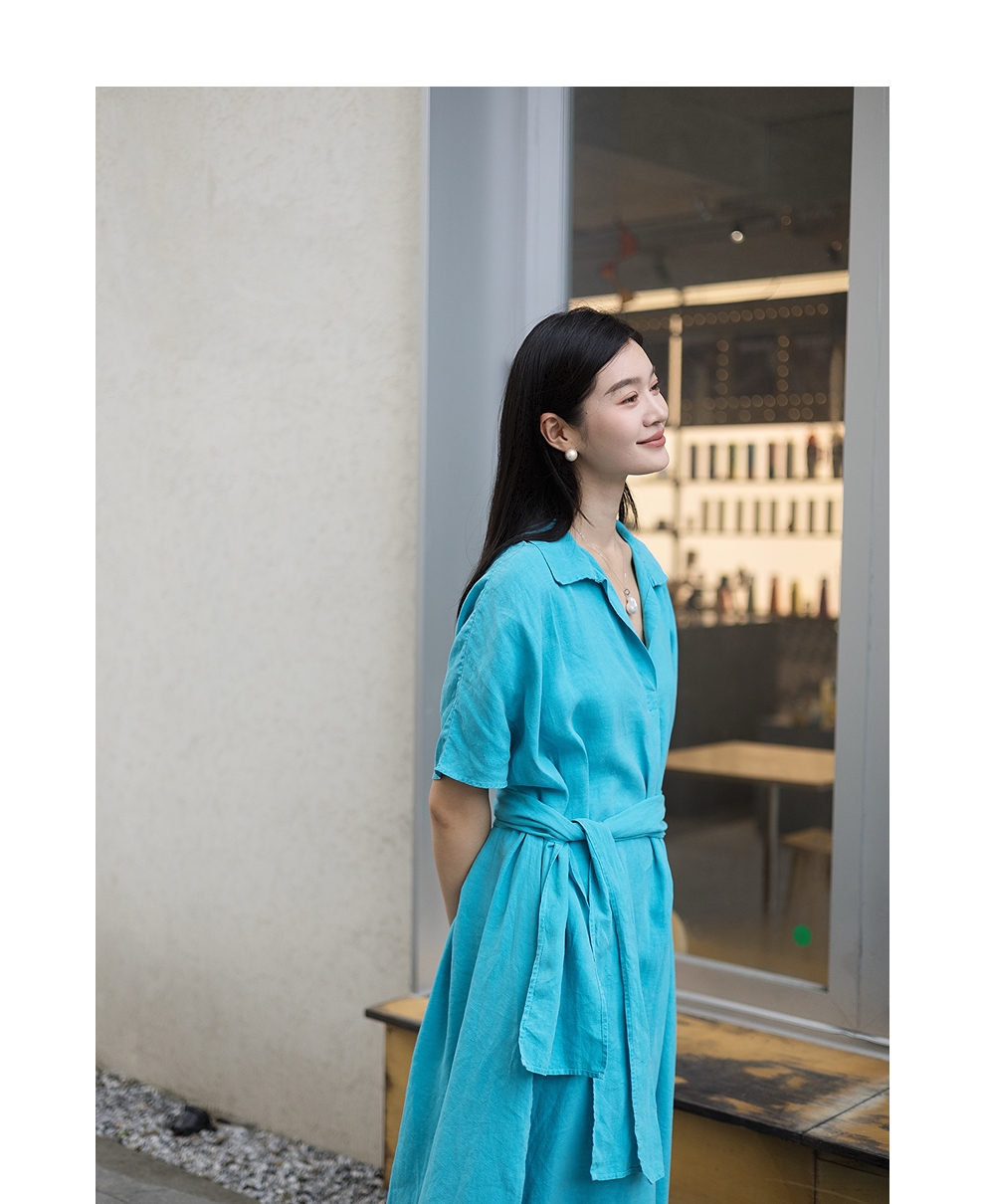 绽放女装553朵/高端汉麻水果酵素洗V领翻领设计感七分袖连衣裙女