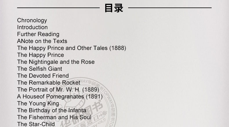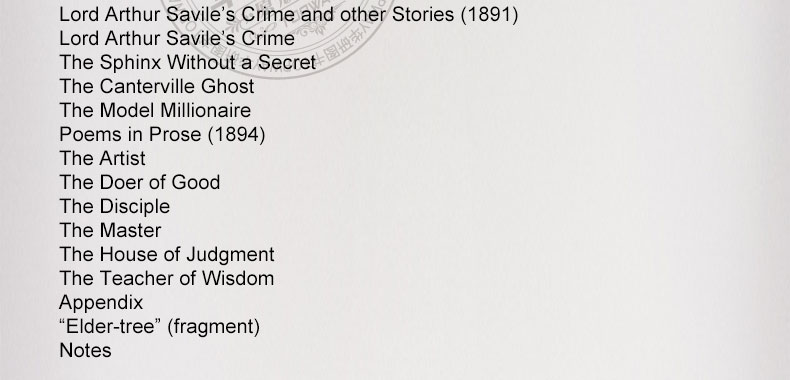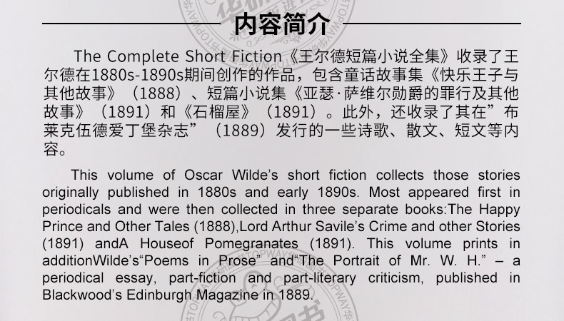 The Complete Short Fiction《王尔德短篇小说全集》收录了王尔德在1880s-1890s期间创作的作品,包含童话故事集《快乐王子与其他故事》(1888)、短篇小说集《亚瑟·萨维尔勋爵的罪行及其他故事》(1891)和《石榴屋》(1891)。此外,还收录了其在”布莱克伍德爱丁堡杂志”(1889)发行的一些诗歌、散文、短文等内容。