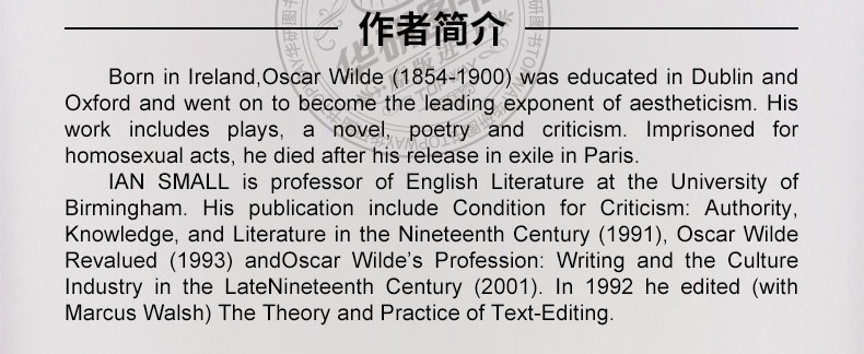 IAN SMALL is professor of English Literature at the University of Birmingham. His publication include Condition for Criticism: Authority, Knowledge, and Literature in the Nineteenth Century (1991), Oscar Wilde Revalued (1993) andOscar Wilde’s Profession: Writing and the Culture Industry in the LateNineteenth Century (2001). In 1992 he edited (with Marcus Walsh) The Theory and Practice of Text-Editing.
