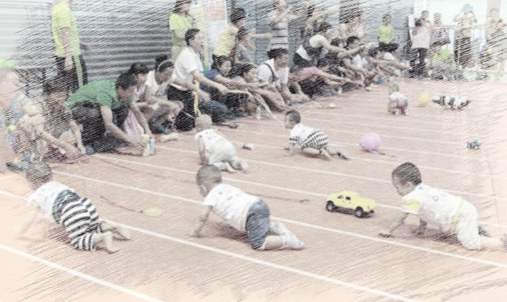 规则:活动五人成形,开始比赛,家长在前面那物品引导孩子爬行,看谁先爬到终点。