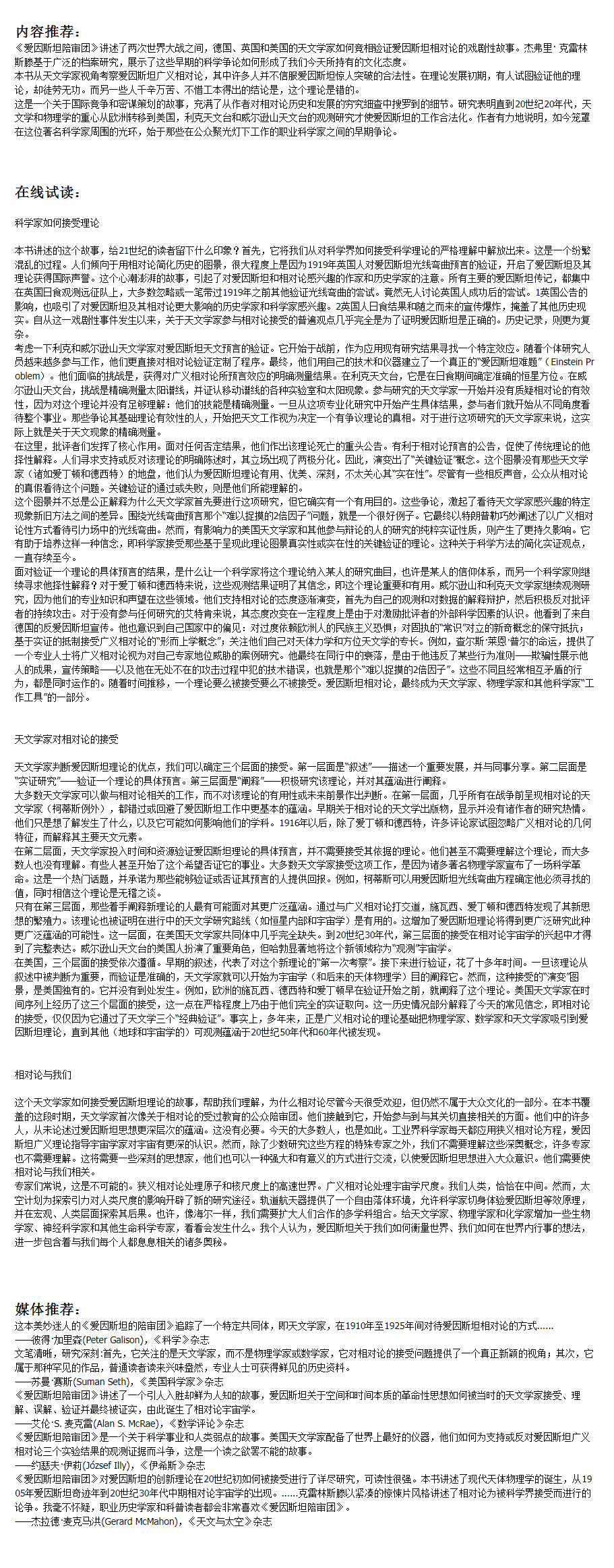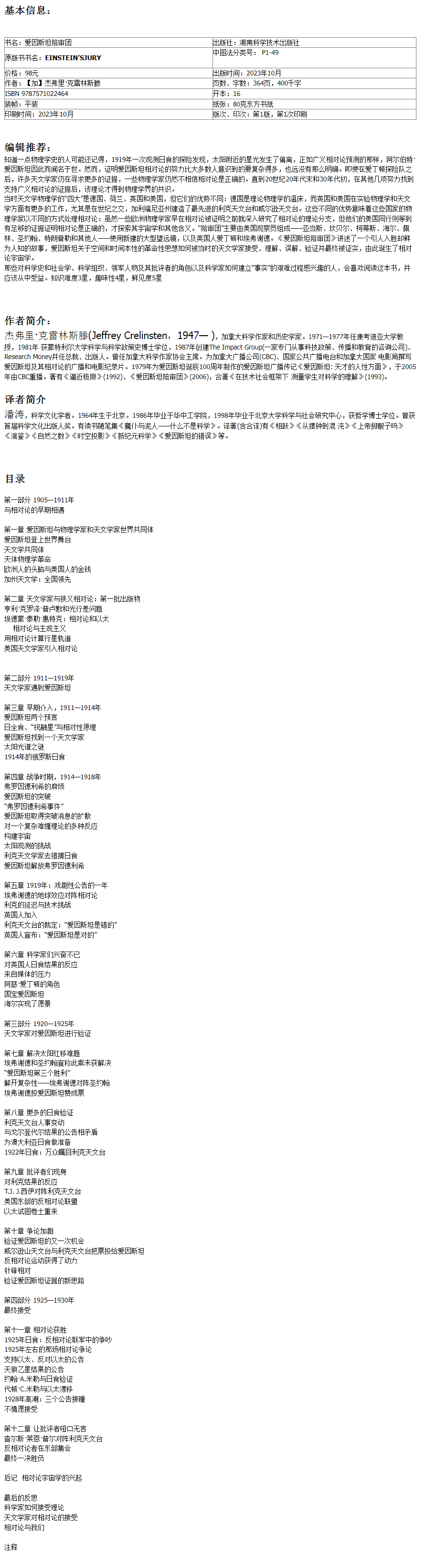 爱因斯坦陪审团 两次世界大战之间天文学家对爱因斯坦广义相对论的审判相对论 爱因斯坦 日食 考察队 天文学 爱丁顿 利克天文台 威尔逊天文台 引力红移 星光偏折 光线弯曲