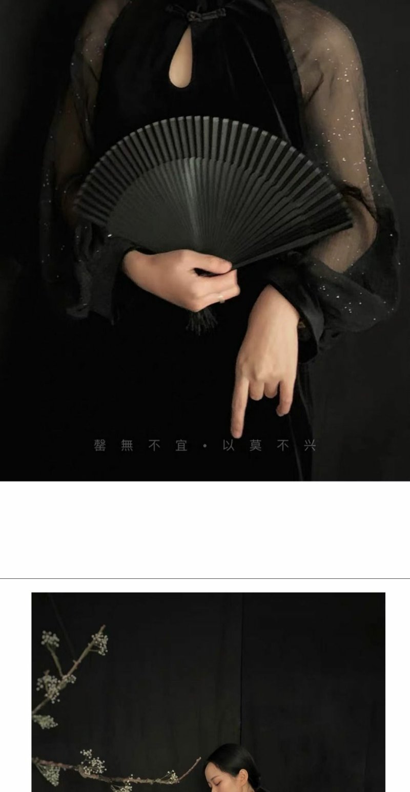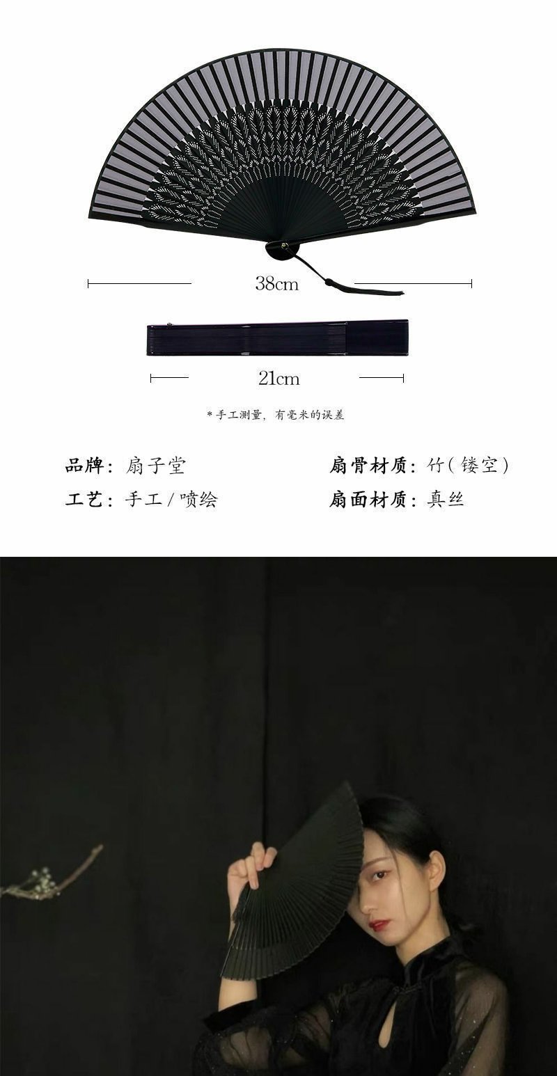 扇子古风网红霸气黑色真丝款孔雀折扇发条件家黑色扇骨扇面扇子