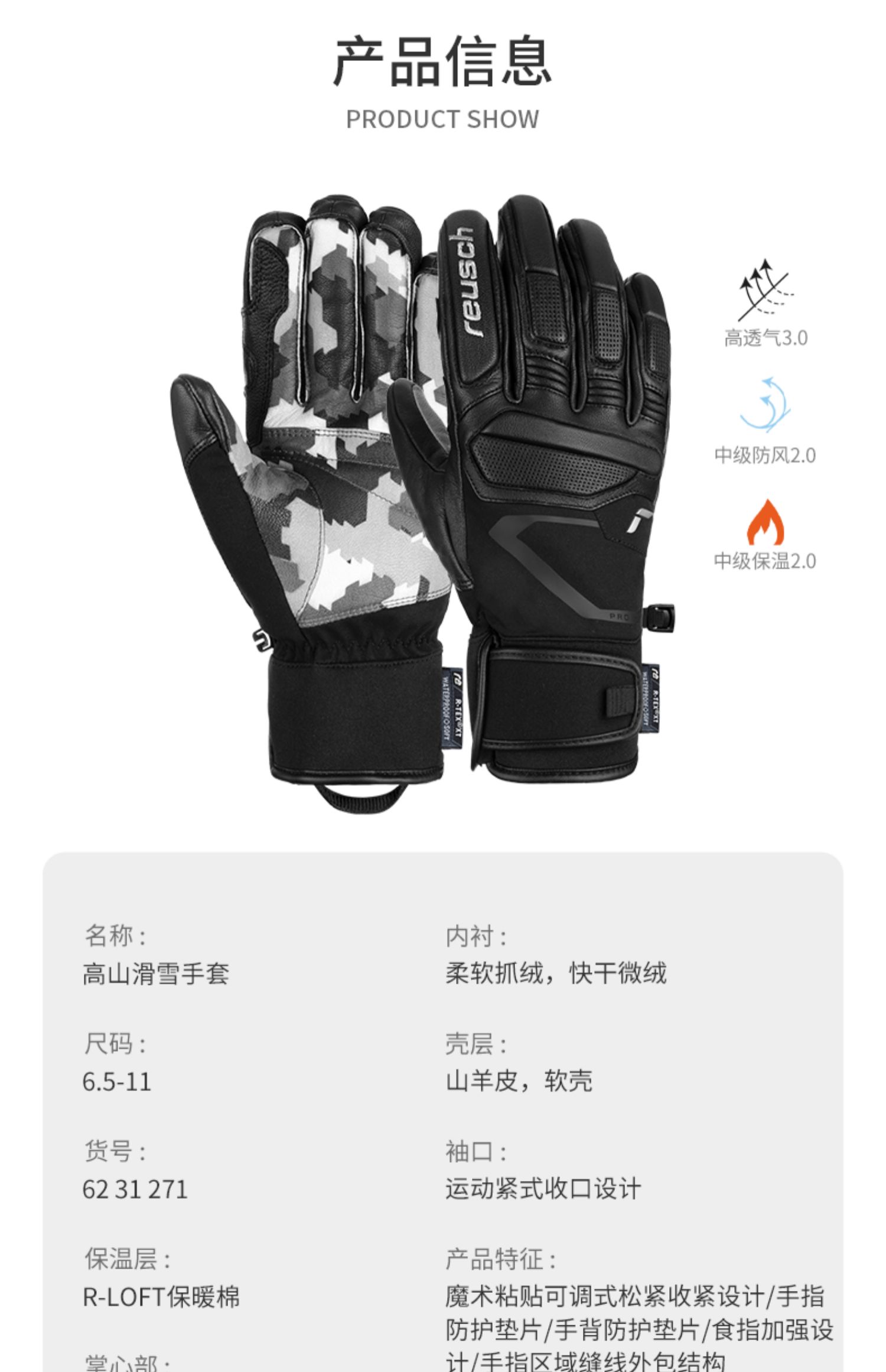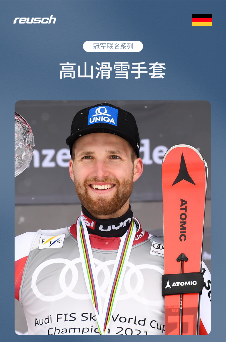 Reusch冠军联名马尔科施瓦茨款防风透气保温真皮滑雪手套6201112