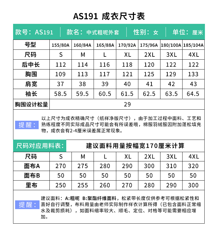 裁缝学苑AS191中式女装中国风唐装新年衣服粗呢外套纸样大衣样板裁剪