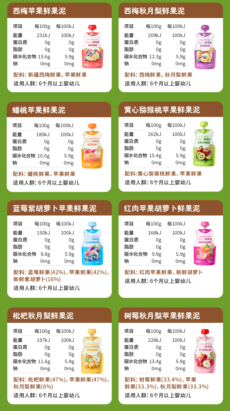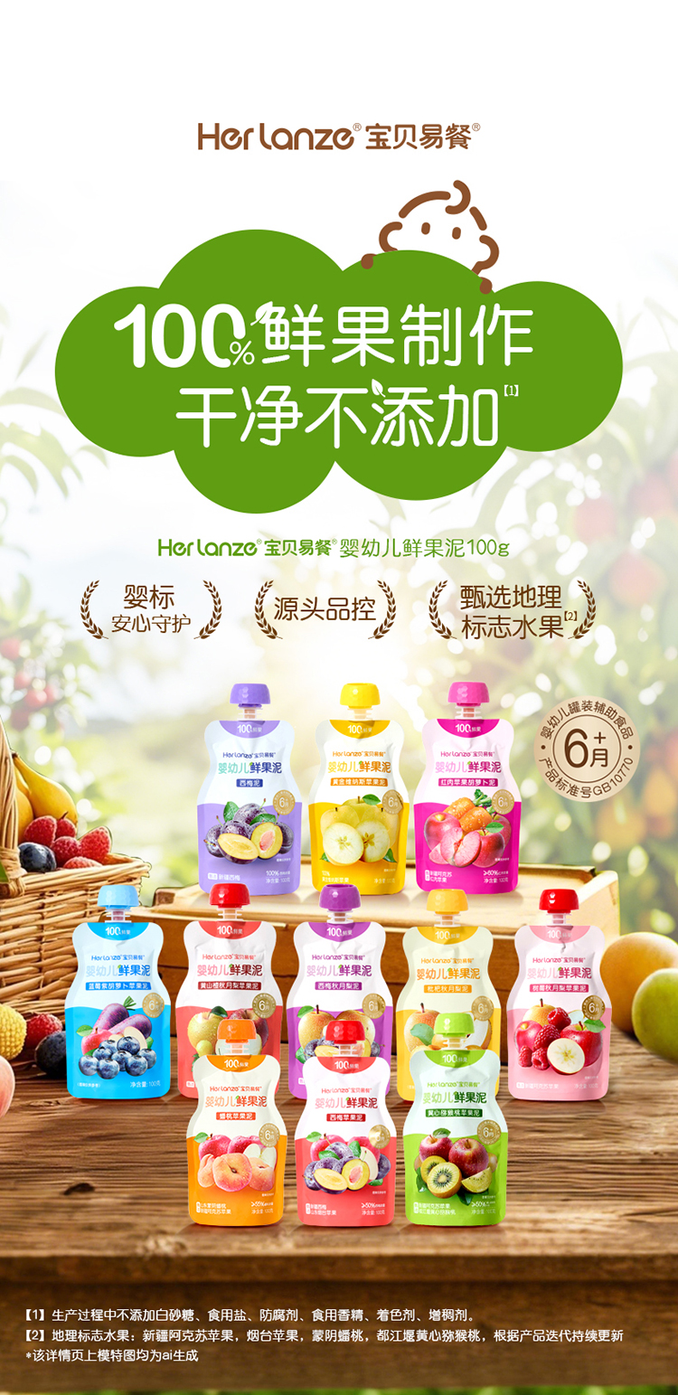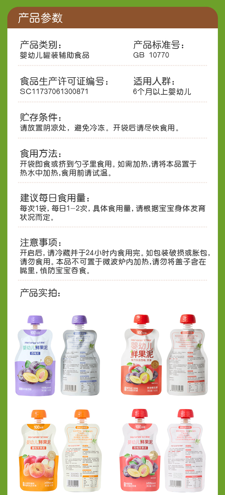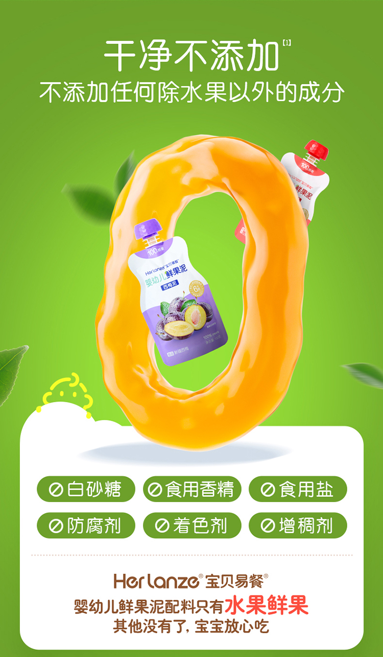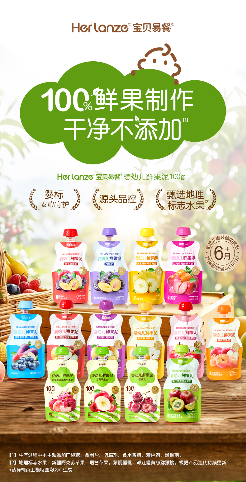 Herlanze宝贝易餐婴幼儿鲜果泥100g 西梅/苹果/蓝苺/蟠桃 多款可选
