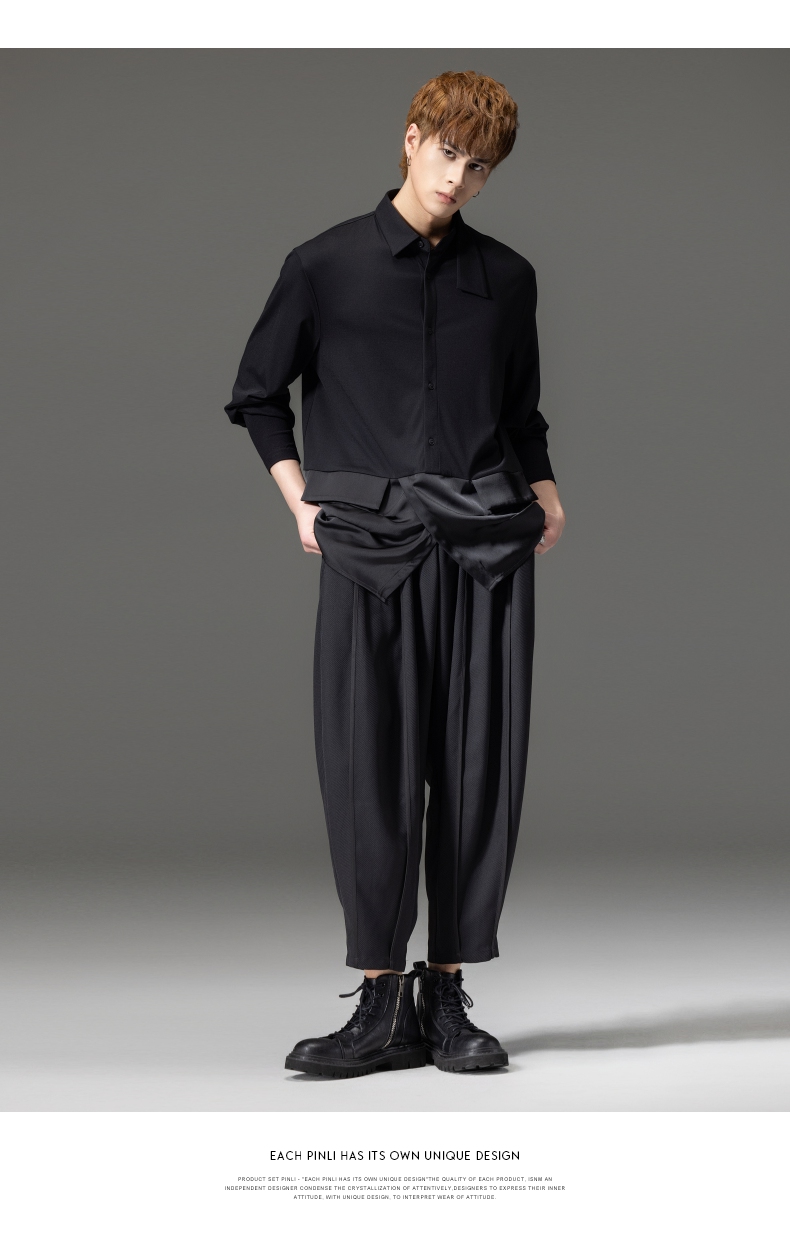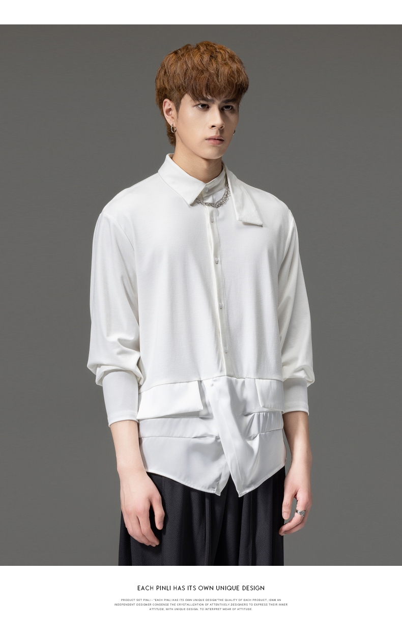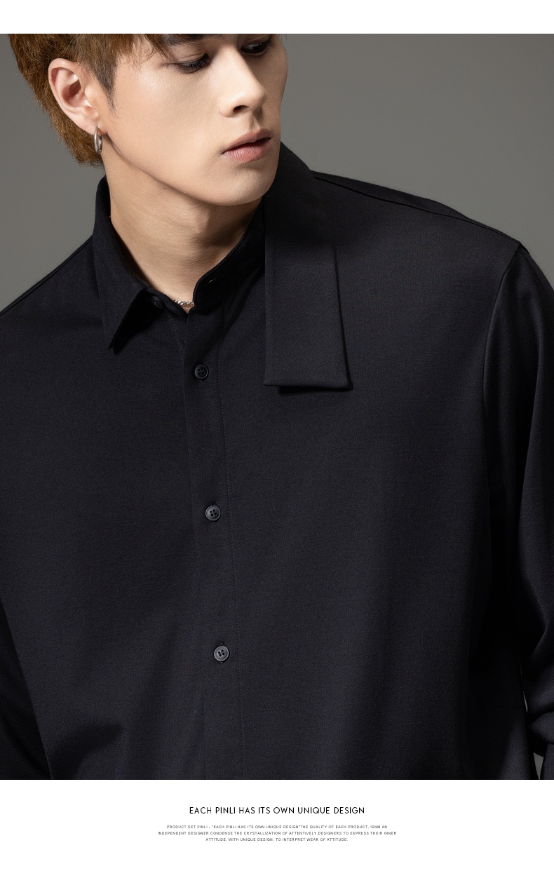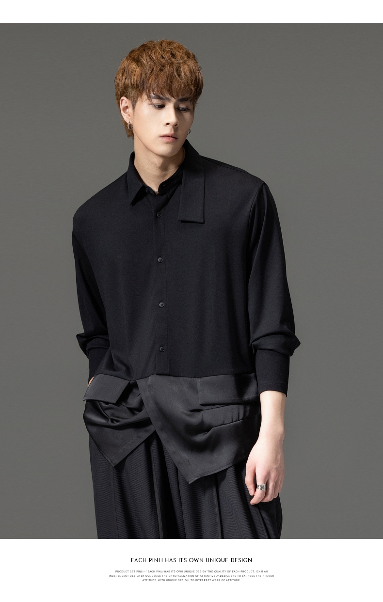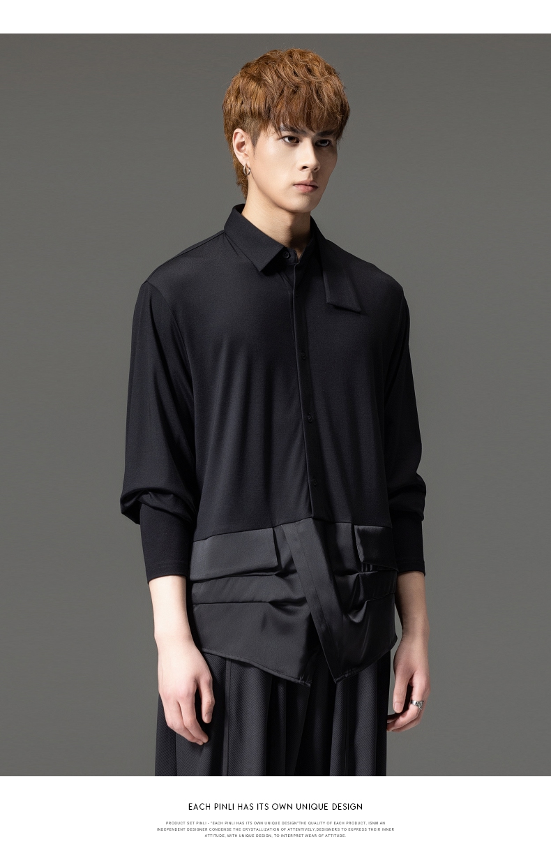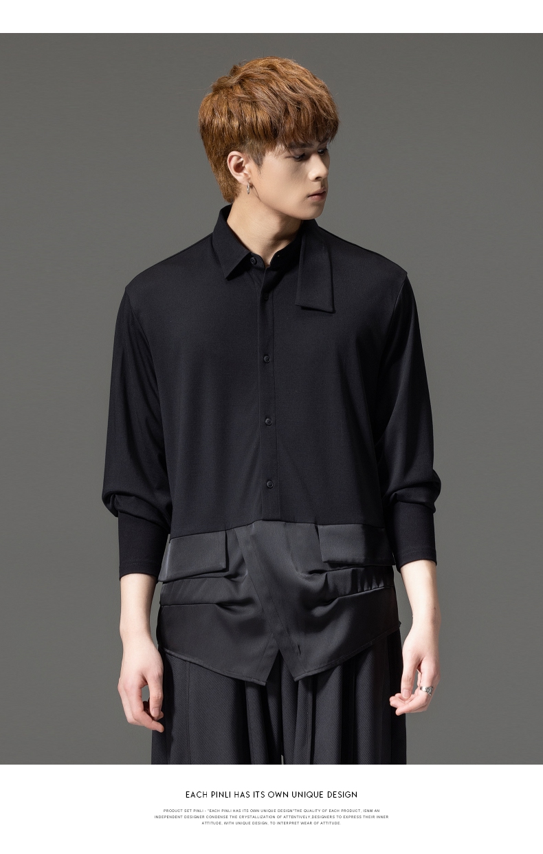 PINLI品立裁魂秋季新品尖领纯色长袖衬衫拼接休闲潮牌男衬衣BC233113005