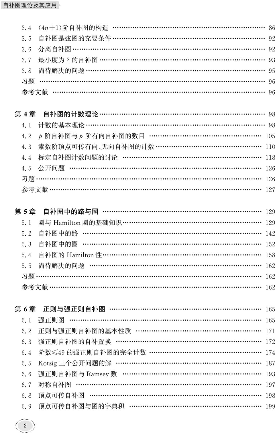 本书第1版出版于1999年,是我国,也是国际上第一部关于“自补图理论及其应用”的学术专著。20多年来,自补图理论及其应用方面的研究一直有新的结果出现。本次修订增加了自补图理论方面新出现的研究成果,更新了文献资料,并订正了第1版的一些疏漏。全书共9章,系统地研究了自补图的基本性质与基本理论,涉及自补图的基本性质、自补图与有向自补图的计数、自补图的分解与构造技术、自补图中的路与圈、正则与强正则自补图理论、2重自补图理论、偶自补图理论、自补度序列图理论。在应用方面,探讨了强正则自补图在对角线型的Ramsey数问题研究上的应用,还讨论了自补图在图与其补图色多项式研究中的应用。