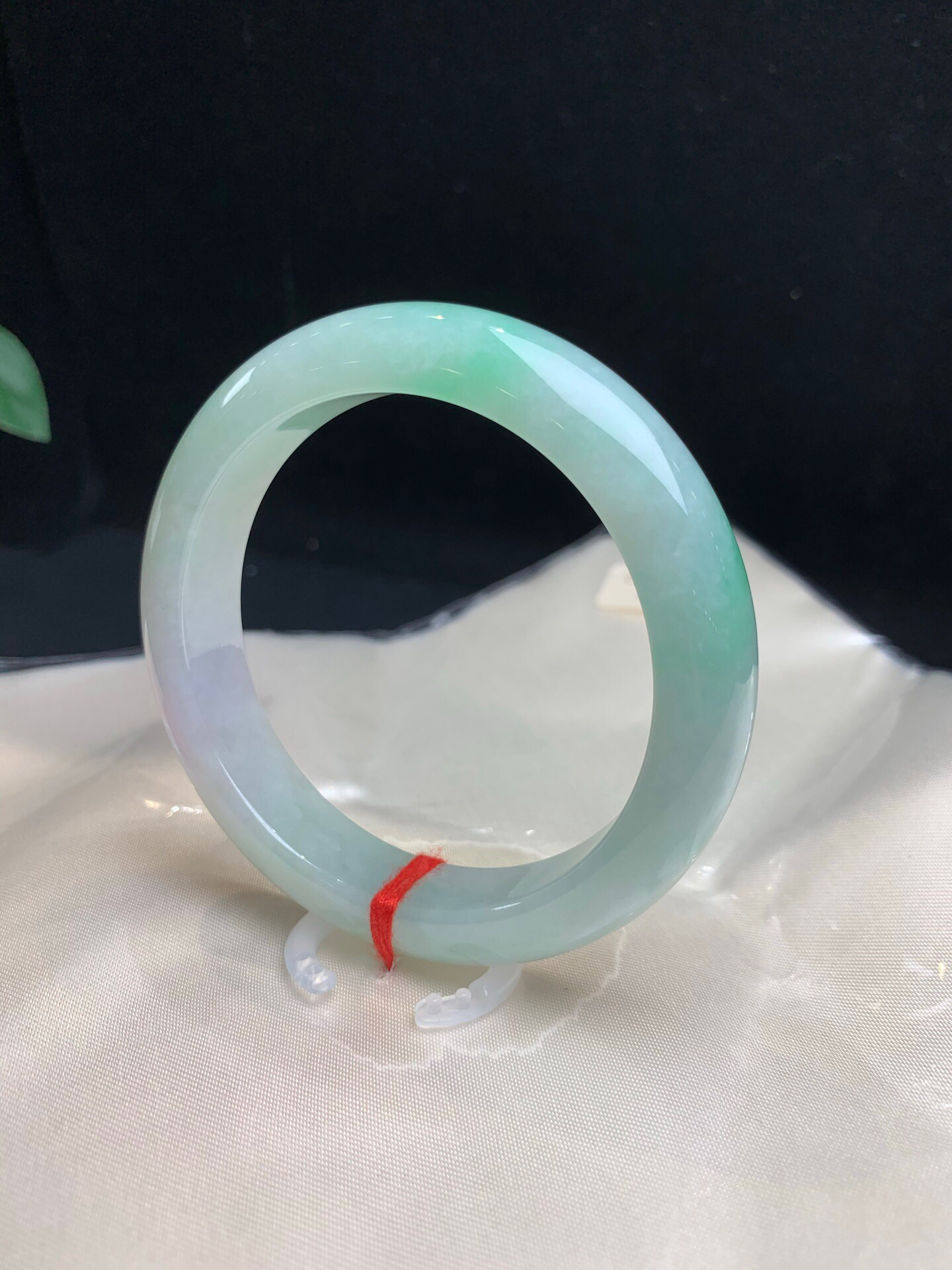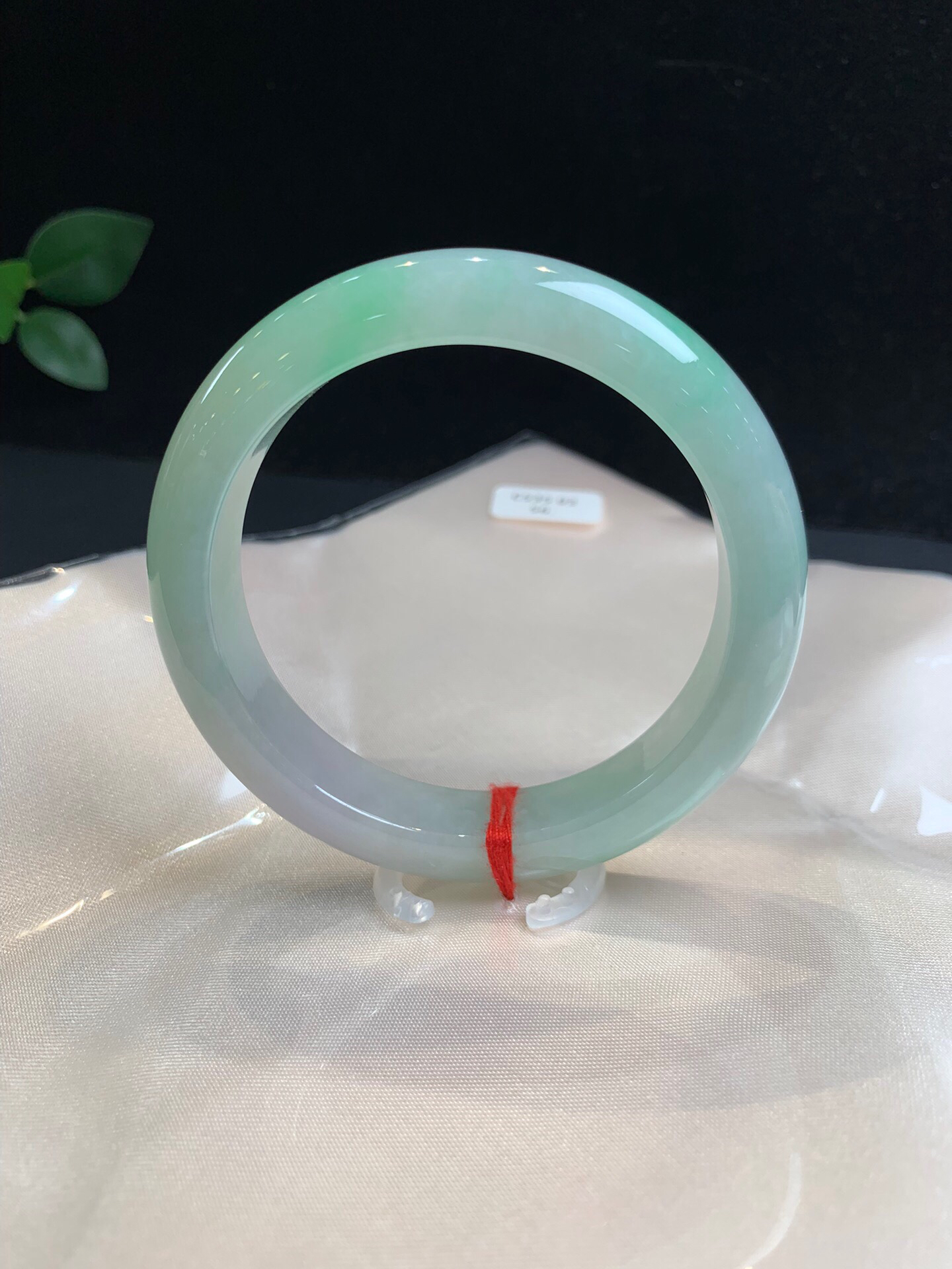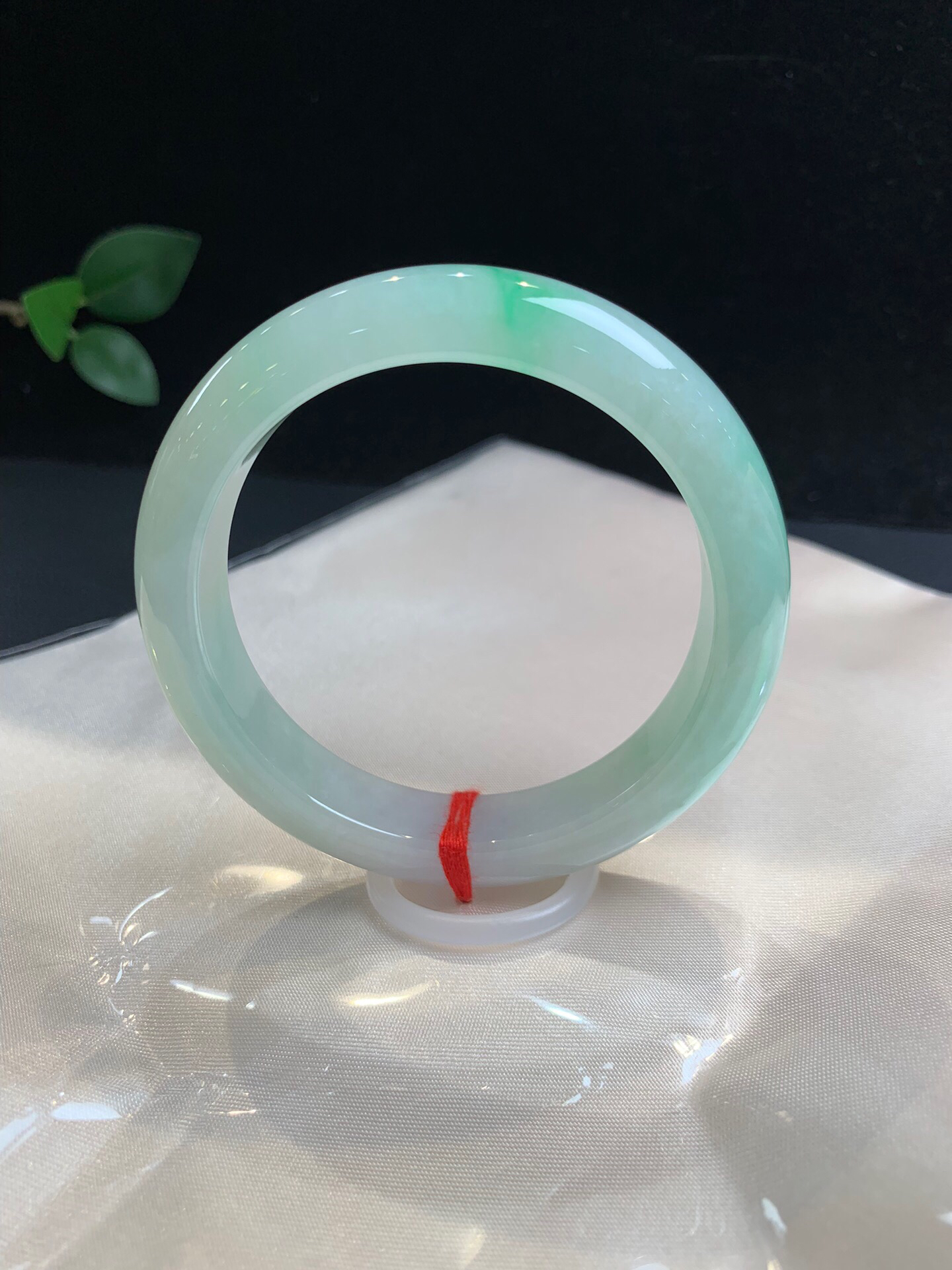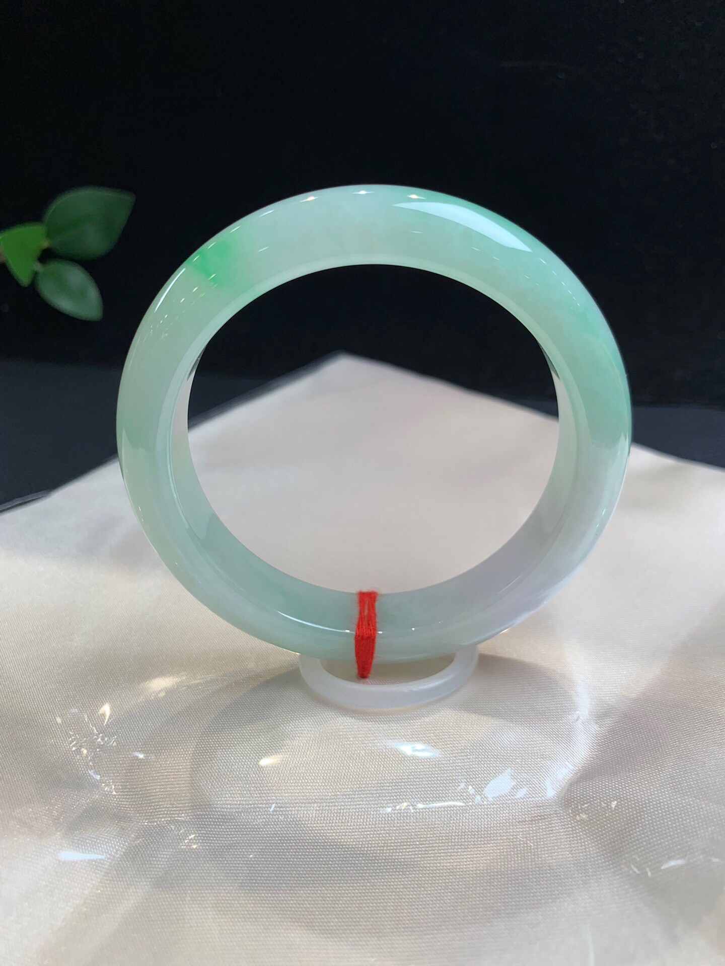 612496,56.5糯冰飘绿手镯 ,12.7-8mm,淡淡的果绿底,飘清新绿色,整体均匀干净,完美秀气 。超值价💰51600 #优石客珠宝#香玉荟萃