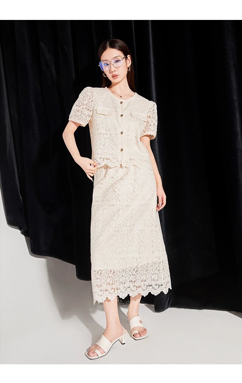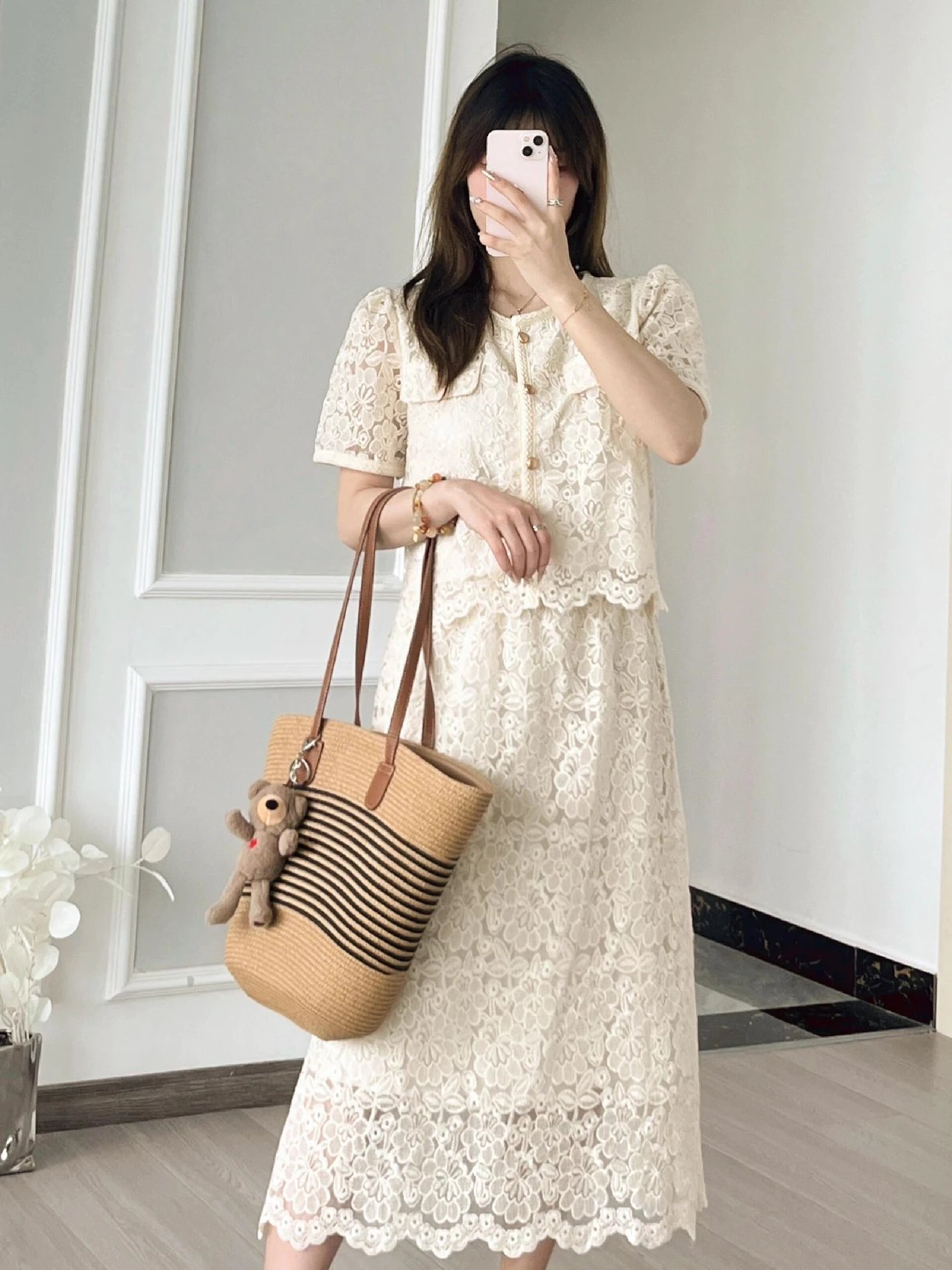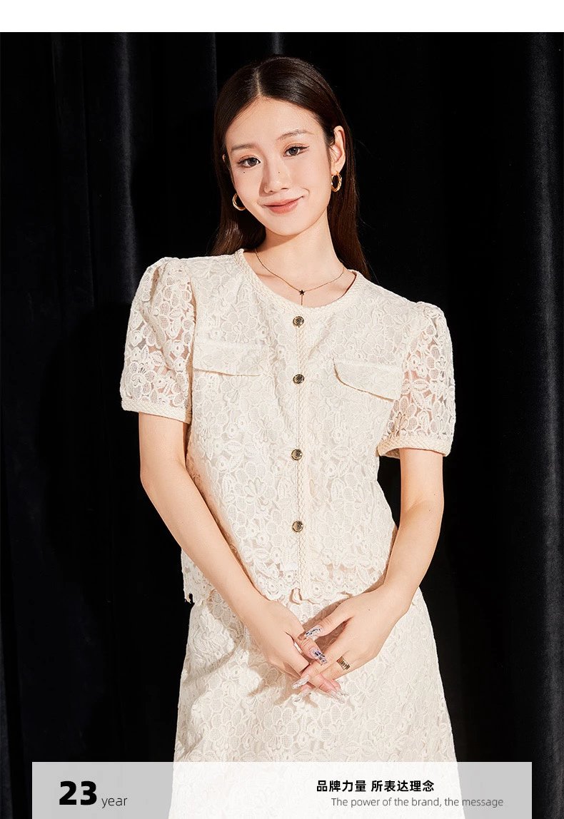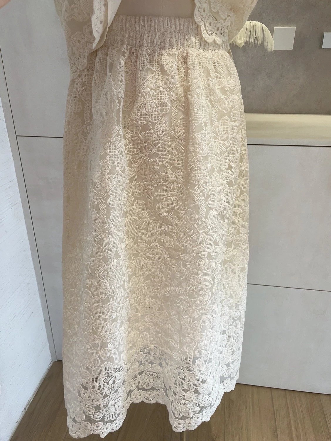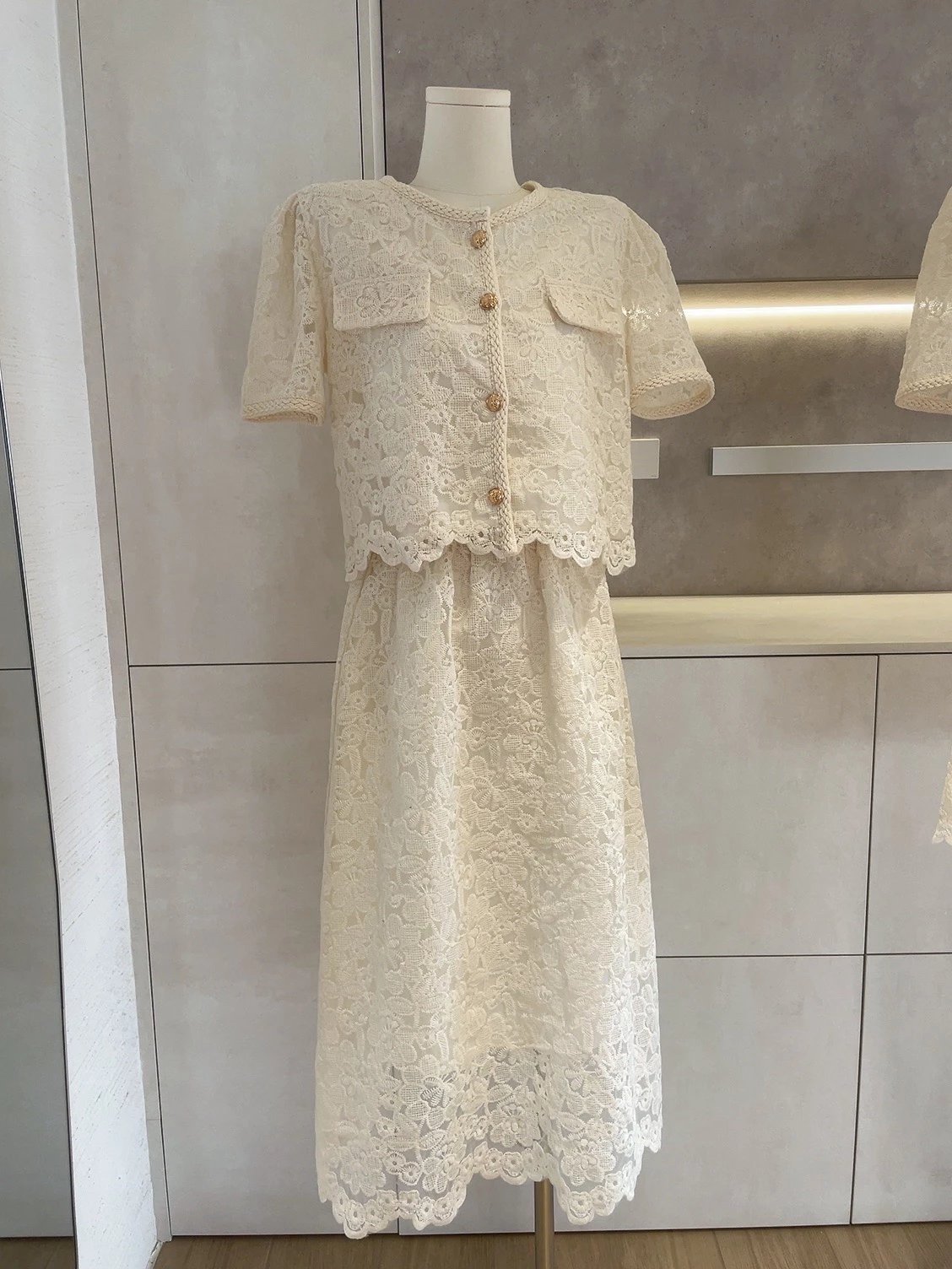 ✅圆领排扣蕾丝小衫+松紧腰A字蕾丝半裙