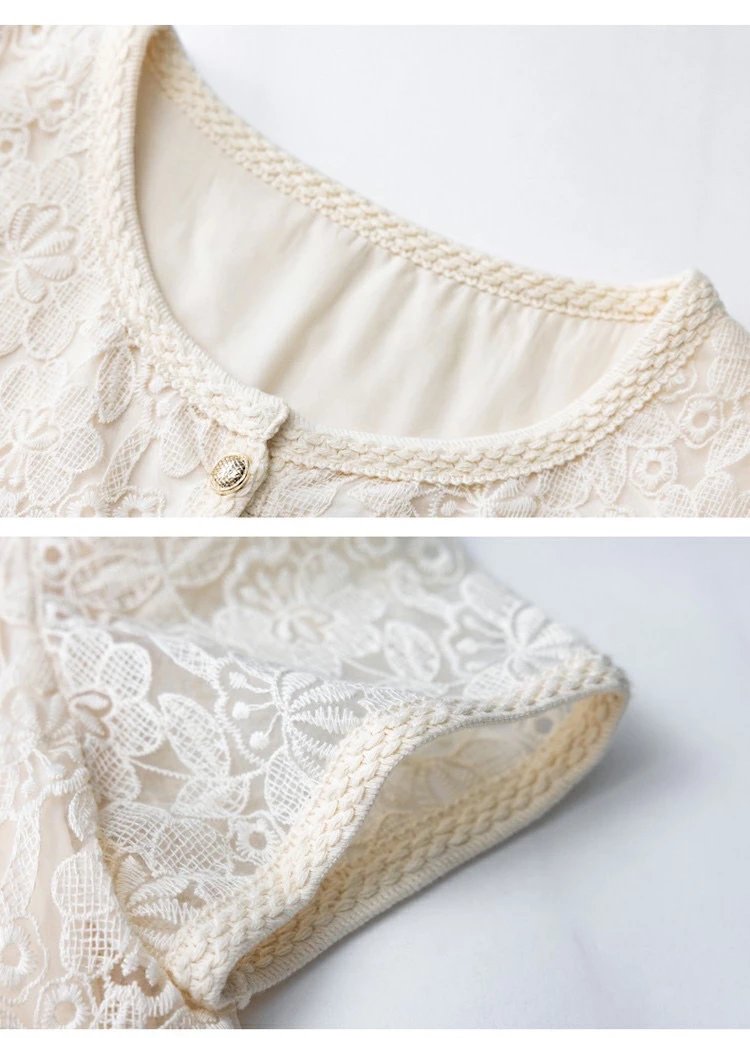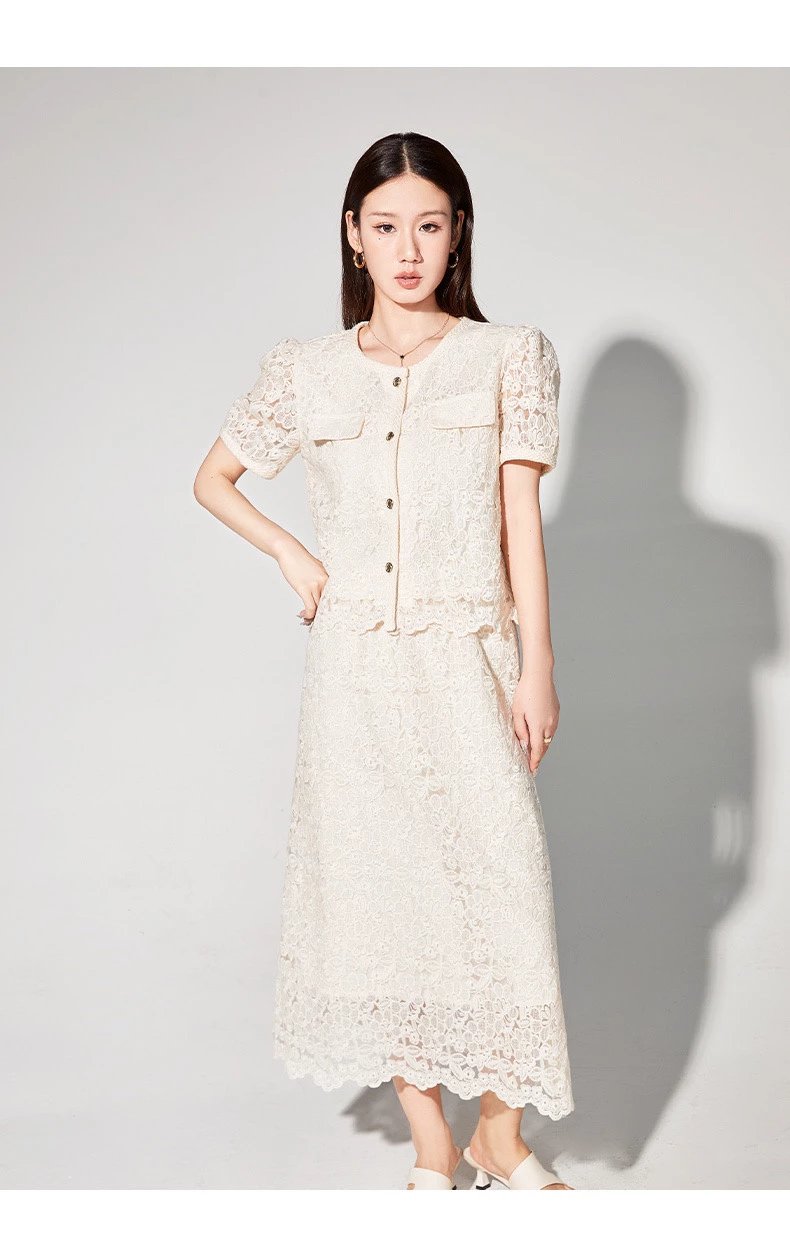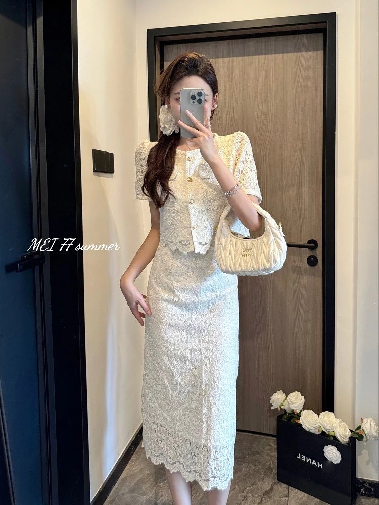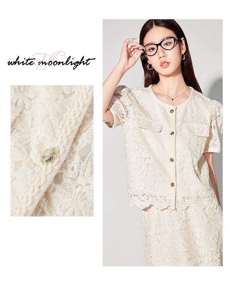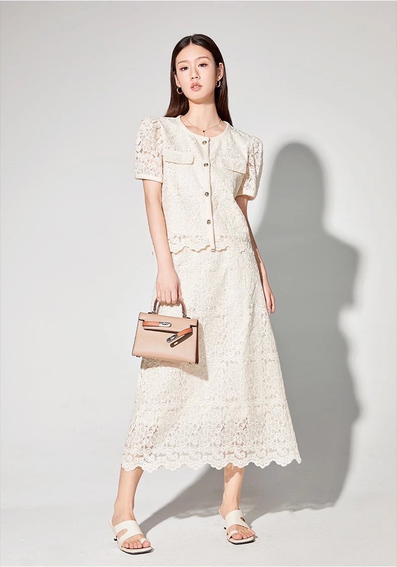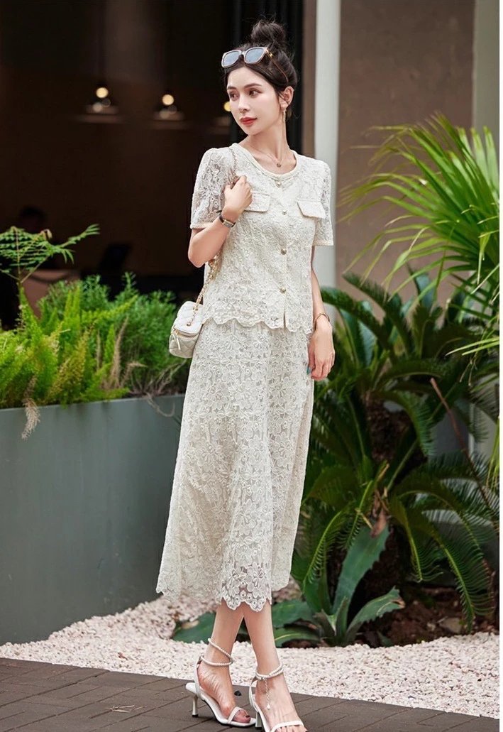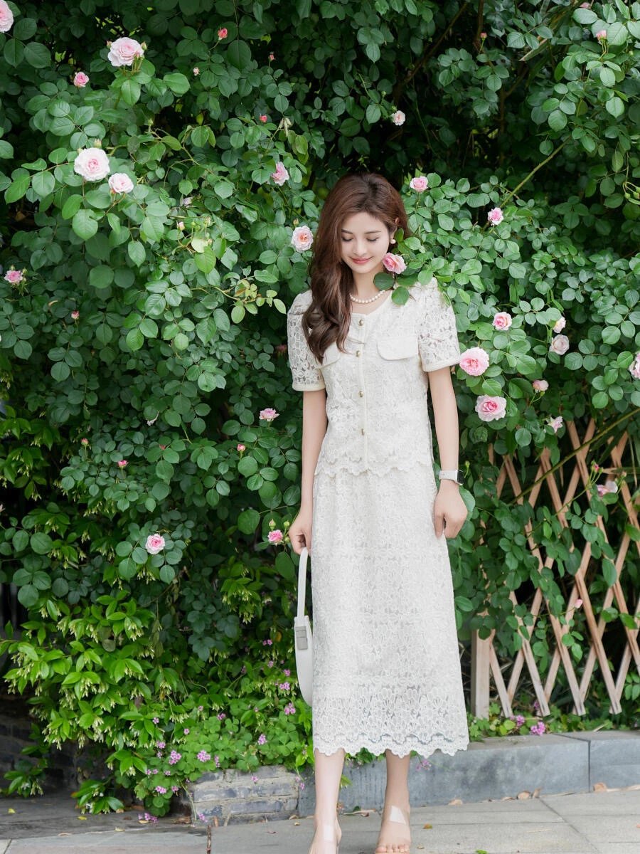 ✅圆领排扣蕾丝小衫+松紧腰A字蕾丝半裙