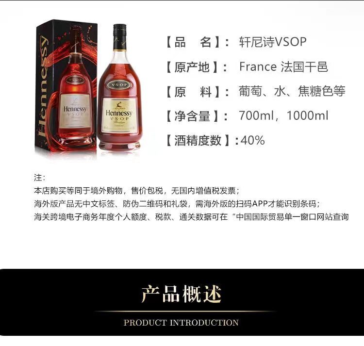 轩尼诗 Hennessy·VSOP 干邑白兰地 40度 350ml/700ml/1000ml 法国原装进口洋酒 送礼 自饮 商务宴请