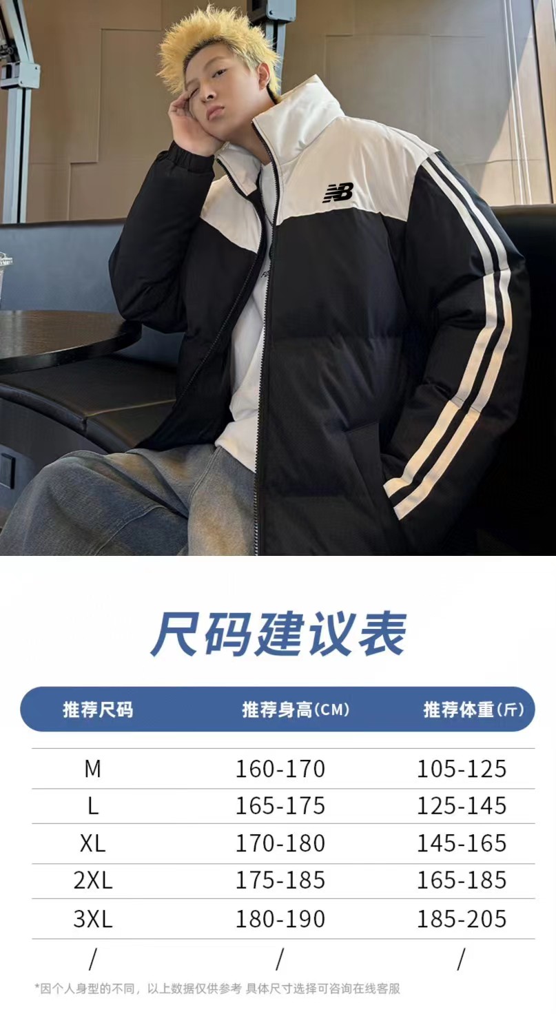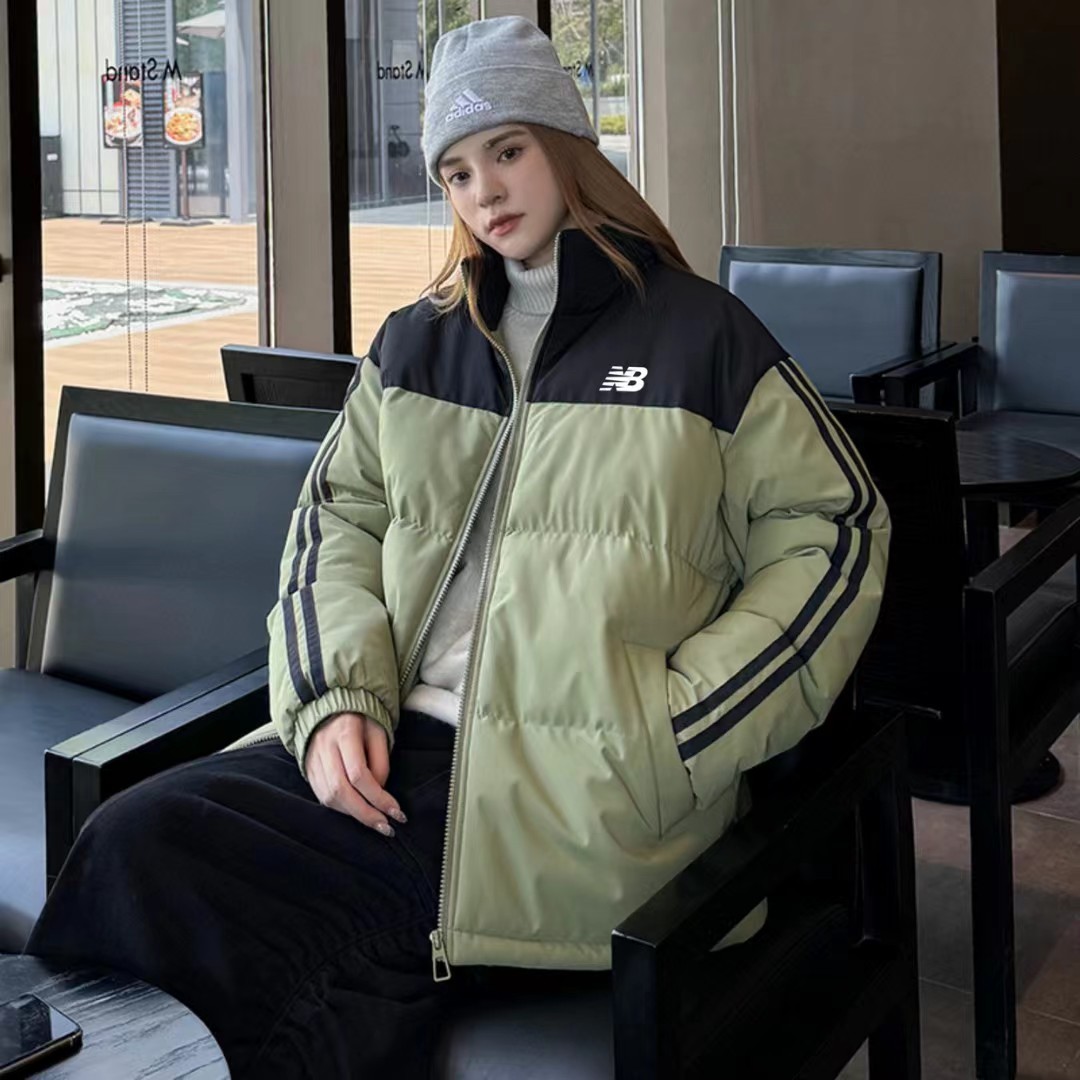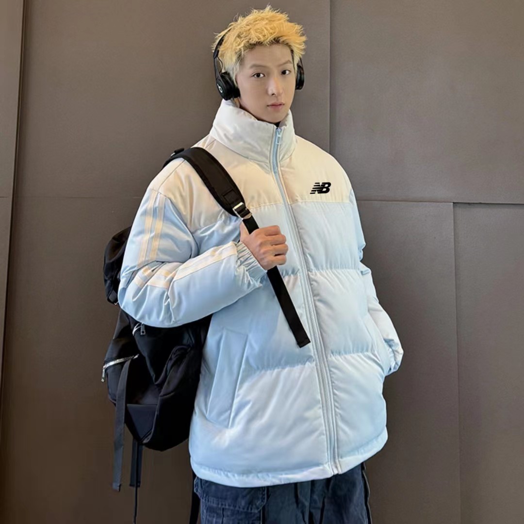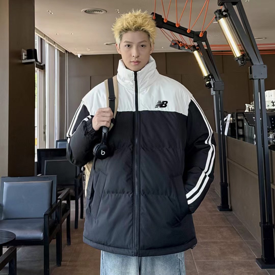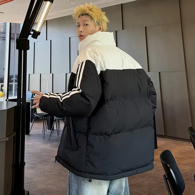 冬季新款双色拼接立领羽绒棉服面包服棉衣外套,男女同款。整件衣服采用拼色工艺,手臂处条纹拼接,简约又不简单,四种百搭色调,内里人工手塞高克重羽绒棉,保暖锁温,美式oversize宽松版型,男生女生都可以穿无压力上身,搭配情侣装效果更佳。