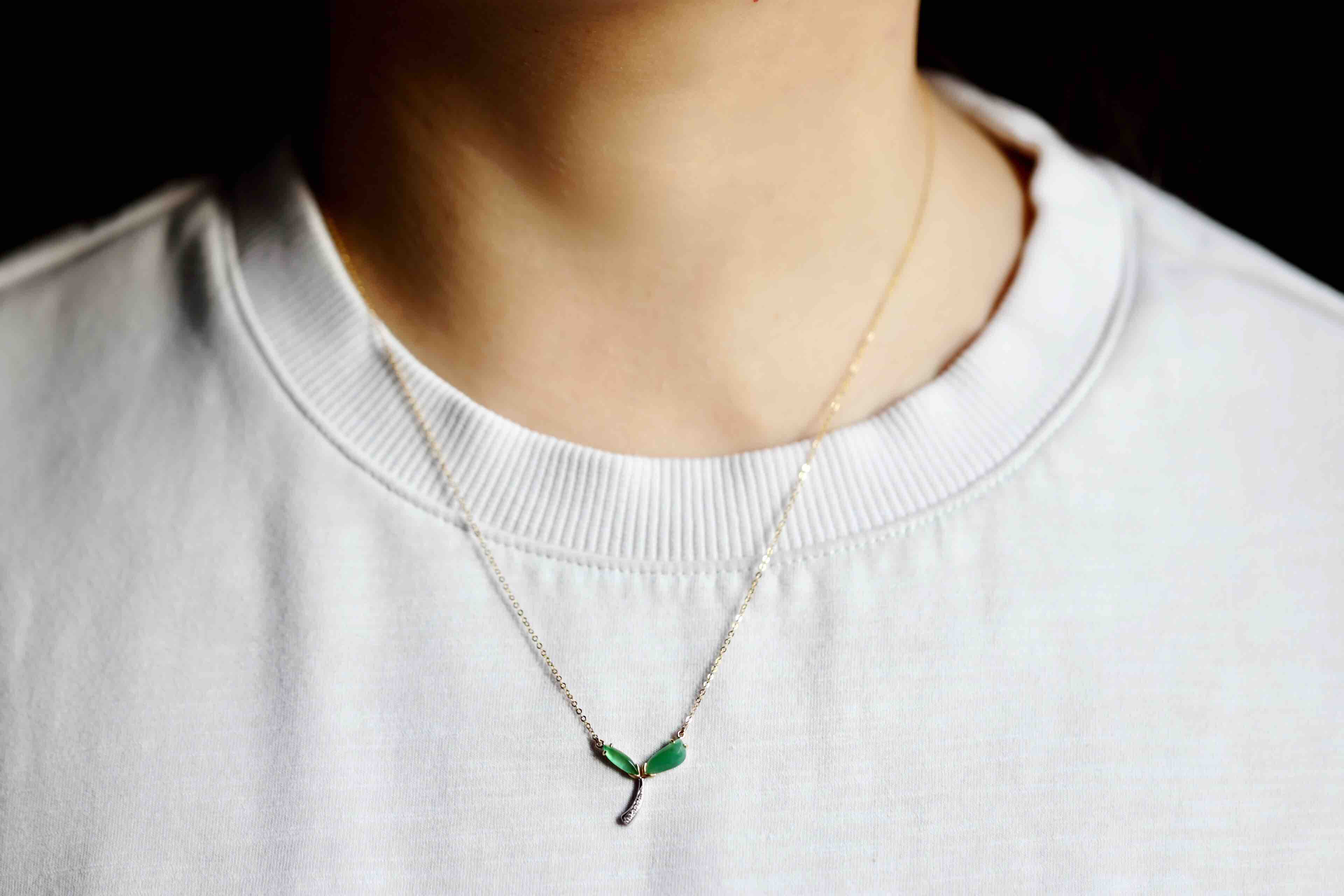 阳绿翡翠萌芽锁骨链,18k黄金白金钻石镶嵌,镶嵌后17.4×16.8×3.4mm,链长40cm加5cm延长链。在这寒冷的冬日,一个生机勃勃的绿芽实在太治愈了,珠宝的设计除了款式本身,还有配石,同样是翡翠,不同种水颜色的搭配,做出萌芽小草明暗立体的质感,是不是比单一种水的做法更特别