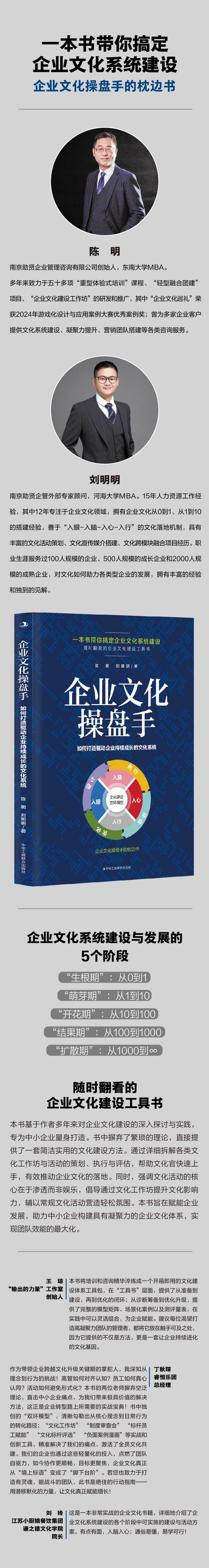 本书基于作者多年来对企业文化建设的深入探讨与实践,专为中小企业量身打造。书中摒弃了繁琐的理论,直接提供了一套简洁实用的文化建设方法。通过详细拆解各类文化工作坊与活动的策划、执行与评估,帮助文化官快速上手,有效推动企业文化的落地。同时,强调文化活动的核心在于渗透而非娱乐,倡导通过文化工作坊提升文化影响力,辅以常规文化活动营造轻松氛围。本书旨在赋能企业发展,助力中小企业构建具有凝聚力的企业文化体系,实现团队效能的最大化。