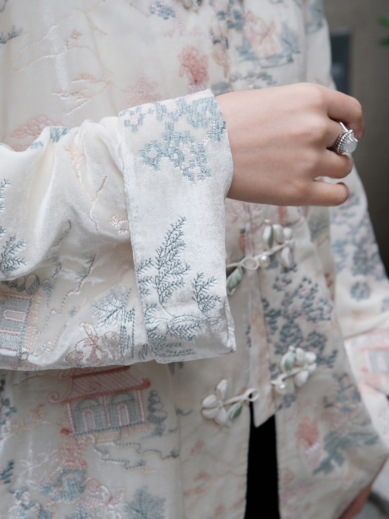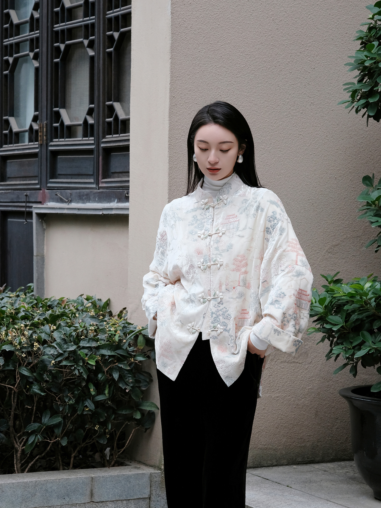 盛唐牡丹| 如意湖亭丝绒花扣外套-白色