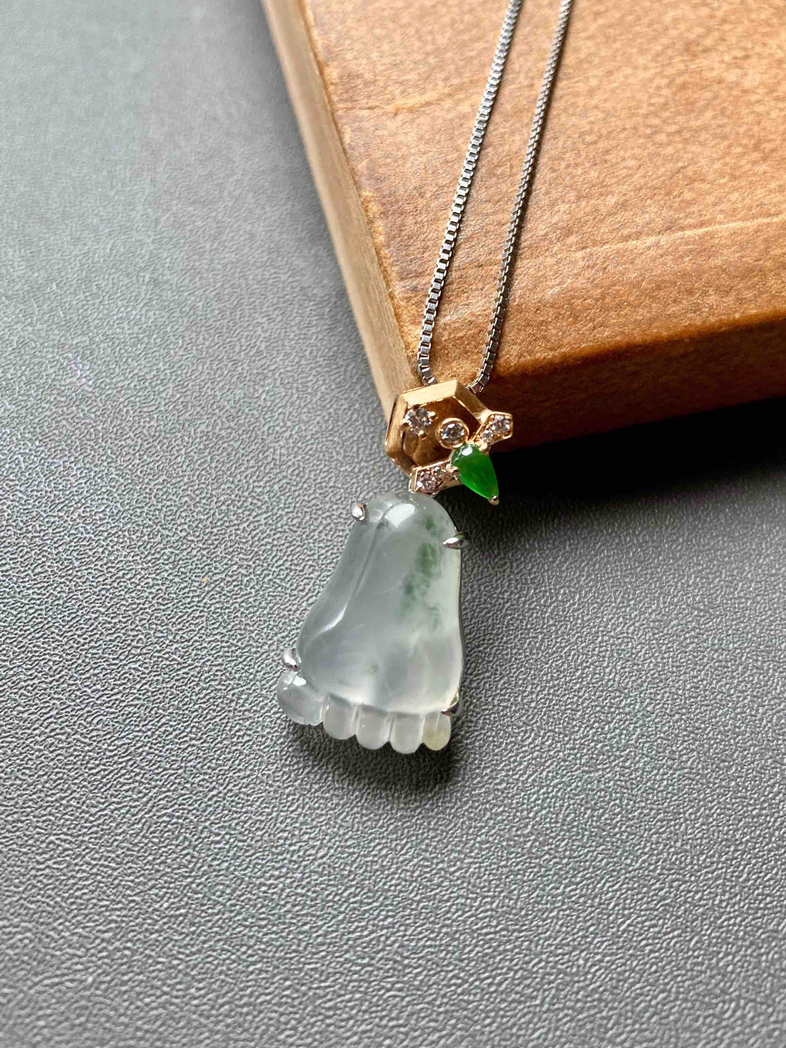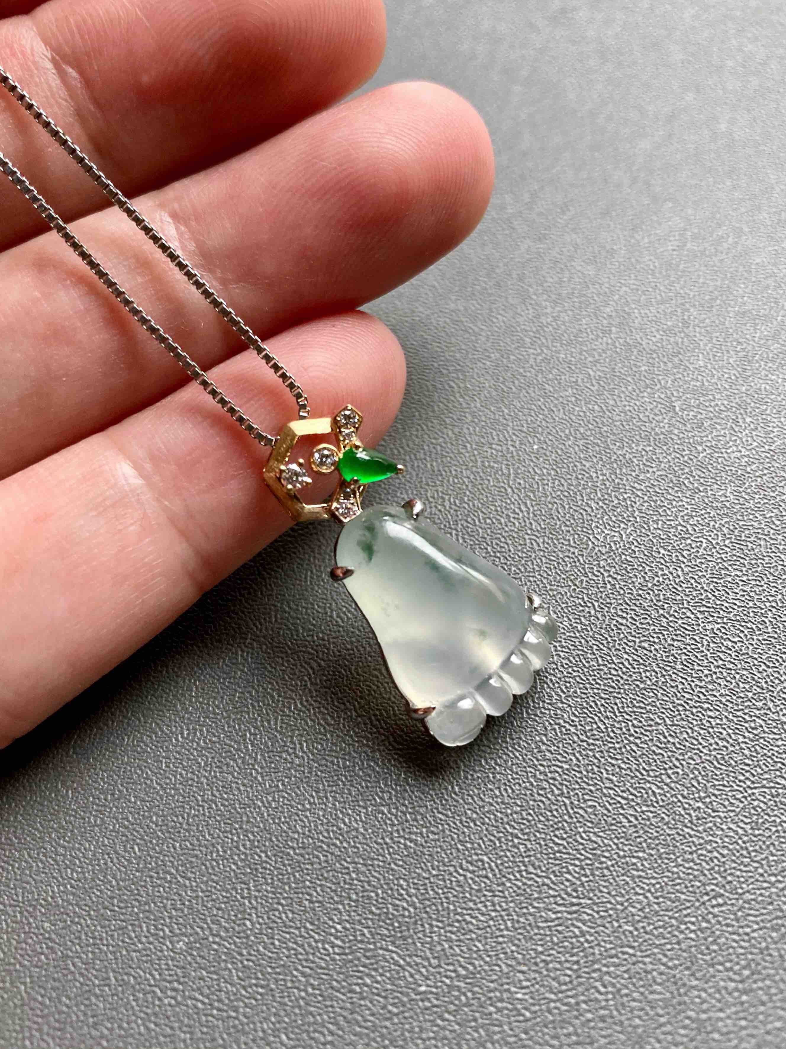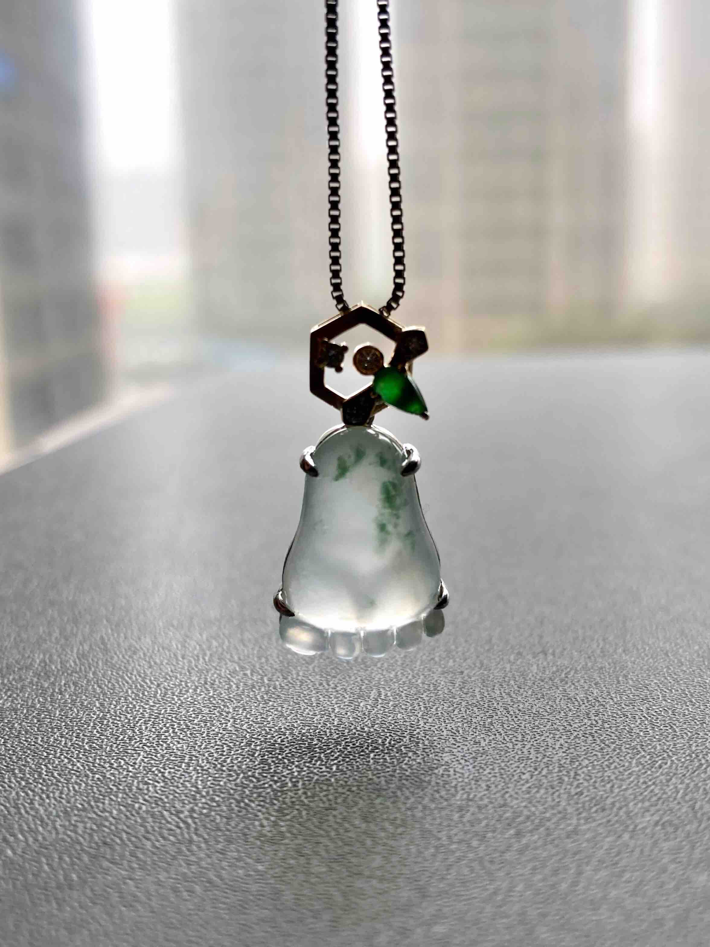 能把时尚和传统结合得如此好的作品不多,翡翠禄来原创设计系列,高冰种飘花纯手工精雕的脚掌,晶莹剔透,荧光四射,寓意知足常乐,高冰种帝王绿翡翠钻石和18k黄金镶嵌小蜜蜂,寓意幸福甜蜜。翡翠17.6×11.3×6mm,镶嵌后26×12.8×6.8mm,一件品质和寓意都非常棒的作品