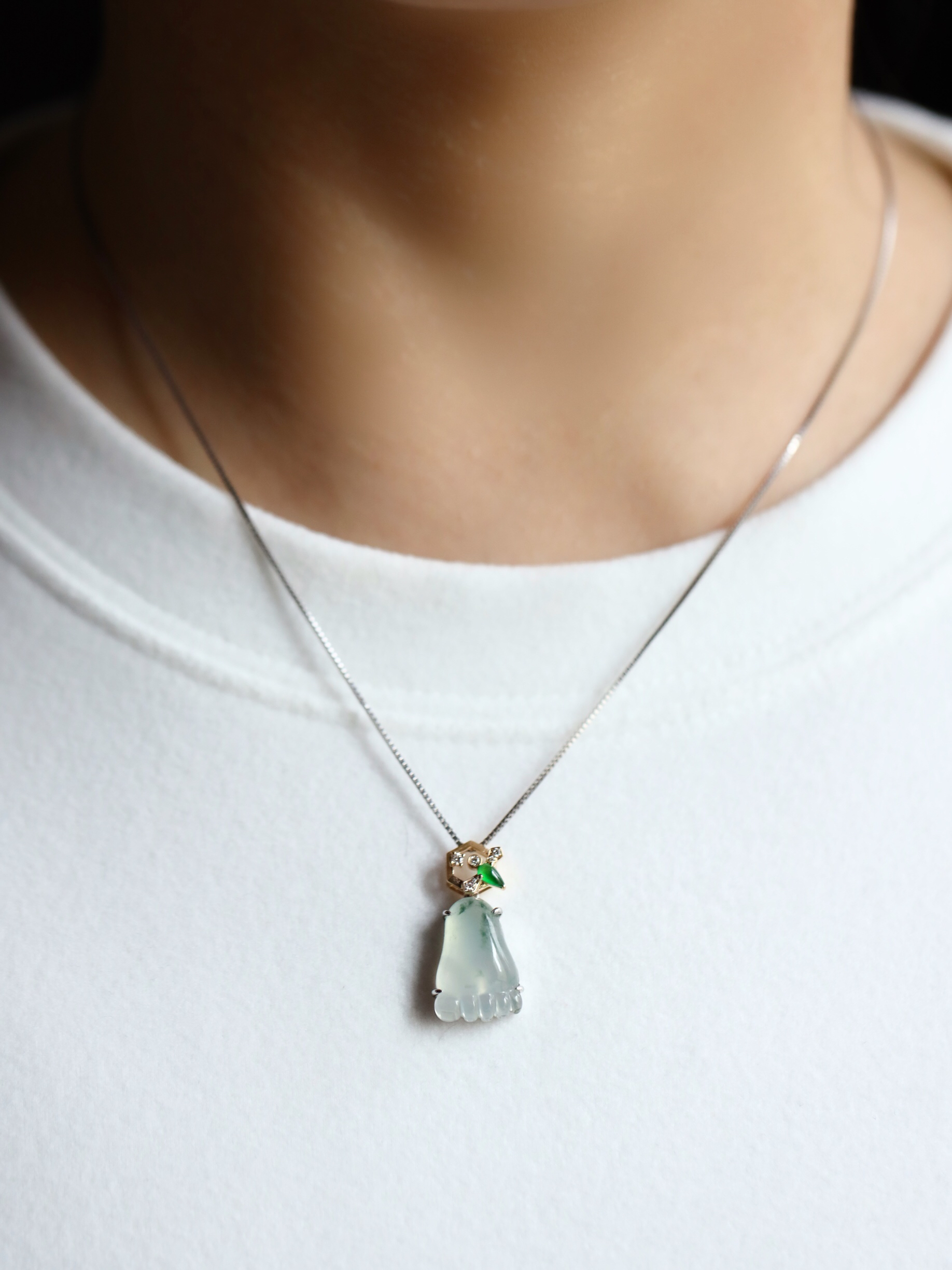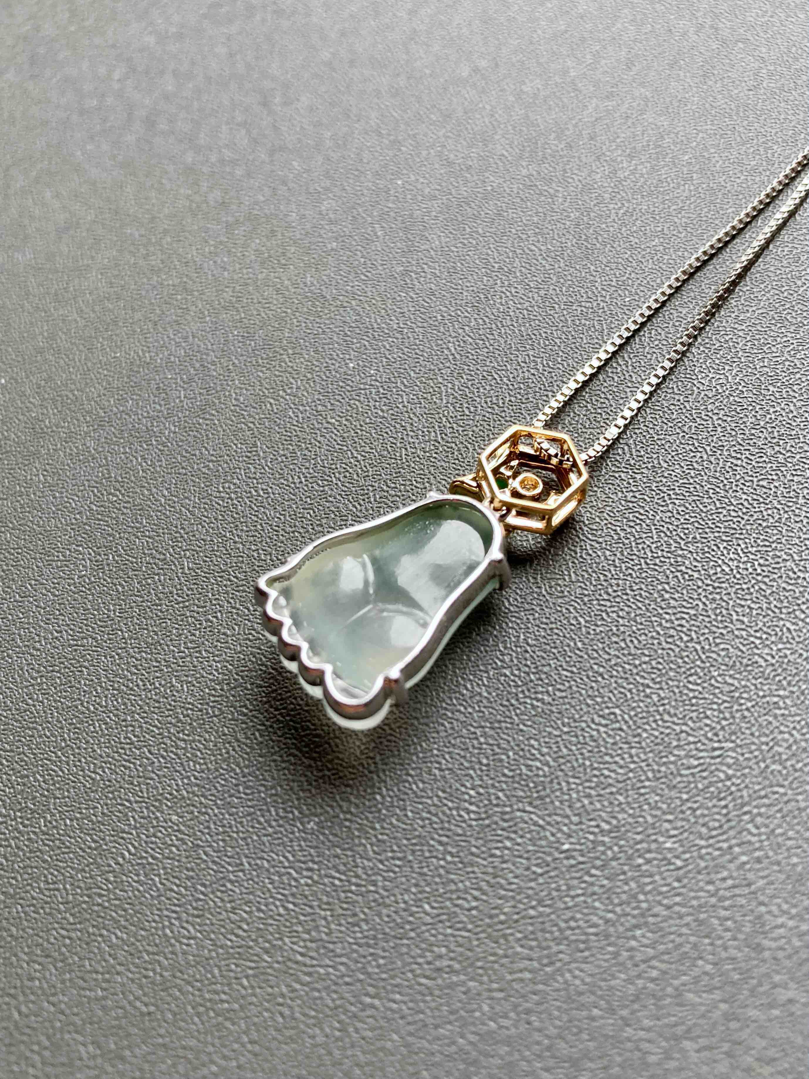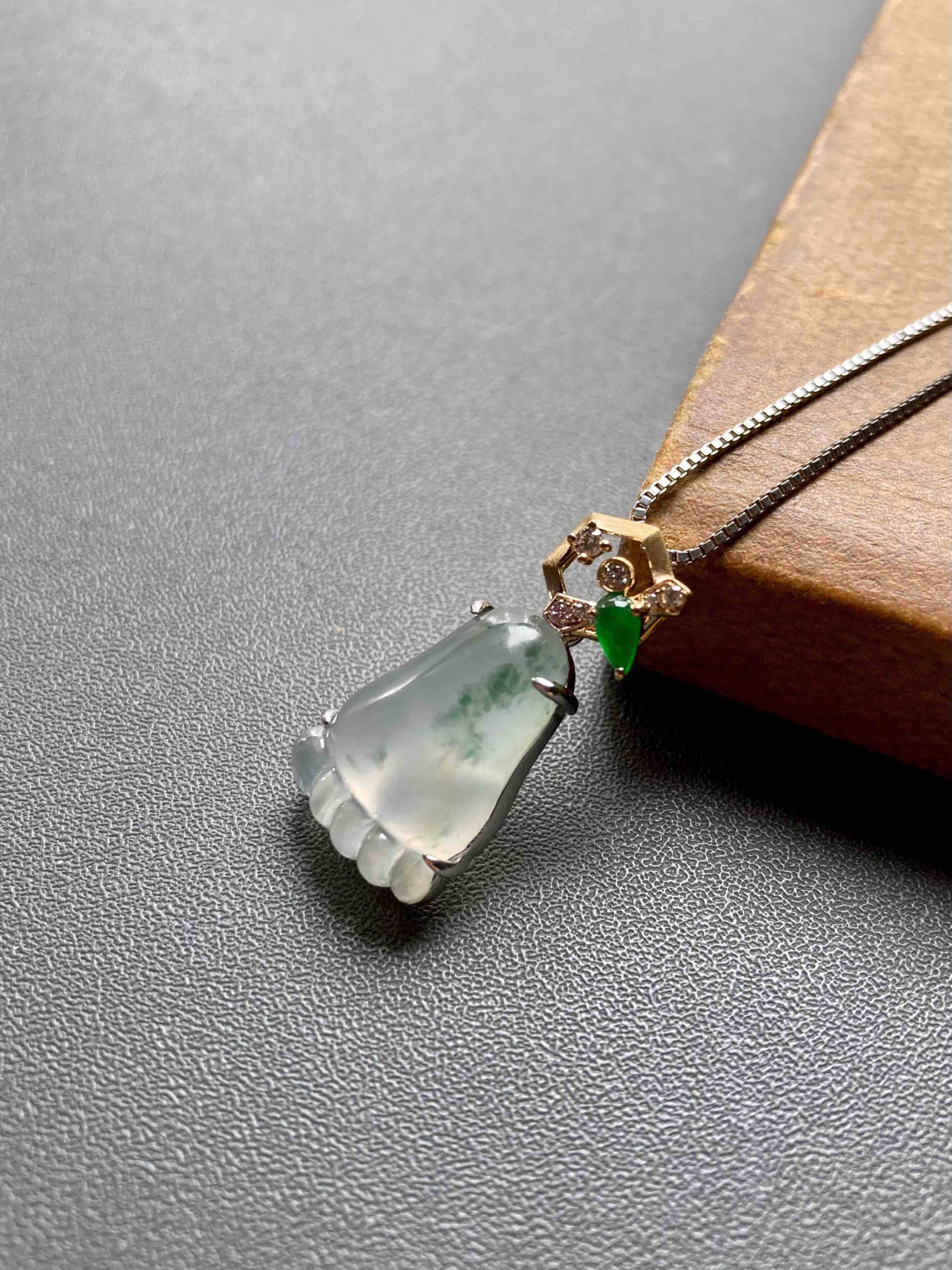 能把时尚和传统结合得如此好的作品不多,翡翠禄来原创设计系列,高冰种飘花纯手工精雕的脚掌,晶莹剔透,荧光四射,寓意知足常乐,高冰种帝王绿翡翠钻石和18k黄金镶嵌小蜜蜂,寓意幸福甜蜜。翡翠17.6×11.3×6mm,镶嵌后26×12.8×6.8mm,一件品质和寓意都非常棒的作品