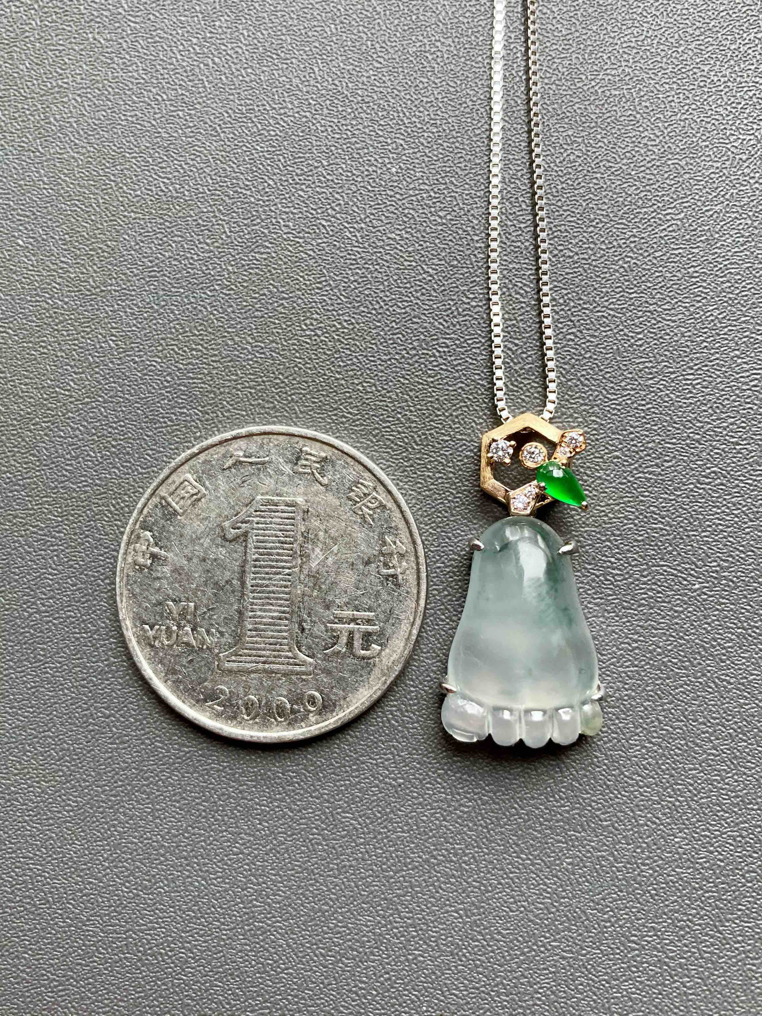 高冰种飘花翡翠知足常乐幸福甜蜜18k白金黄金钻石镶嵌高冰种阳绿翡翠水滴
