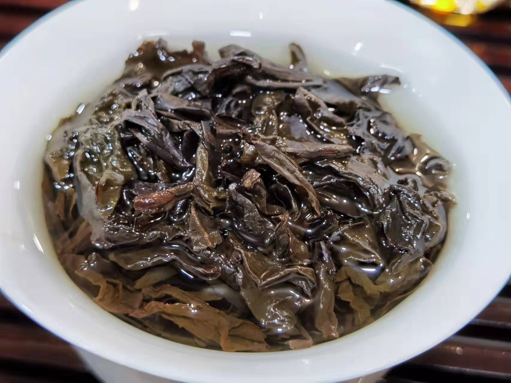 第九道:闷泡后叶张伸展,每一个叶片在做青过程中都有充分的走水,成转黄的角度来看,发酵非常好。