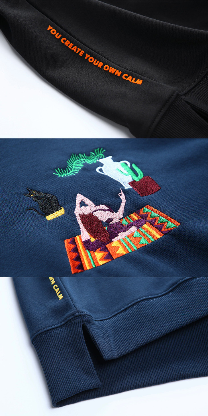 卫衣的侧缝,做了撞色的植绒印花,YOU CREATE YOUR OWN CALM,是我们品牌的slogan。