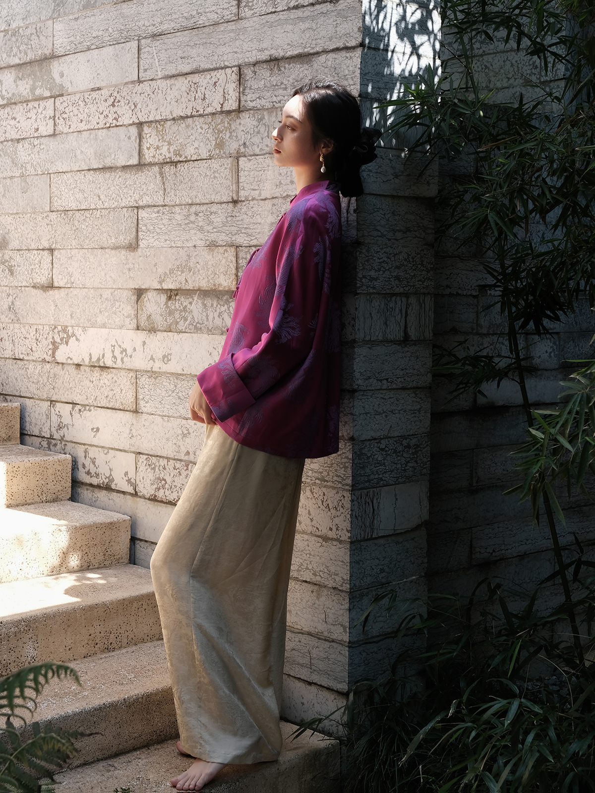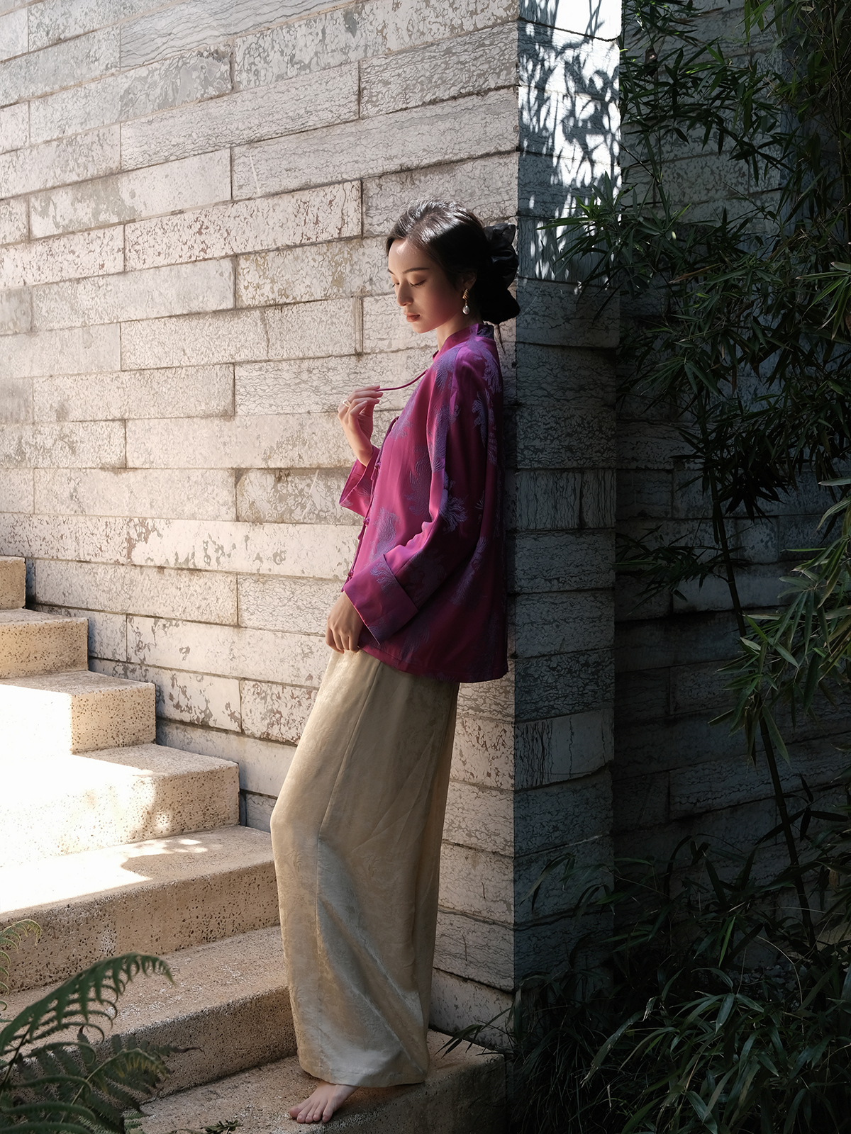 盛唐牡丹 | 粉色蝶恋花/紫色喜鹊缠枝真丝提花褶皱上衣