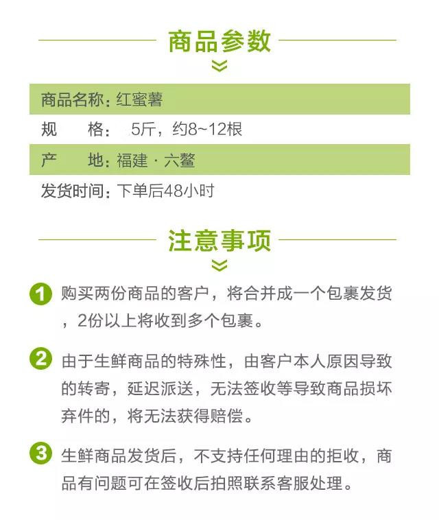 2、红薯是原产地福建发货,路途遥远,磕碰挤压很正常,坏果包赔。签收24小时之内,坏果和快递单号放在一起拍照发送至公众号,按个赔付哟!不要拒签!拒签不理赔。