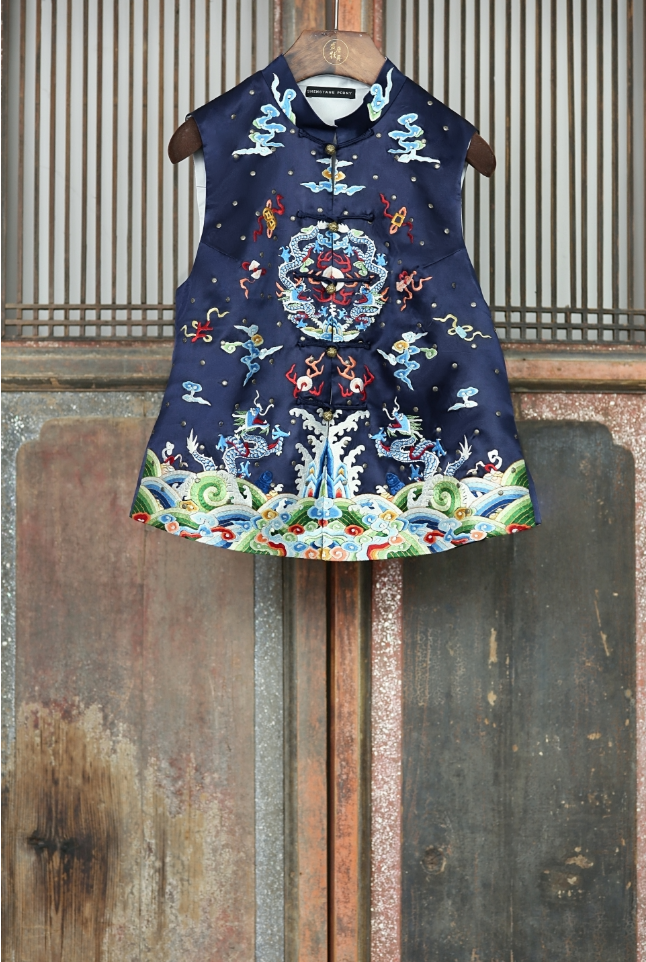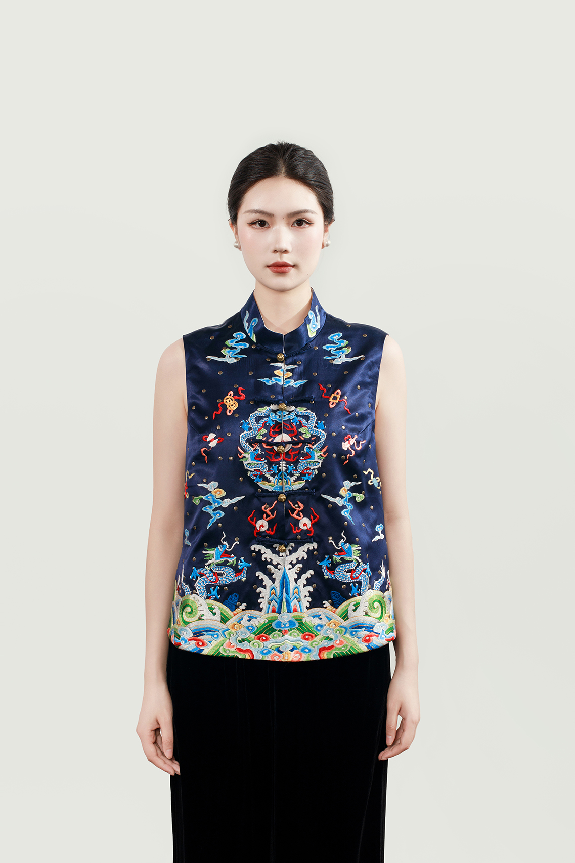 盛唐牡丹大师系列 | 石青色真丝手绣铆钉戎装坎肩 (盛唐牡丹与非遗传承人王小潇联名系列)