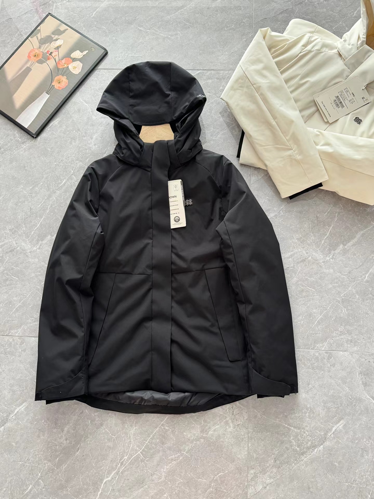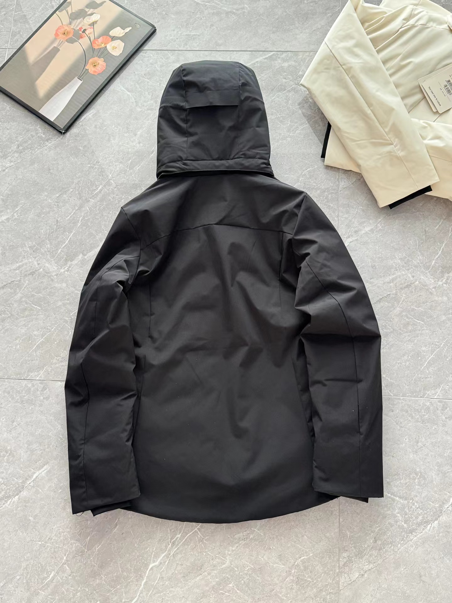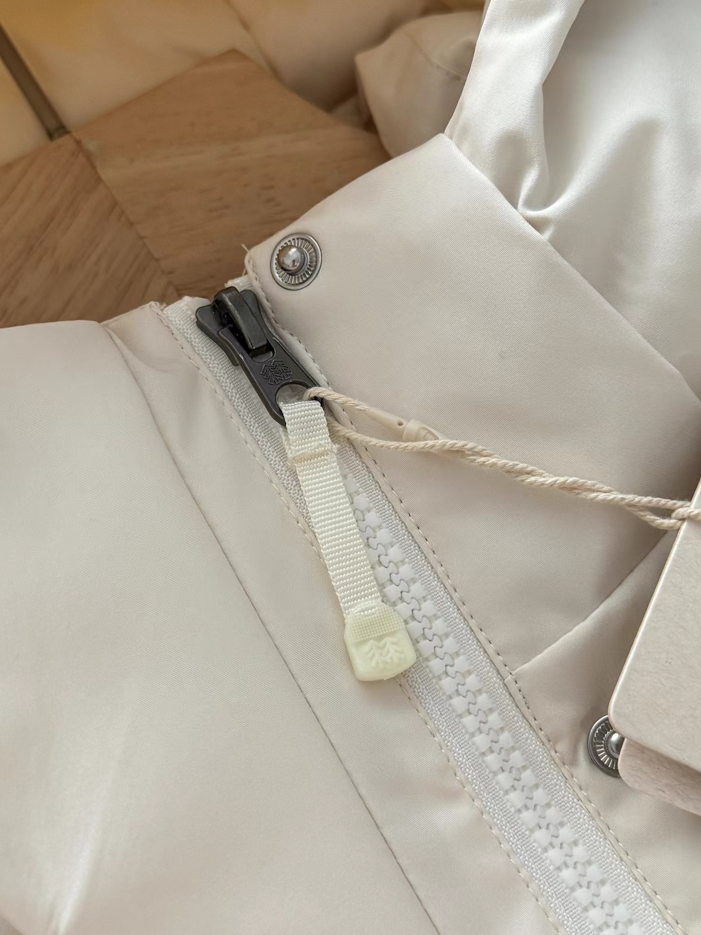 连帽设计,帽子可拆!拉链门襟+外置风裆,风裆高温压胶处理,平整不臃肿!两侧口袋磁扣吸扣+拉链开合,双重防护,使用方便,储物安全!胸前立体金属标识,简洁有辨识度!双向开合的YKK进口拉链,拉头和拉手上全部都有立体标识,全身所有的辅料,调节扣都是品牌原装的,标识齐全,耐用耐磨损!!外层面料:是科技防护工艺的,哑光雾面质地,高密定织,防水防污、防钻绒,工艺很足是那种柔软又不失筋骨的面料,没有硬感,大身具有很好的防泼水效果,日常雨雪天不用担心。