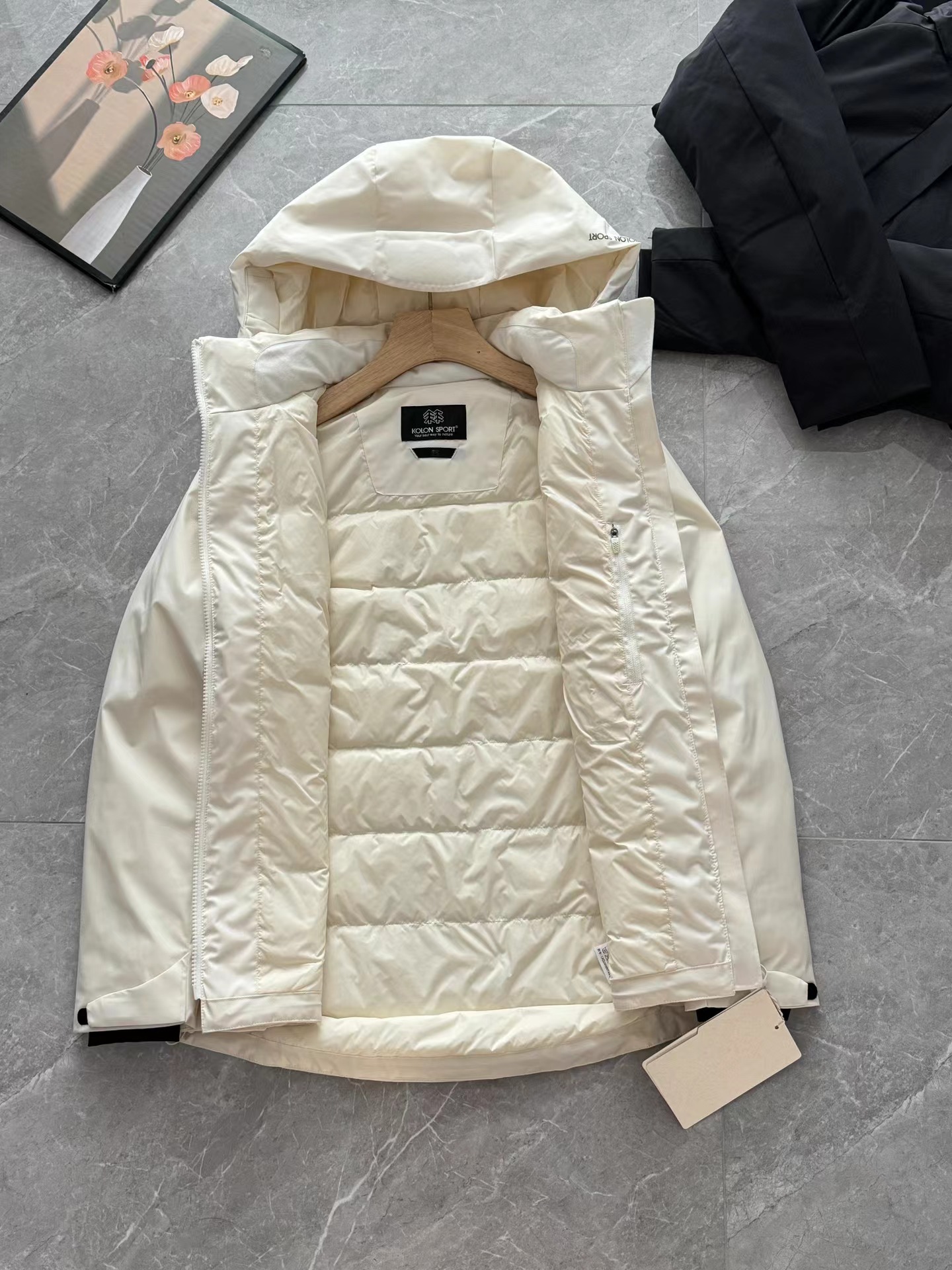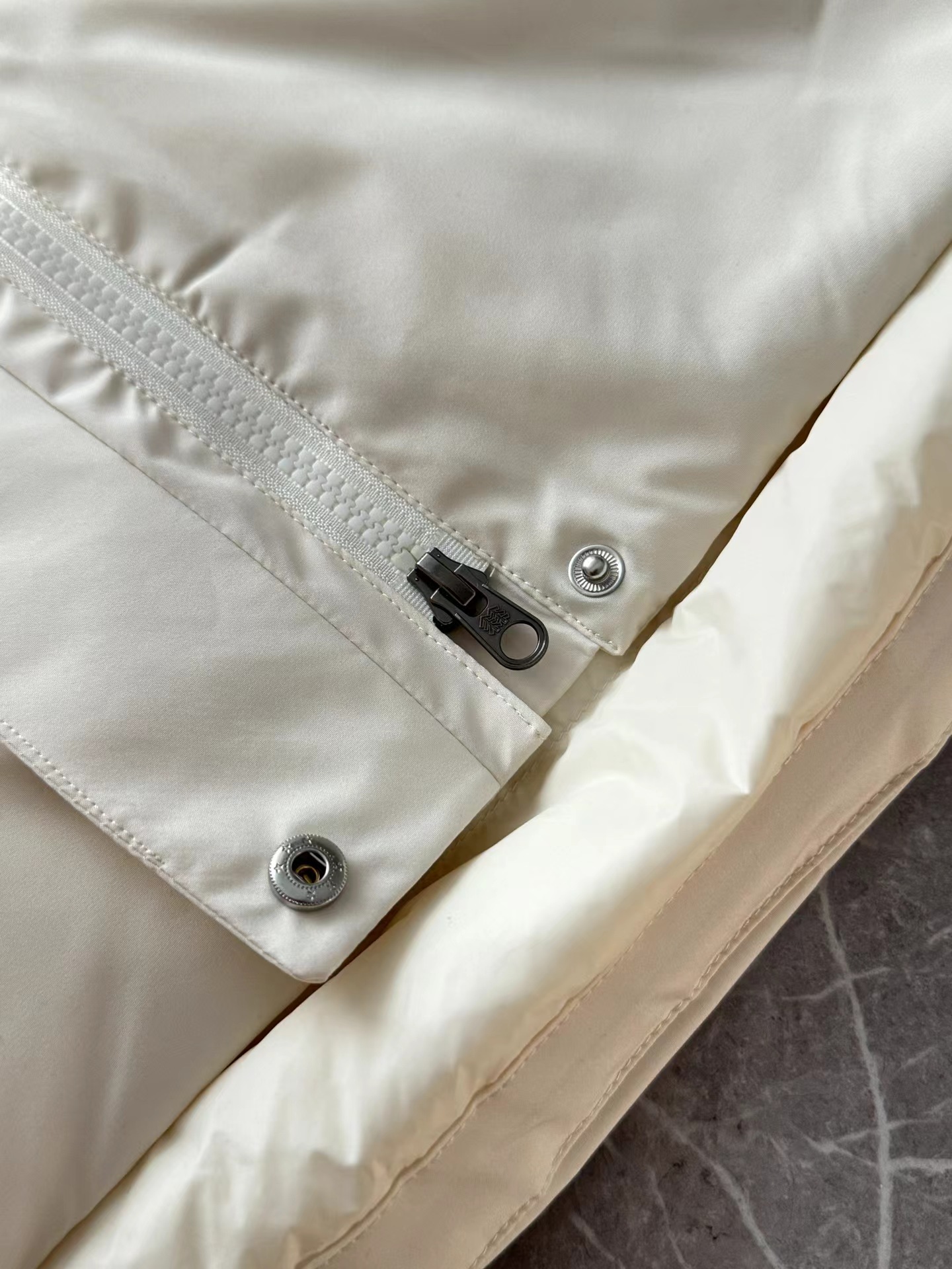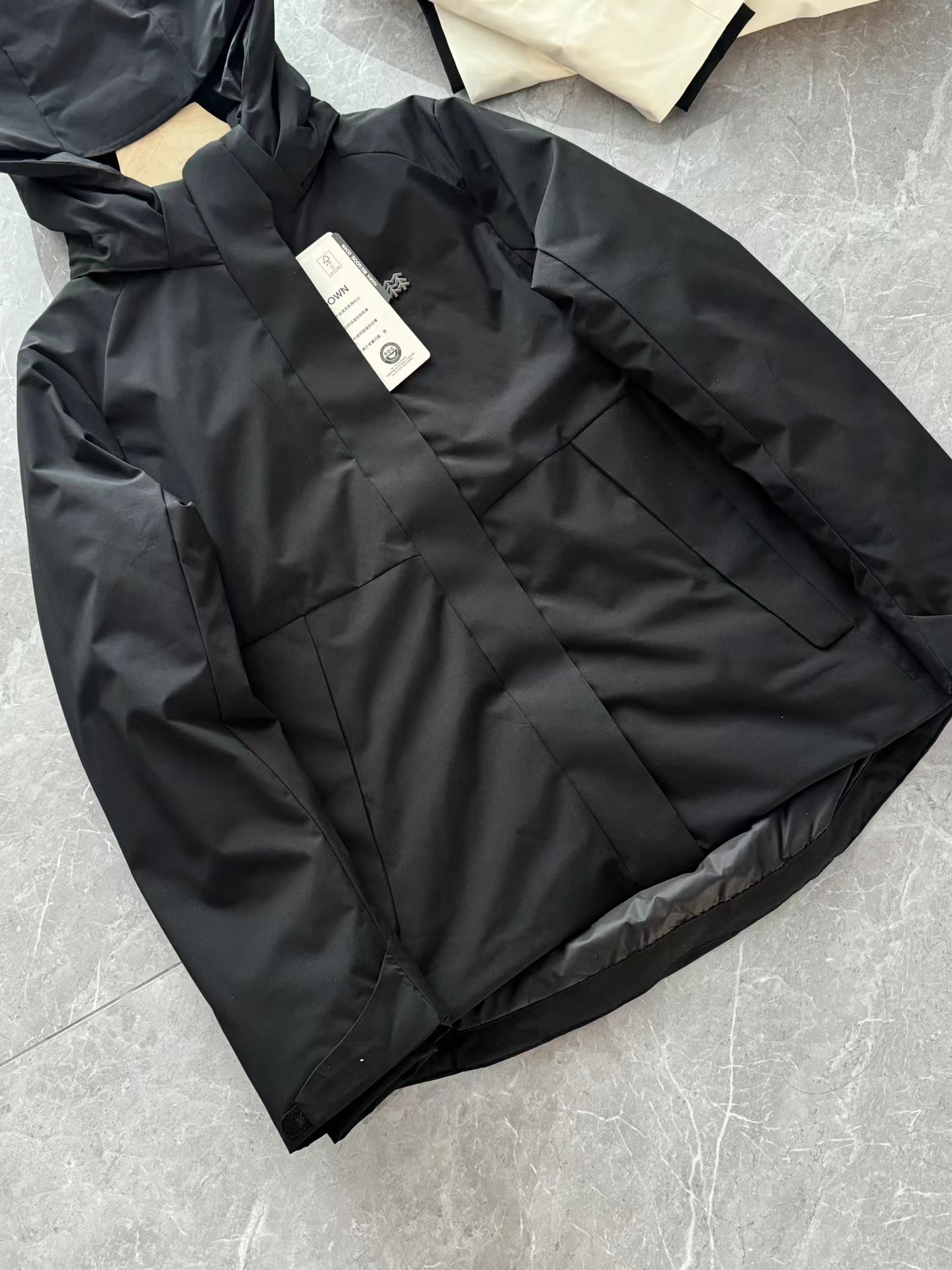 连帽设计,帽子可拆!拉链门襟+外置风裆,风裆高温压胶处理,平整不臃肿!两侧口袋磁扣吸扣+拉链开合,双重防护,使用方便,储物安全!胸前立体金属标识,简洁有辨识度!双向开合的YKK进口拉链,拉头和拉手上全部都有立体标识,全身所有的辅料,调节扣都是品牌原装的,标识齐全,耐用耐磨损!!外层面料:是科技防护工艺的,哑光雾面质地,高密定织,防水防污、防钻绒,工艺很足是那种柔软又不失筋骨的面料,没有硬感,大身具有很好的防泼水效果,日常雨雪天不用担心。