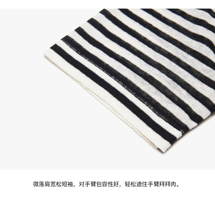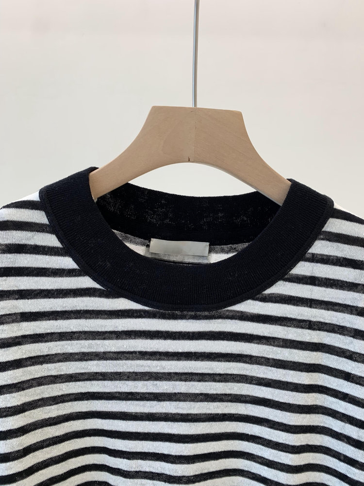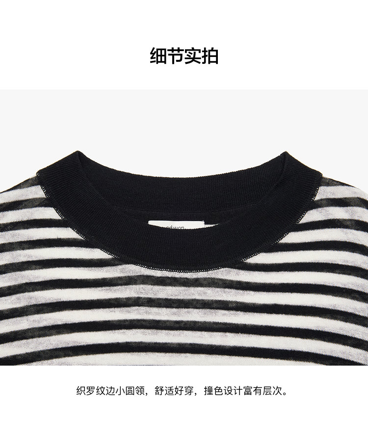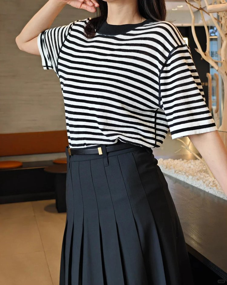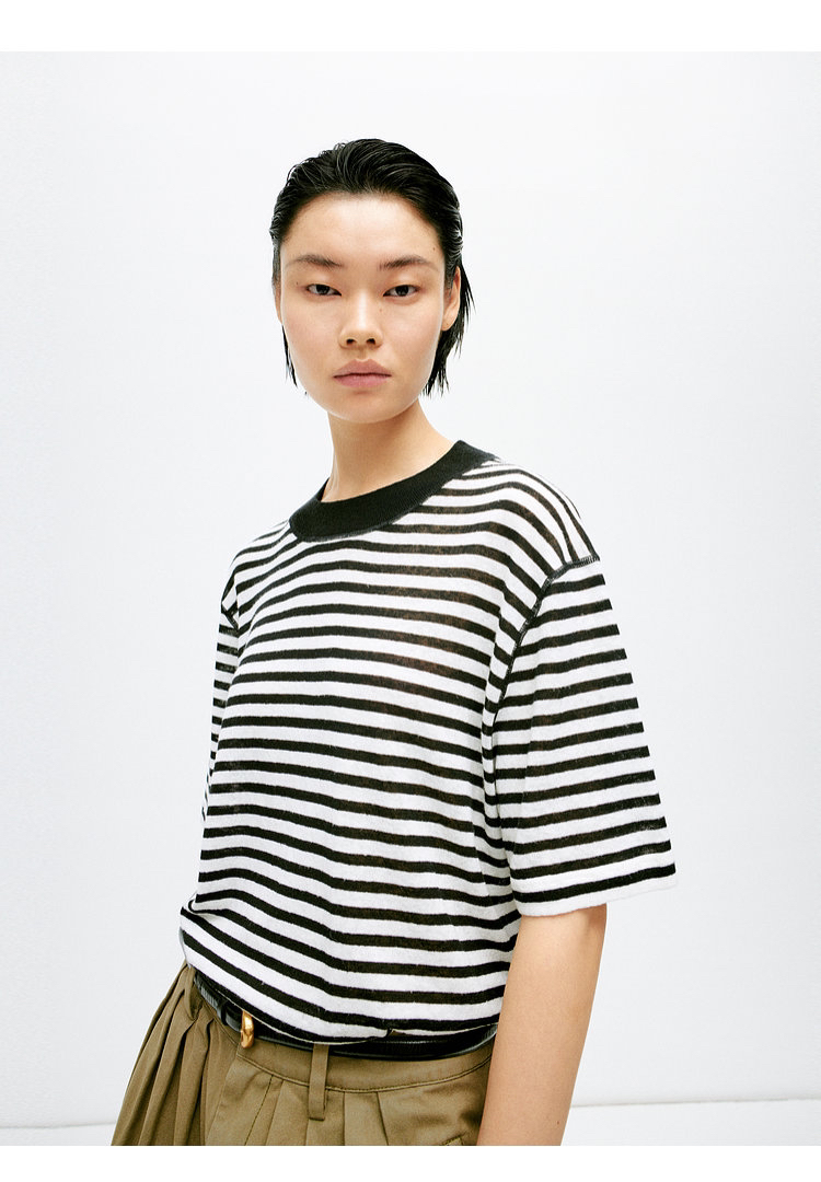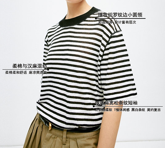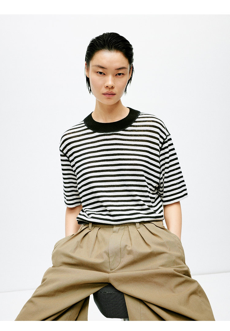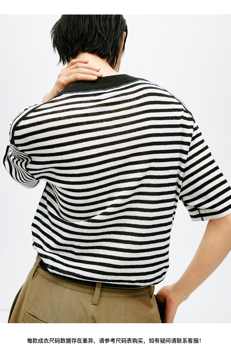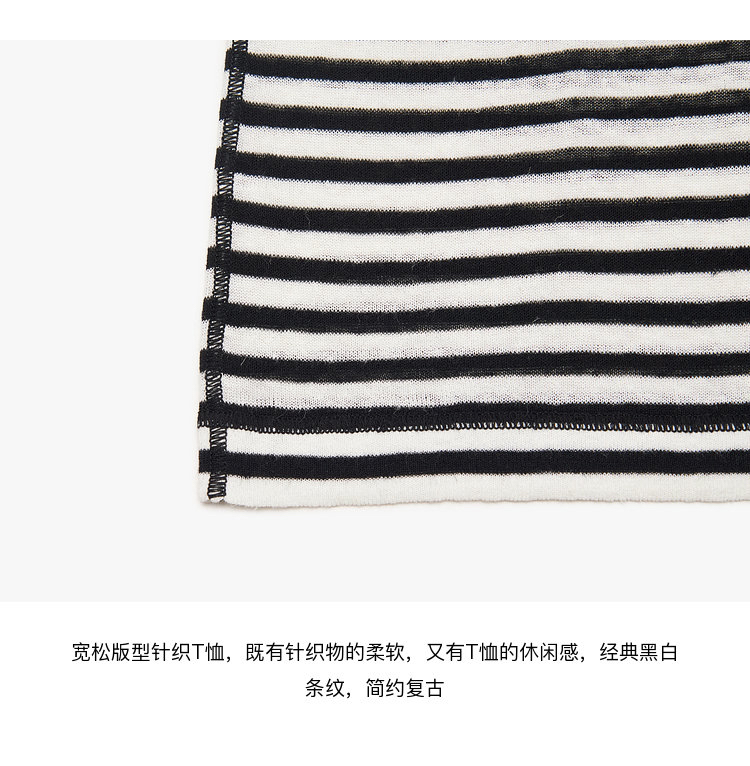 宽松版型针织T恤,既有针织物的柔软,又有T恤的休闲感,经典黑白条纹,简约复古。