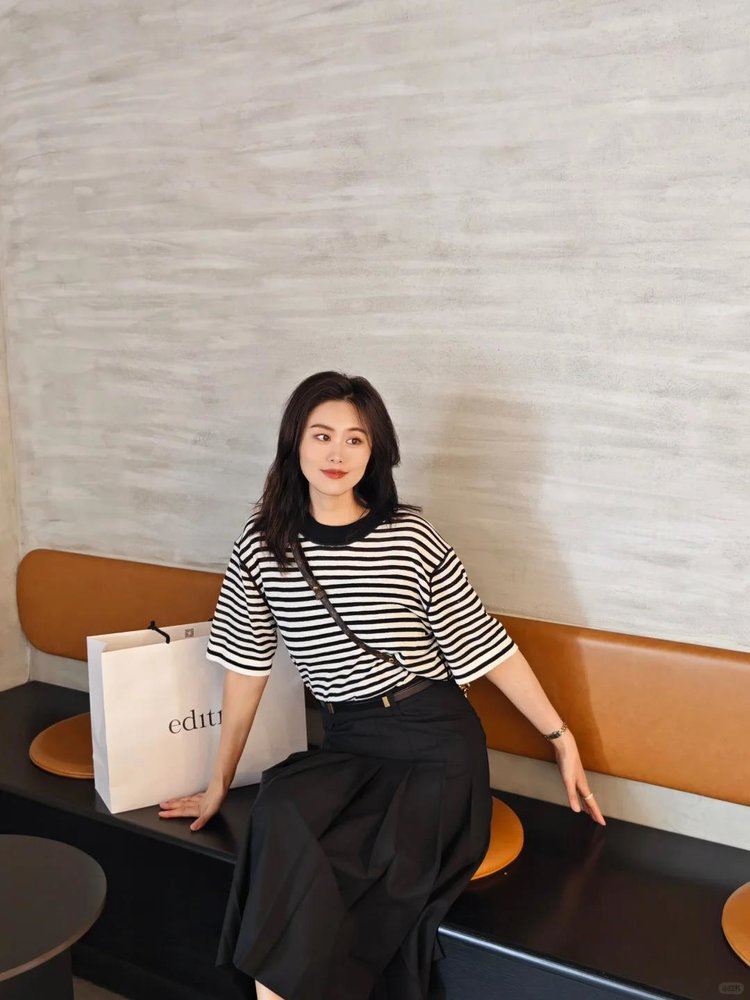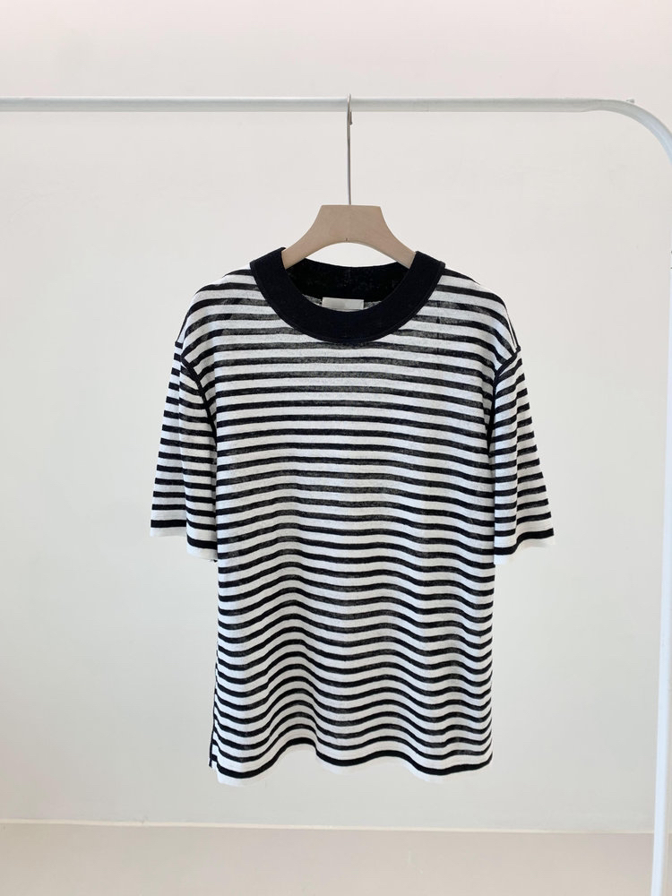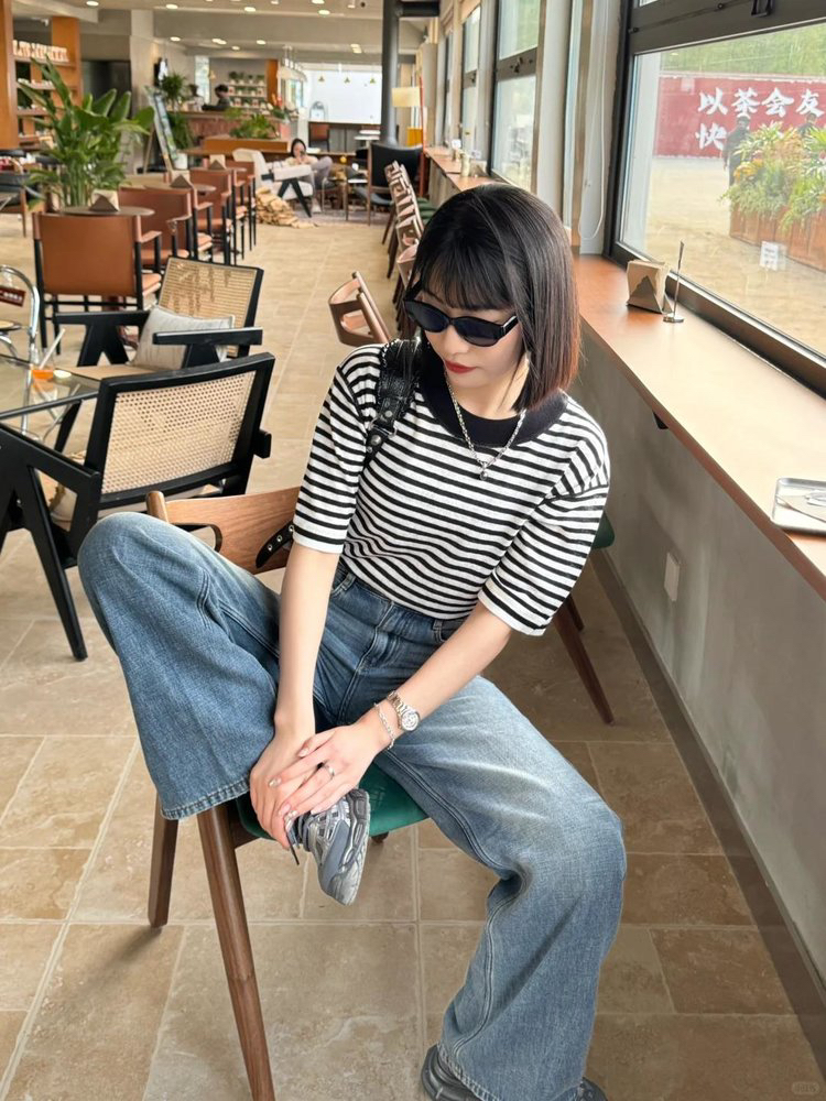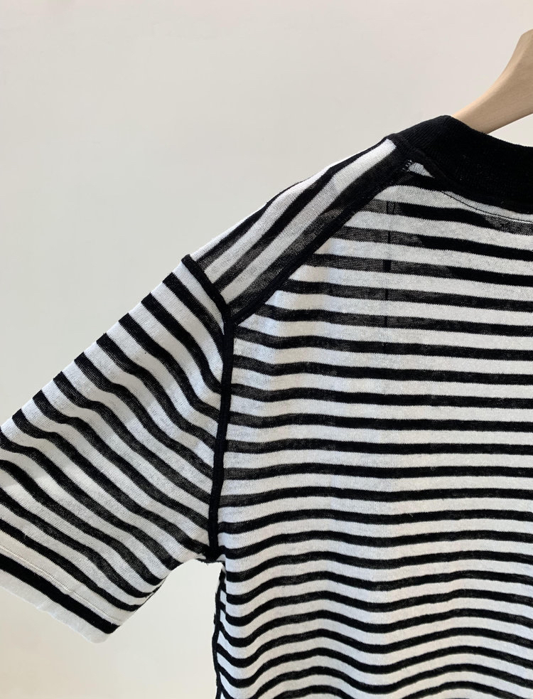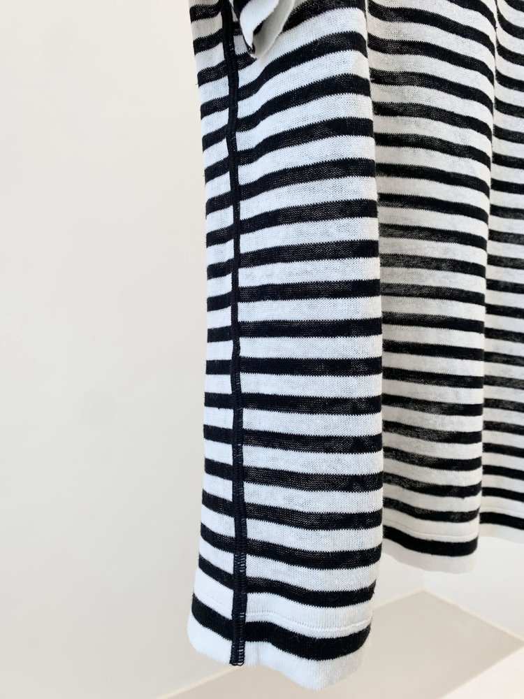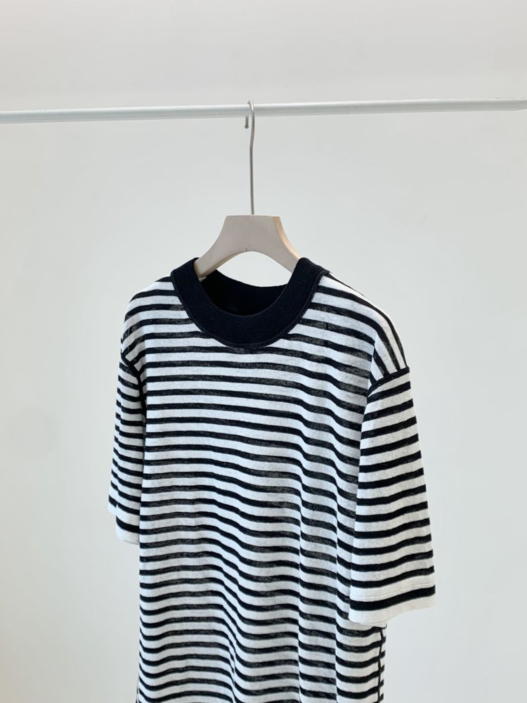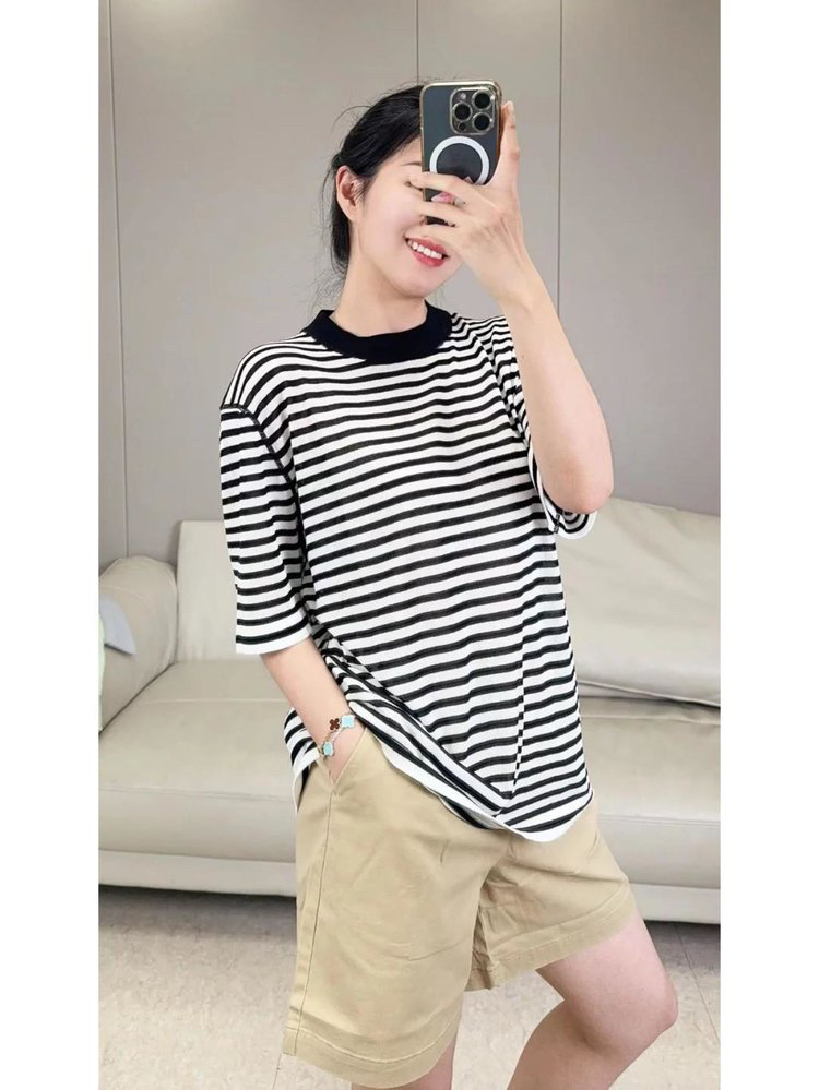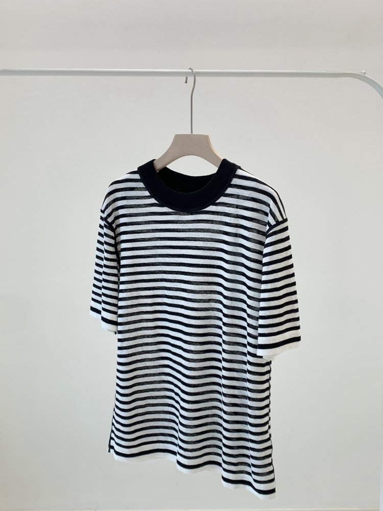宽松版型针织T恤,既有针织物的柔软,又有T恤的休闲感,经典黑白条纹,简约复古。