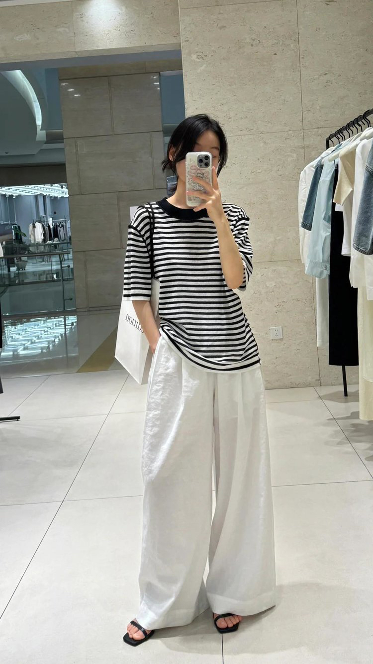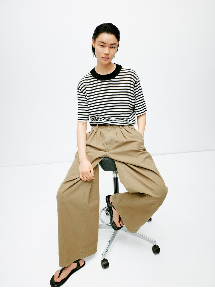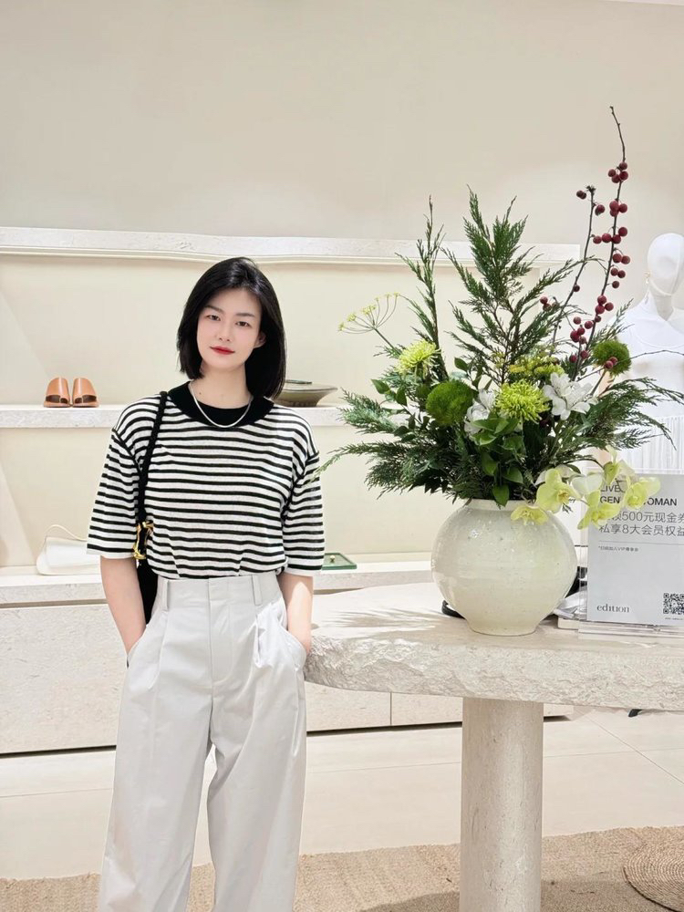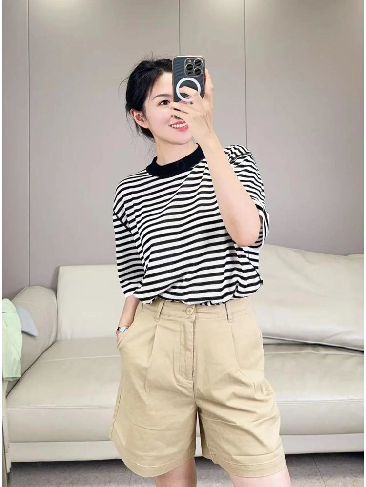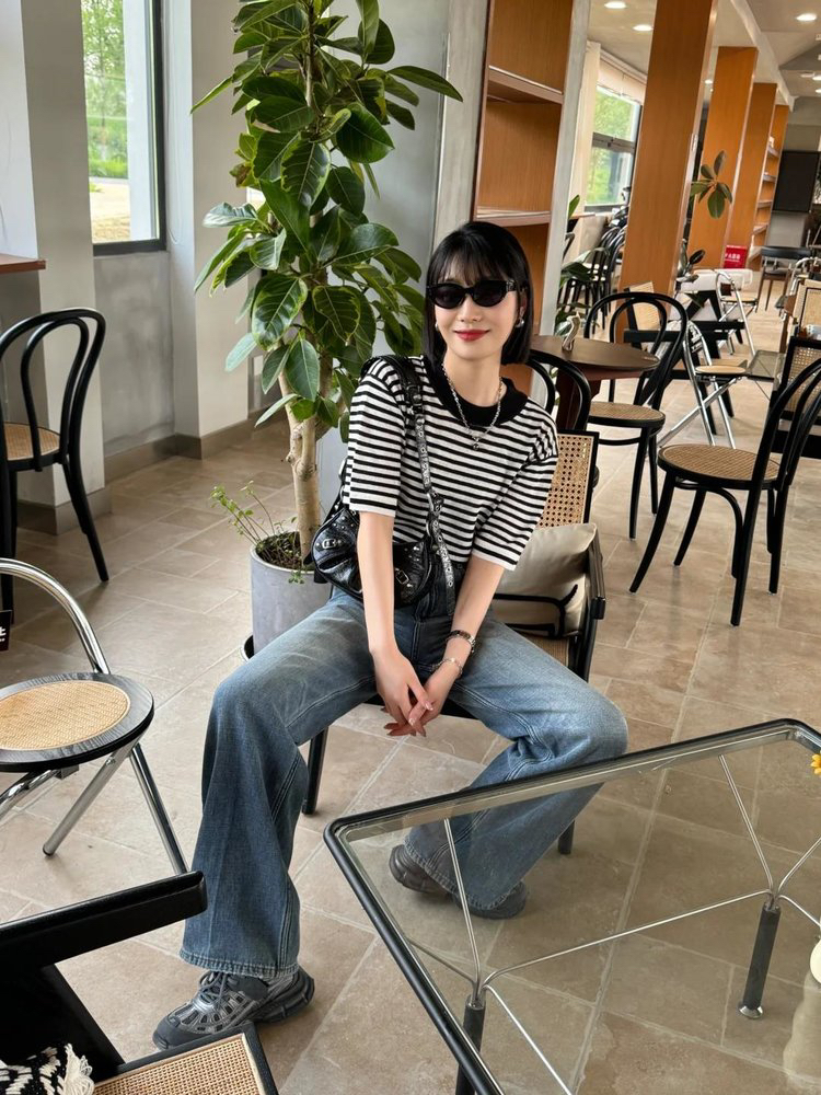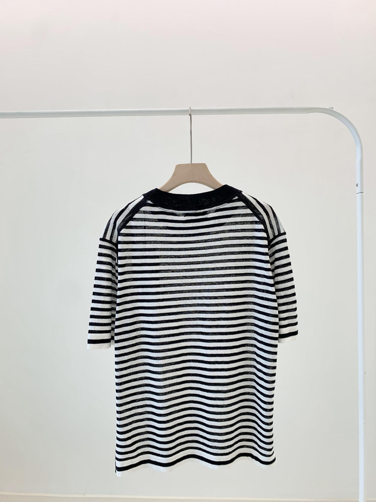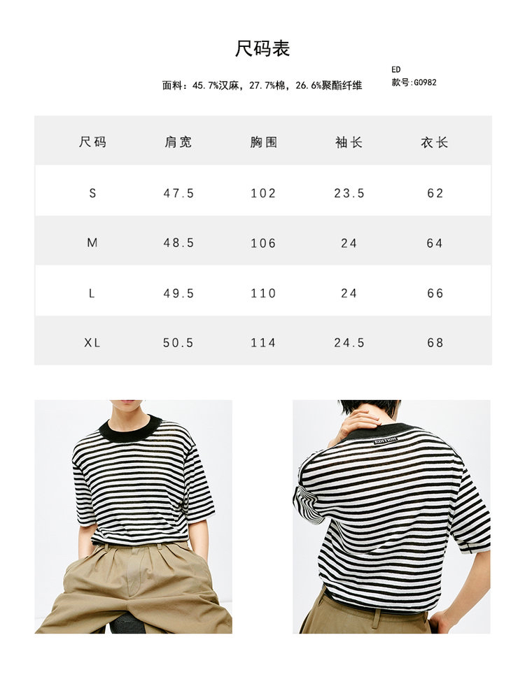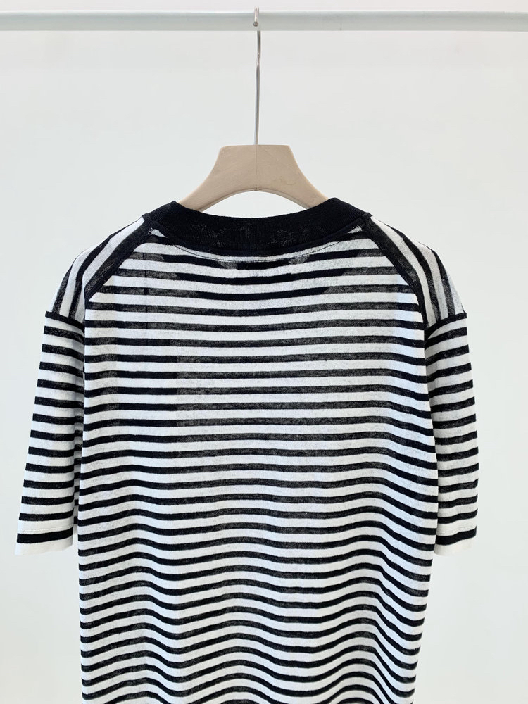 宽松版型针织T恤,既有针织物的柔软,又有T恤的休闲感,经典黑白条纹,简约复古。