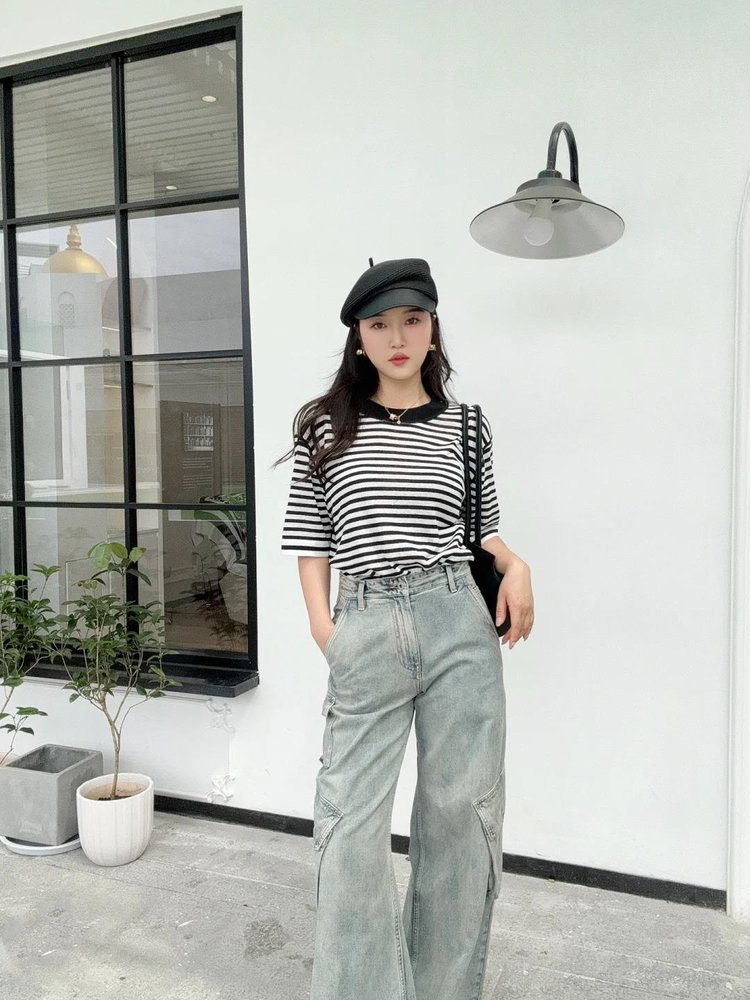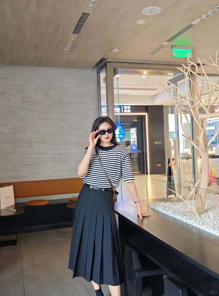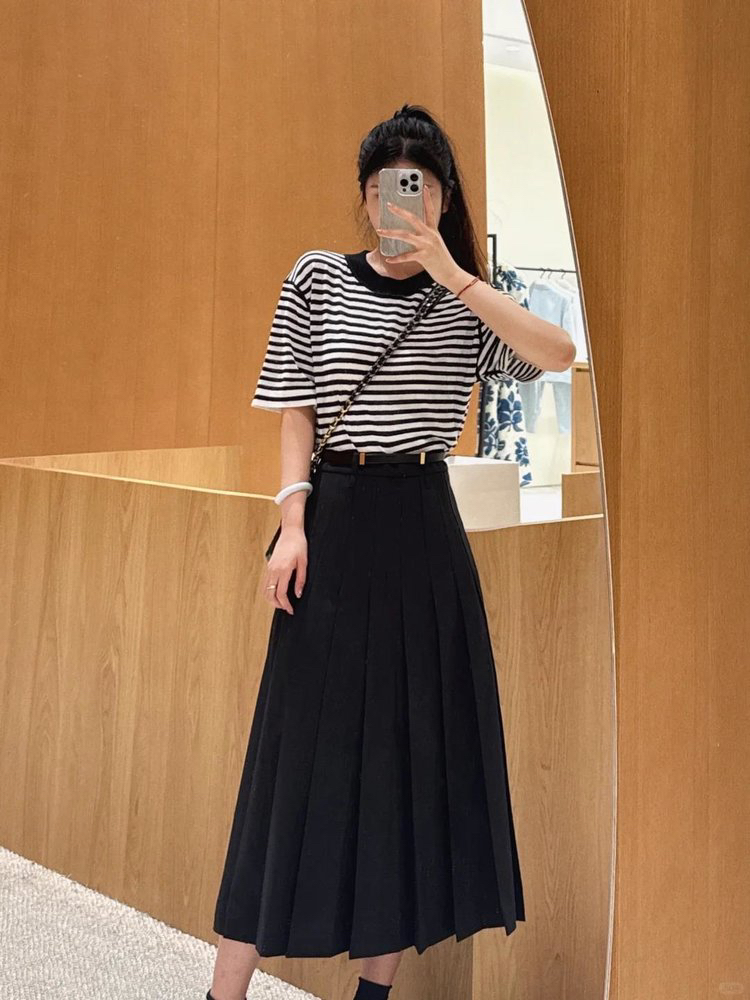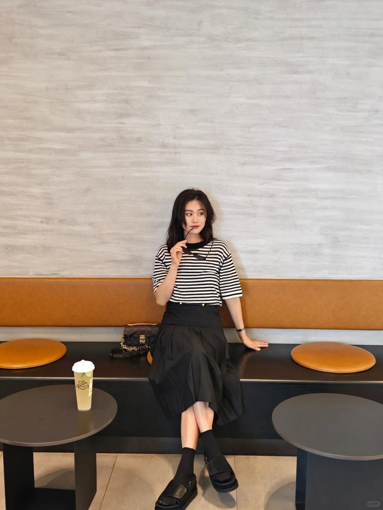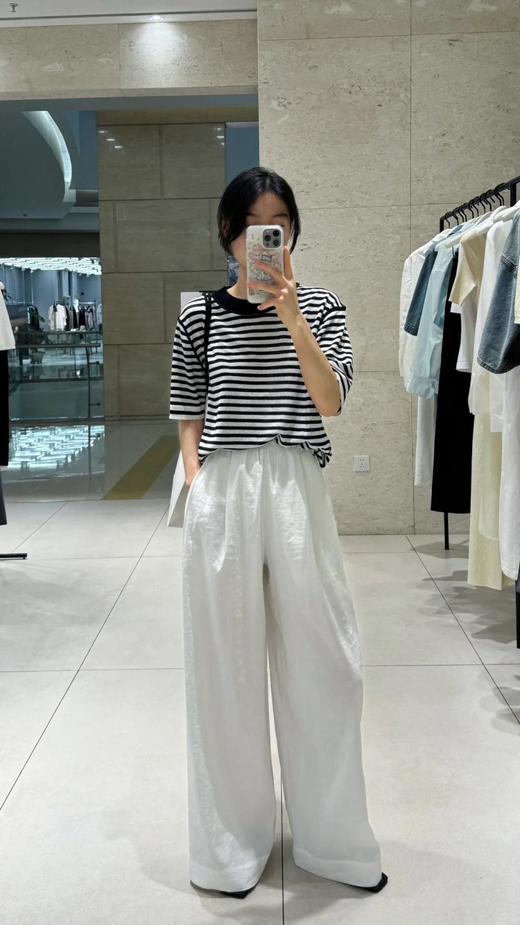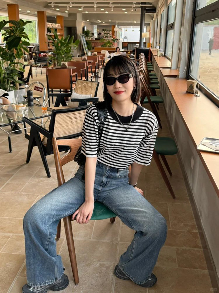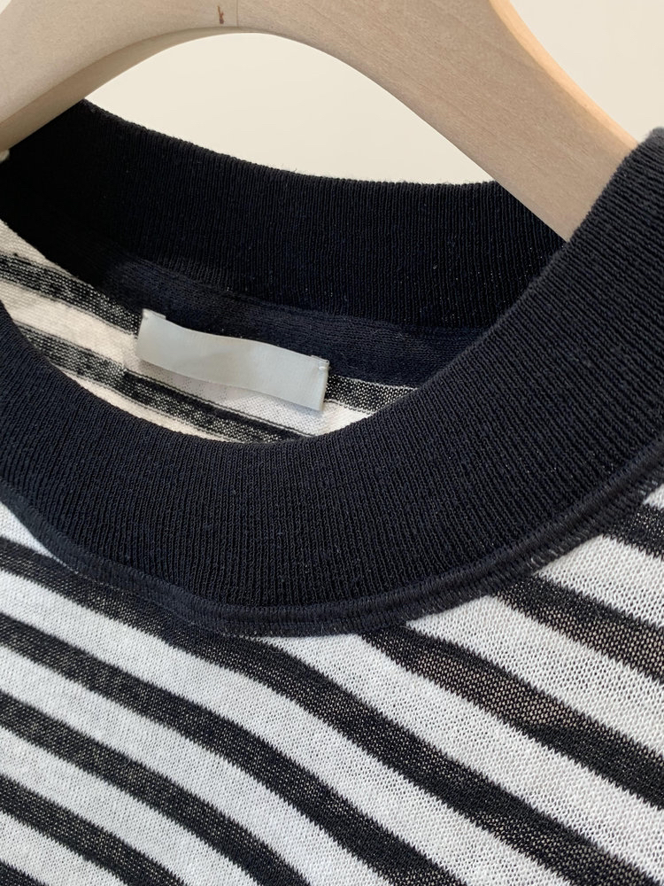宽松版型针织T恤,既有针织物的柔软,又有T恤的休闲感,经典黑白条纹,简约复古。