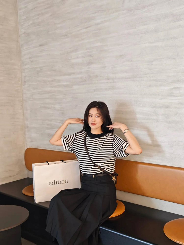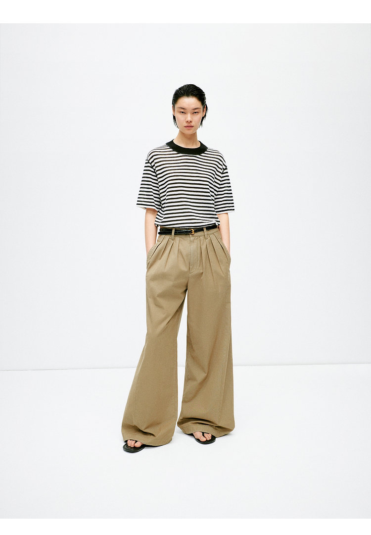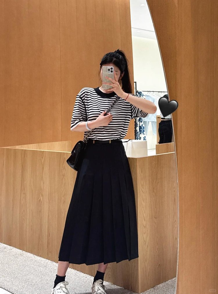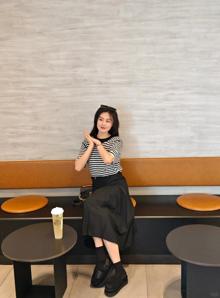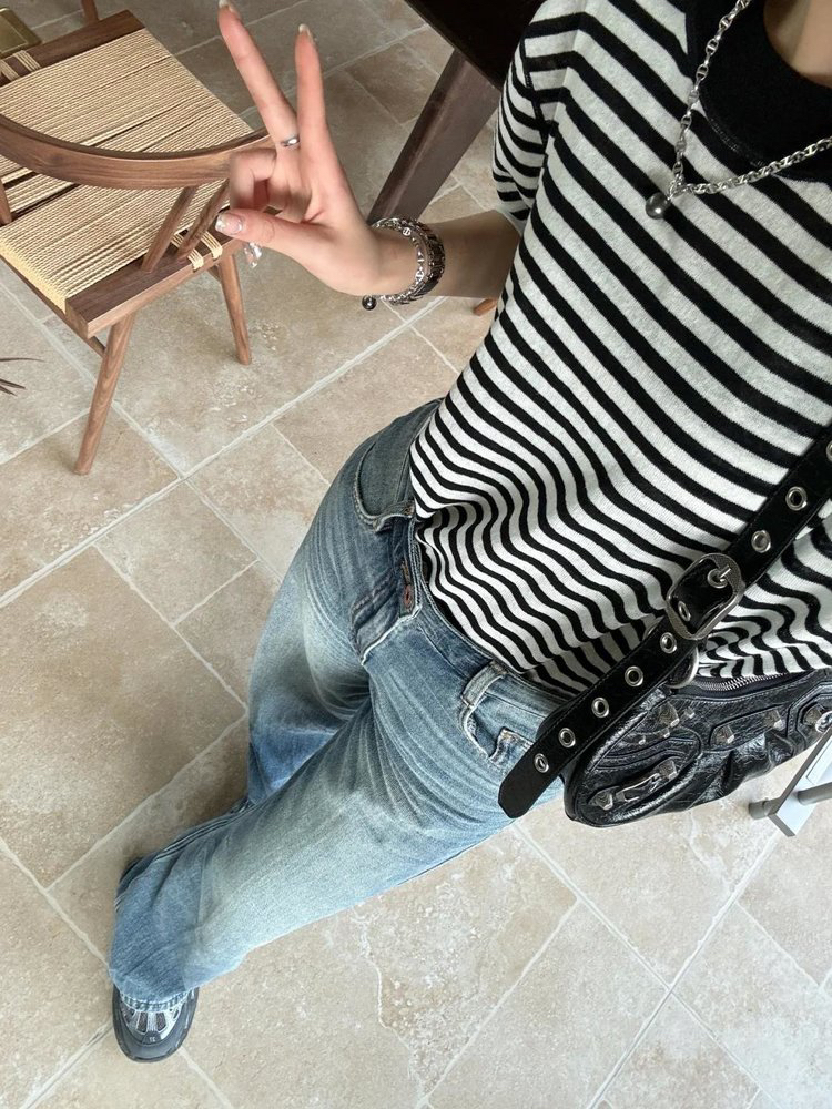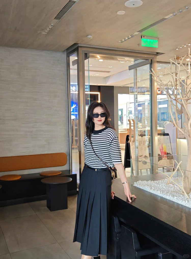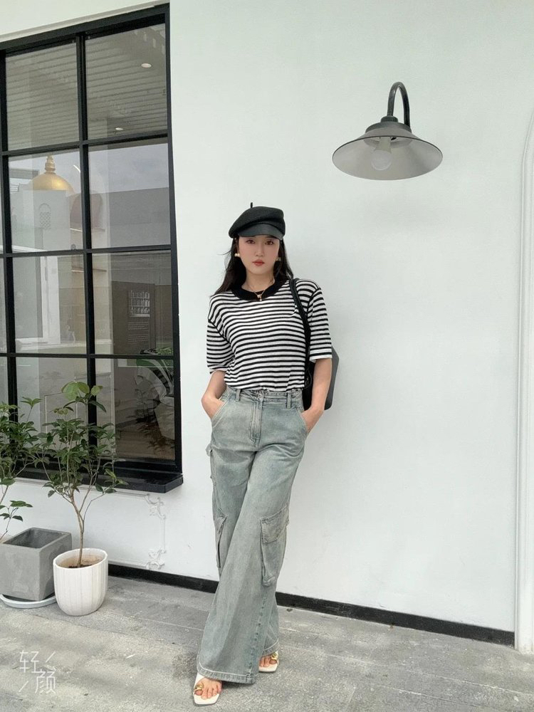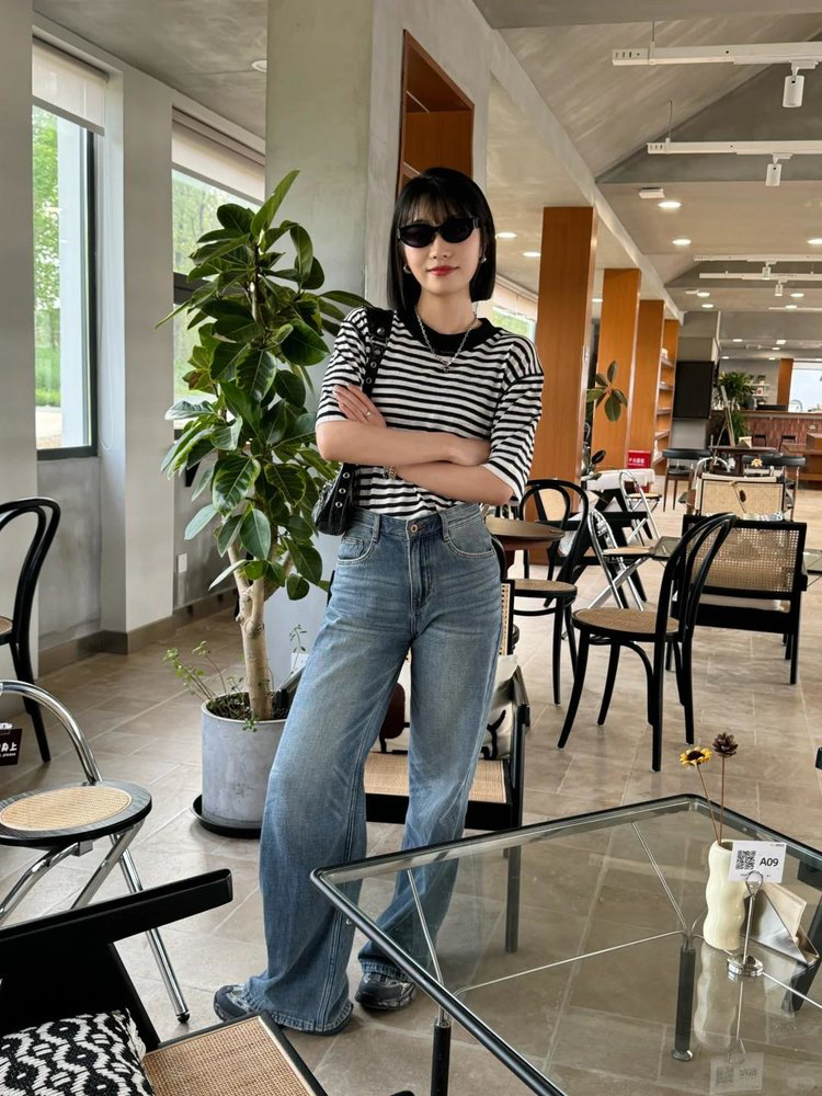 宽松版型针织T恤,既有针织物的柔软,又有T恤的休闲感,经典黑白条纹,简约复古。