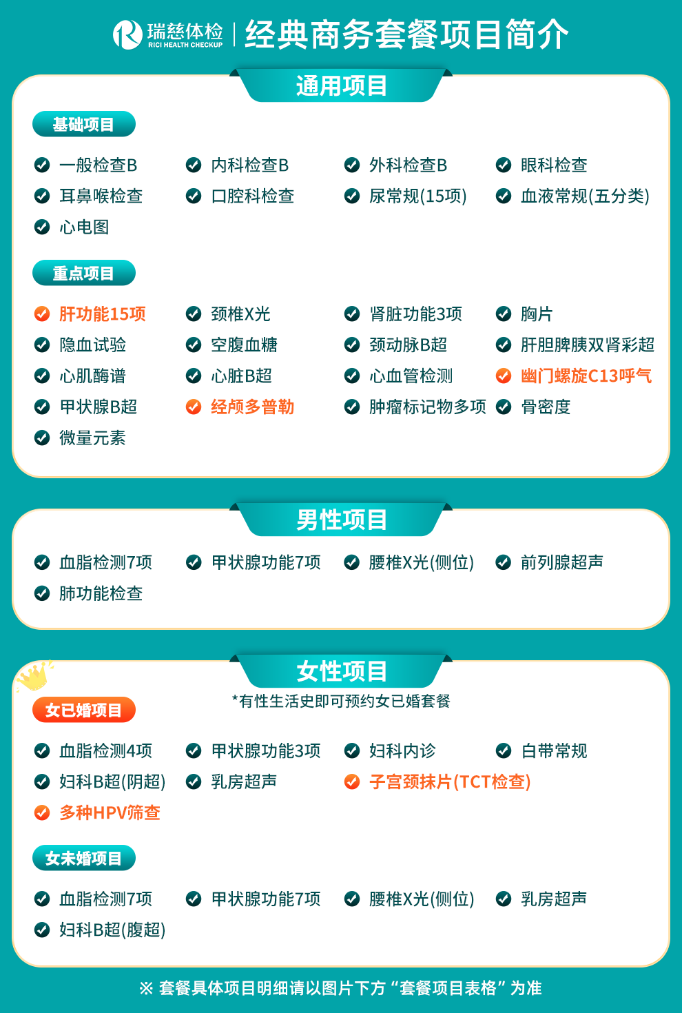 | 本款套餐针对肿瘤、心脏、微量元素、肠胃、骨质疏松等全身有重点监测,是个比较全面的体检。为您的健康保驾护航! | |||||