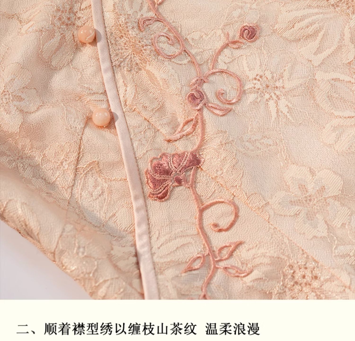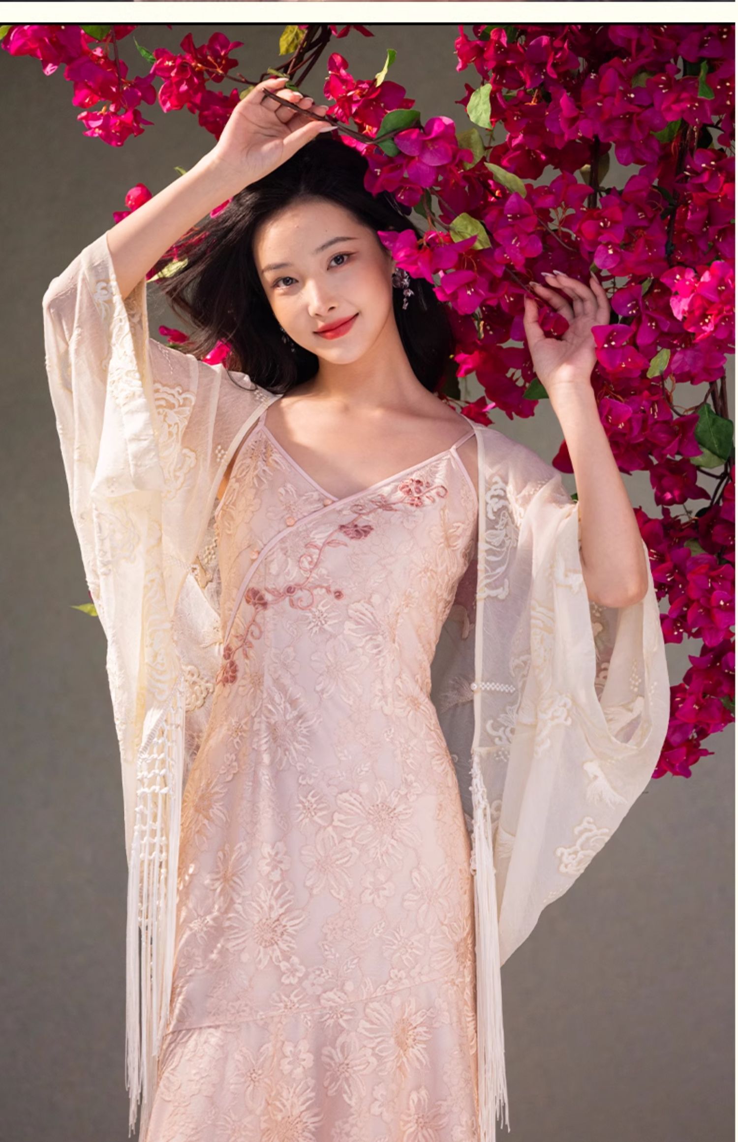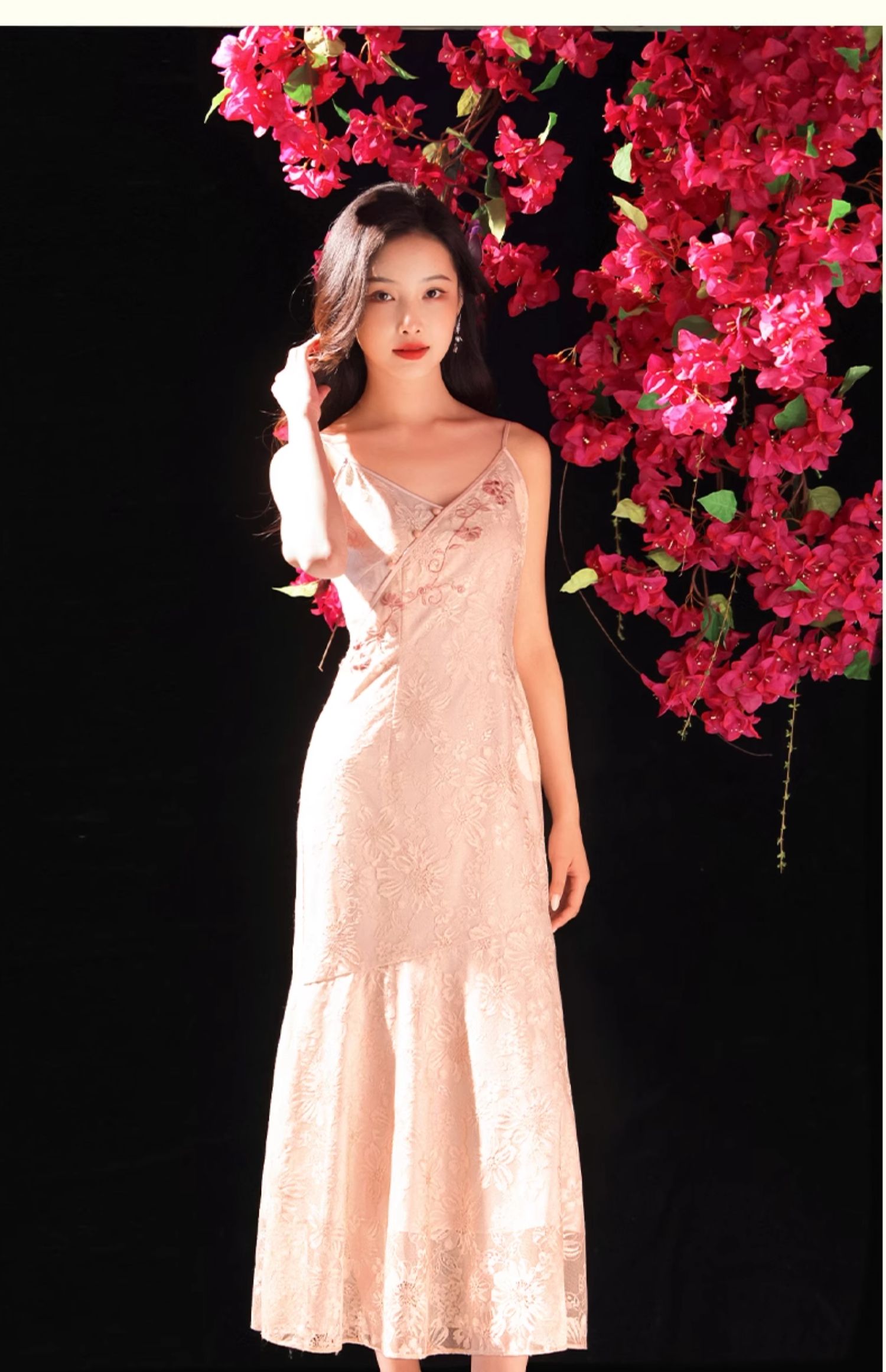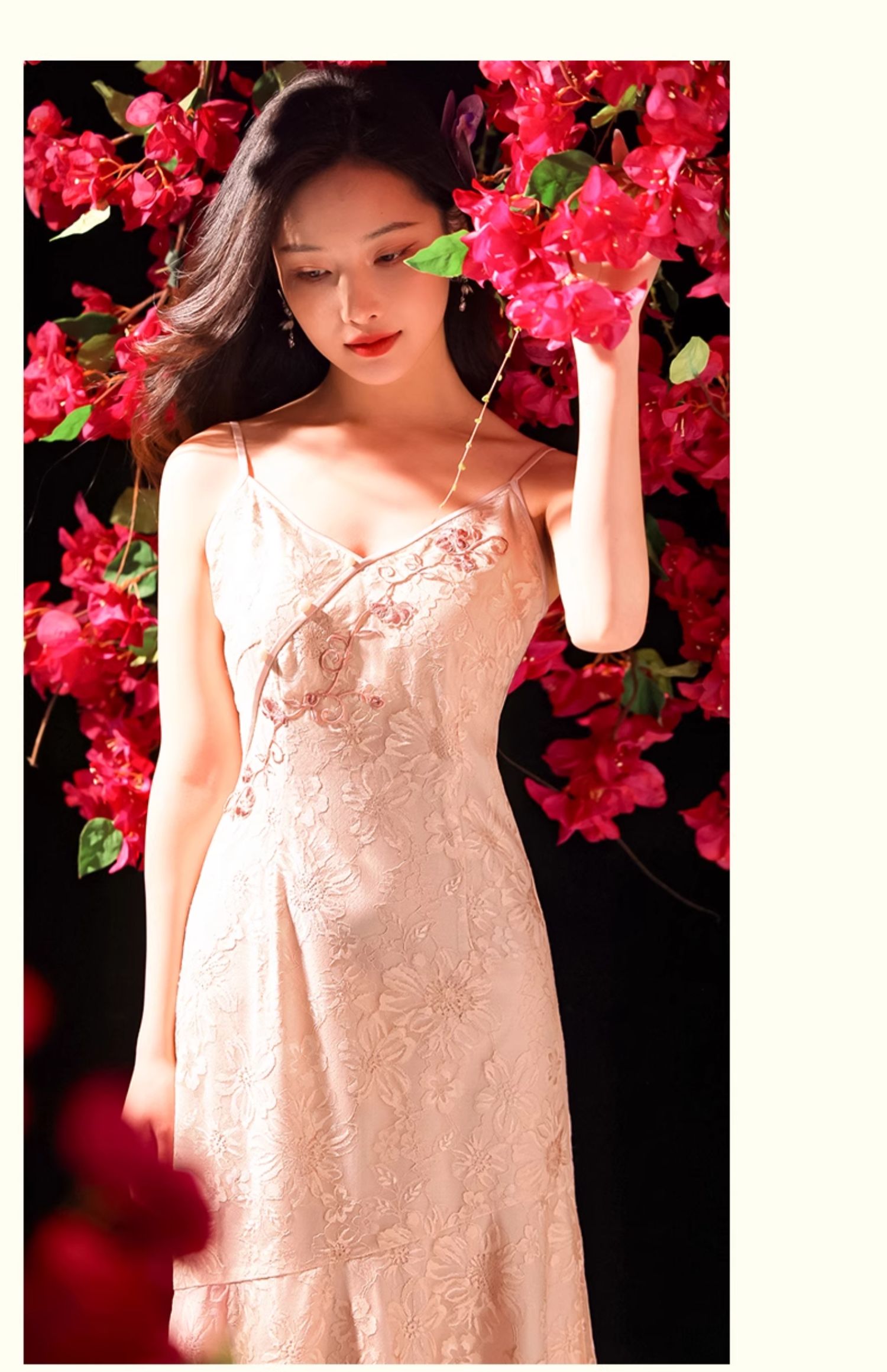 逸红颜妤婉2025夏新款刺绣蕾丝新中式修身显瘦吊带长裙鱼尾连衣裙
