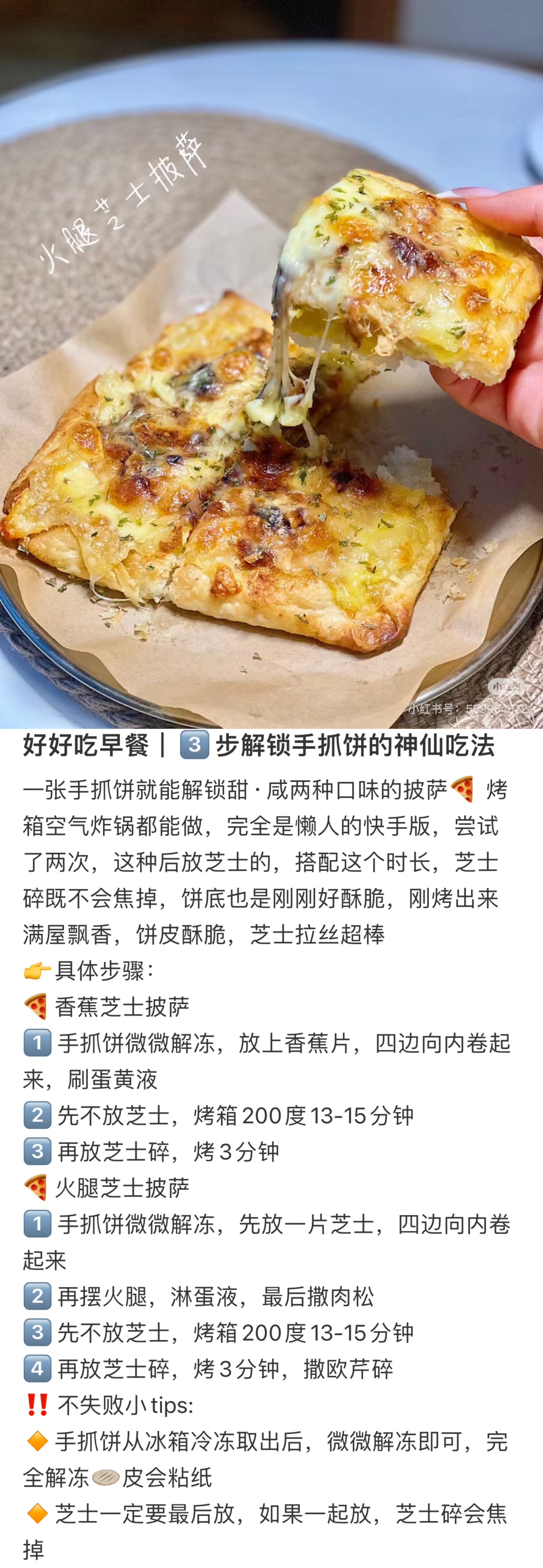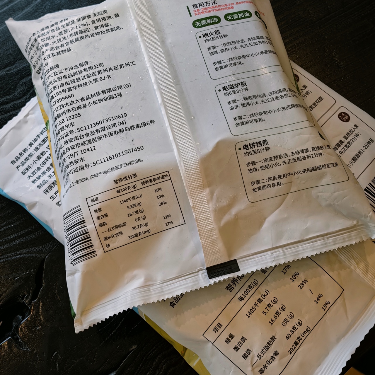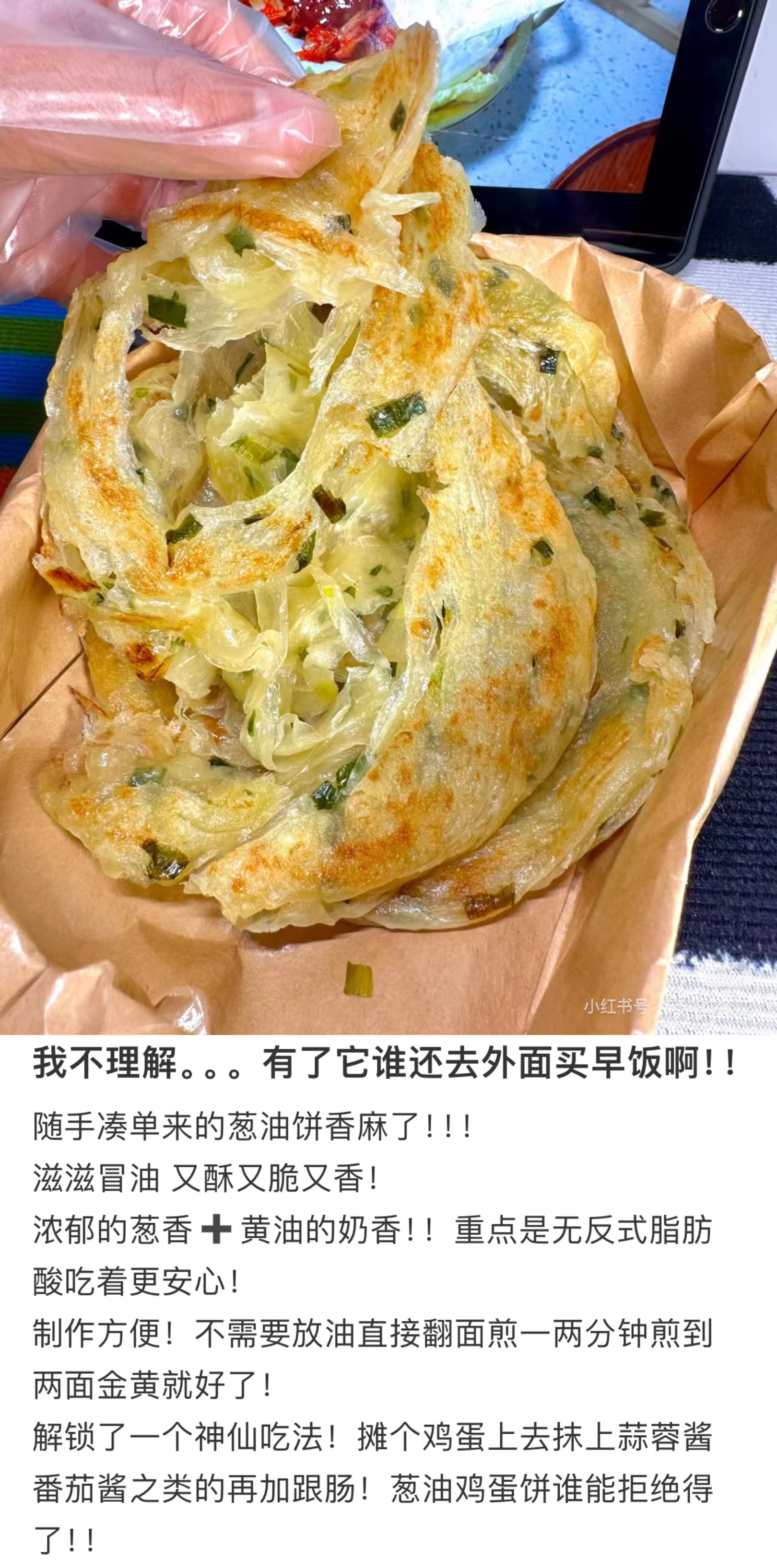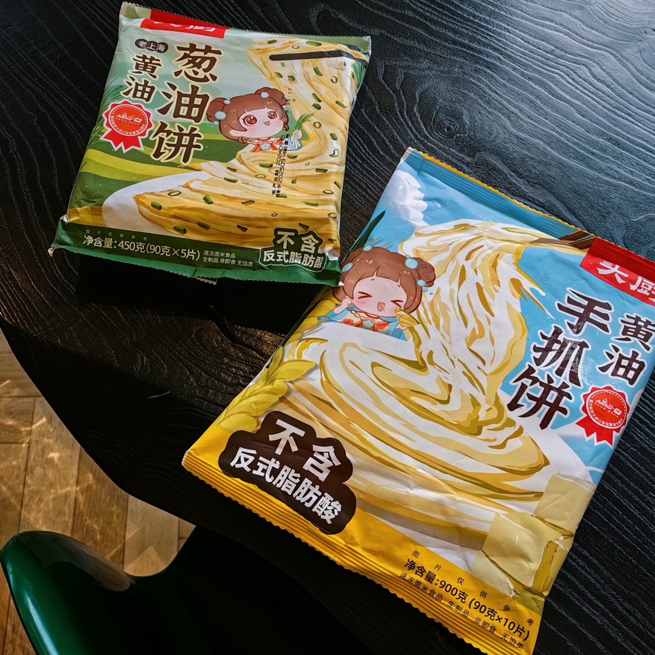 还有上海葱油饼哦,大家可以根据自己的喜好来选,手抓饼每袋10片,大一点,葱油饼每袋5片,小一点,是正好能进空气炸锅的,不用刷油,直接200度15分钟,或者上锅煎一煎,就可以开吃!煎好的饼子外皮金黄酥脆,内里香软柔嫩,还非常适合DIY!大家可以根据自己的喜好,做做快手香蕉芝士饼、酱香饼、香肠酥皮卷、pizza等等,基本不需要厨艺!虽然价格比普通的手抓饼稍微贵一丢丢,但真的好吃健康!