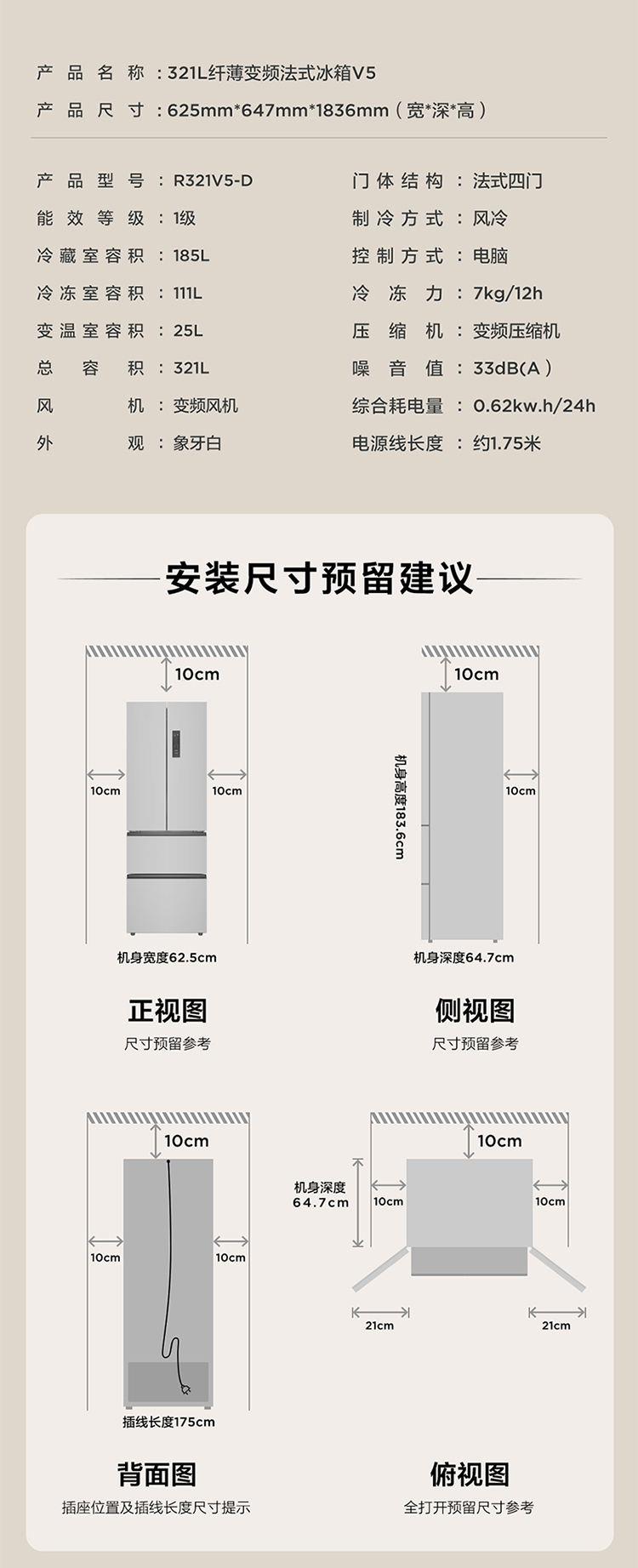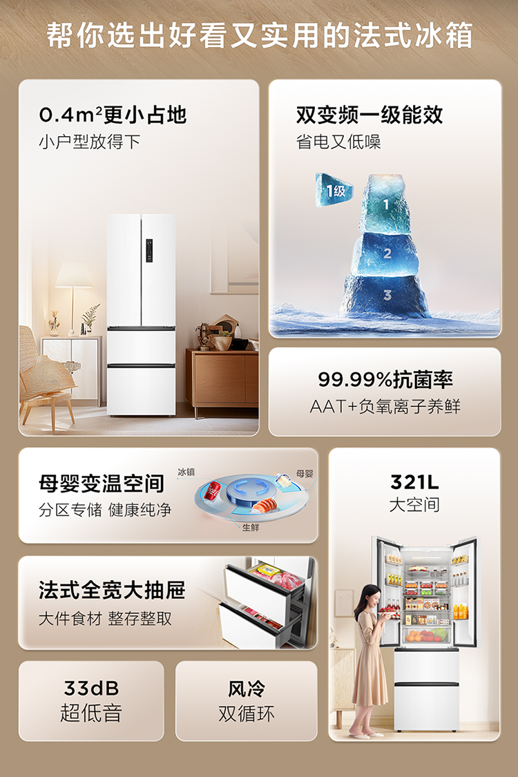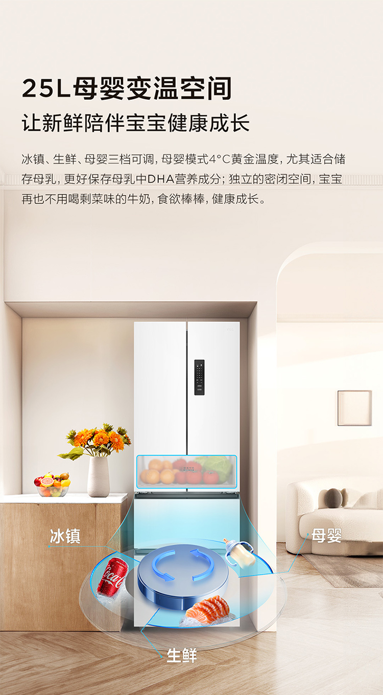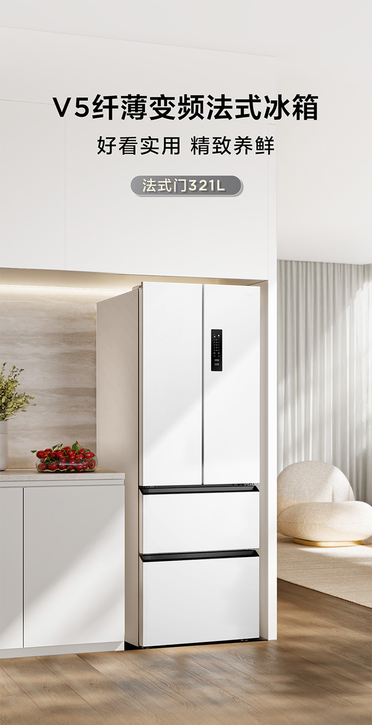 TCL 321升法式多门四开门一级能效33分贝低音小户型白色冰箱 R321V5-D(咨询客服送优惠大礼包)