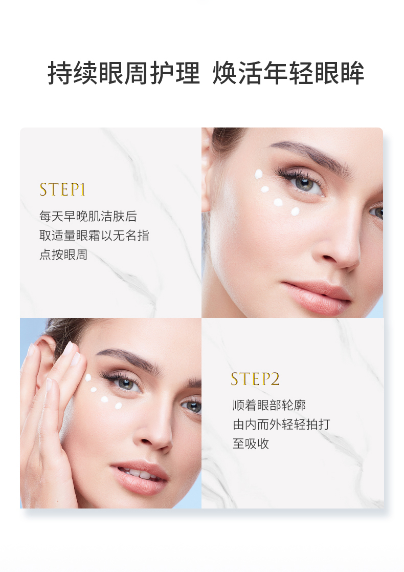 使用方法:取适量眼霜以无名指点按眼周,再顺着眼周轮廓,由内而外轻轻拍打至吸收