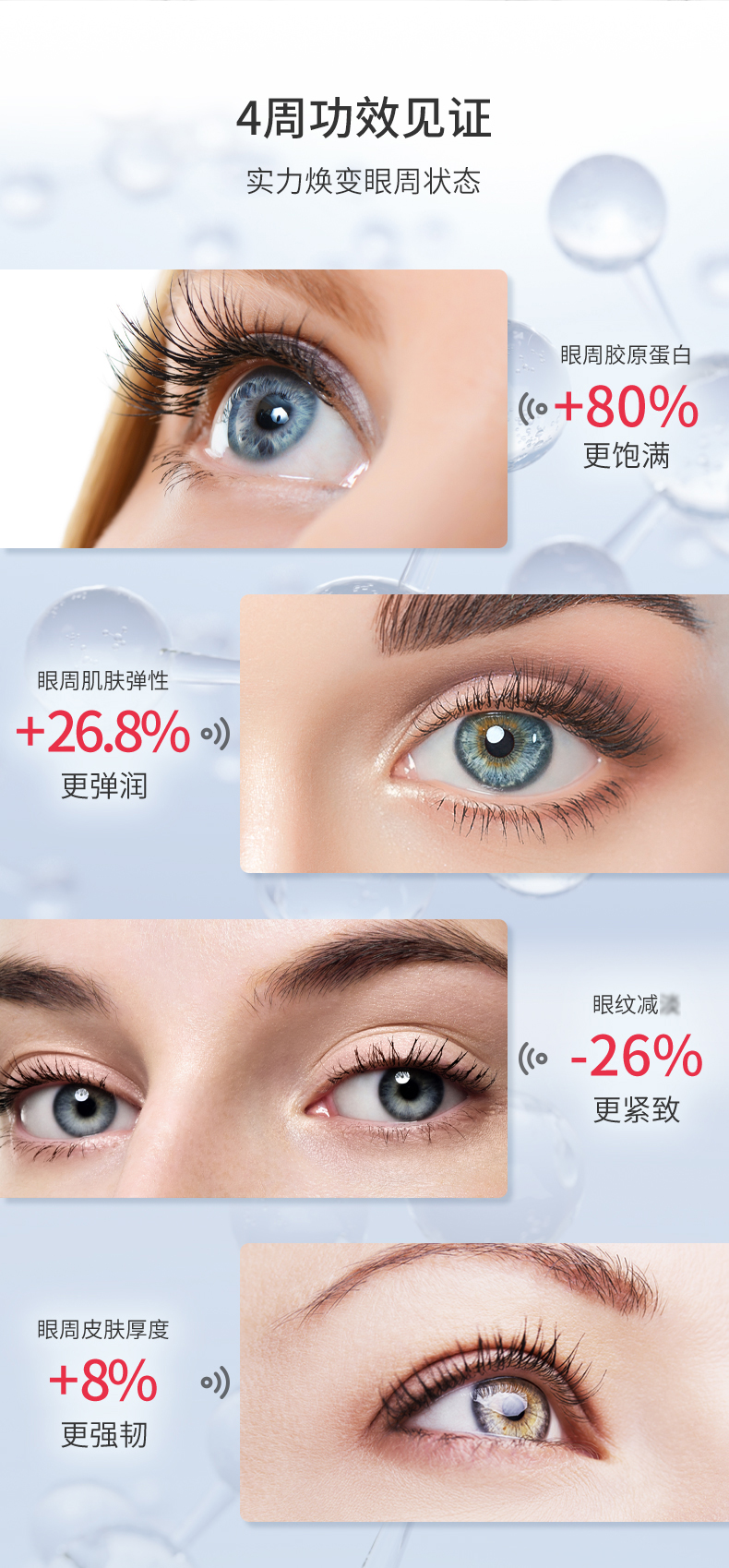 产品功效:激活胶原细胞,饱满弹润眼周,对抗皱纹及松弛,减少眼周纹,改善暗沉,焕亮眼周,强韧眼周屏障