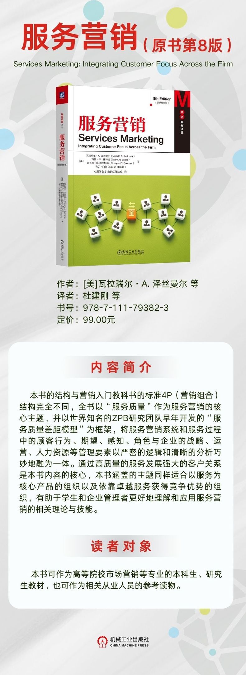本书的基础是认识到服务提出的特殊挑战,必须由管理人员识别和解决,写作的目的是为了帮助学生和管理人员了解并解决服务营销的这些特殊挑战。通过高质量的服务(和服务)发展强大的客户关系是本书内容的核心。本书涵盖的主题同样适用以服务为核心产品的组织(如银行、交通运输等)(汽车公司、酒店、医院、教育机构、专业服务、电信)以及依靠卓越服务获得竞争优势的组织(高科技制造商、汽车和工业产品、信息密集型技术公司等),且同时适用大型、成熟的公司和小型企业。