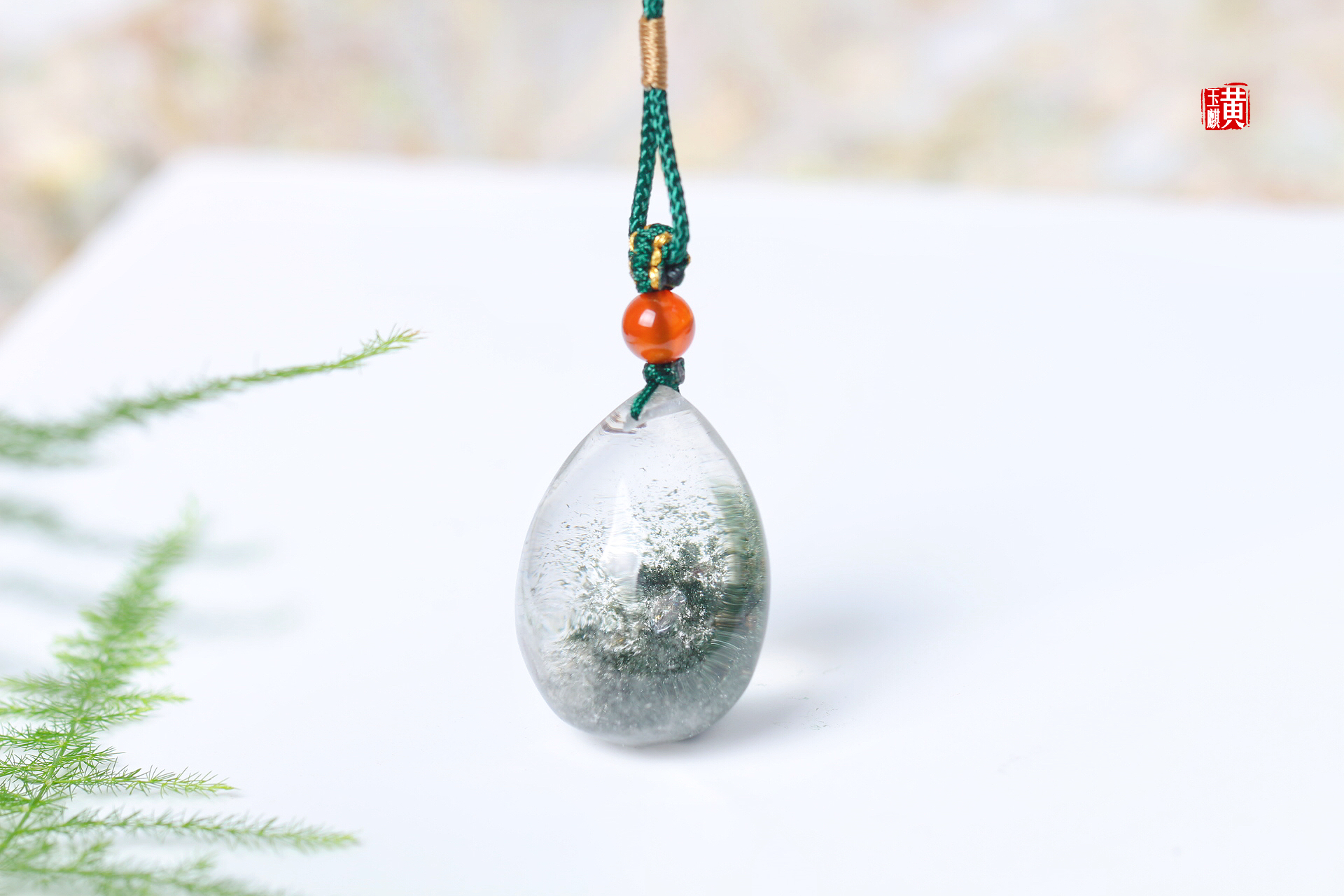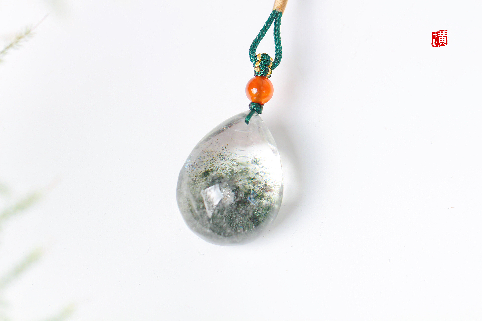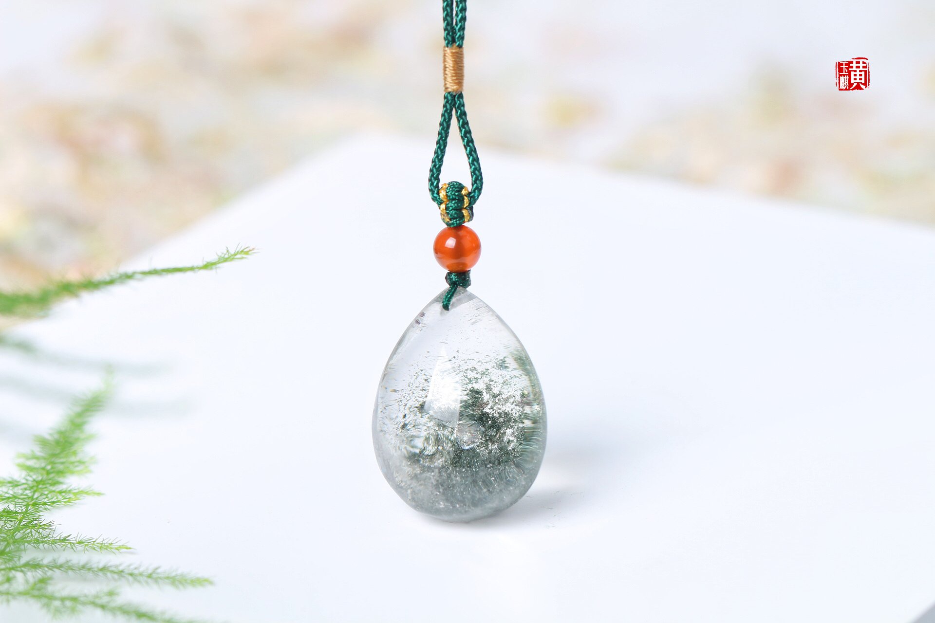 绿幽灵水晶吊坠,晶体通透明亮,一汪春色凝于晶中,如雾锁春山,似林间晨霭,意境优美,寓意能量积聚、财富汇聚。