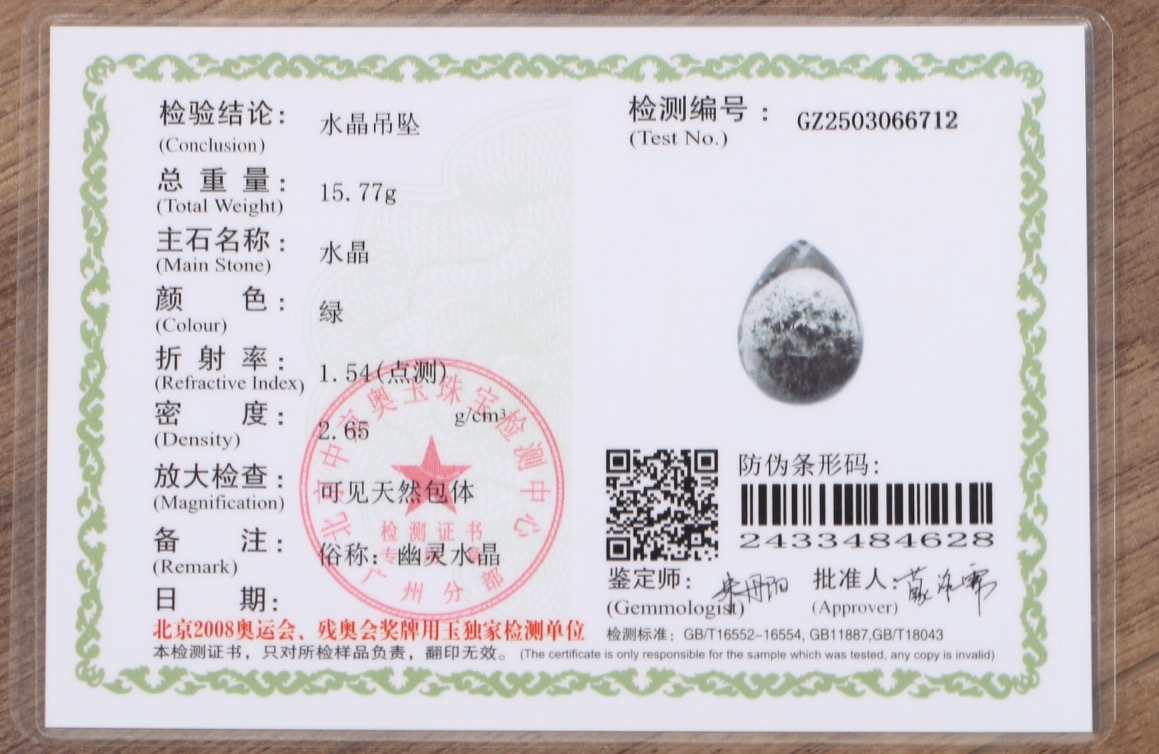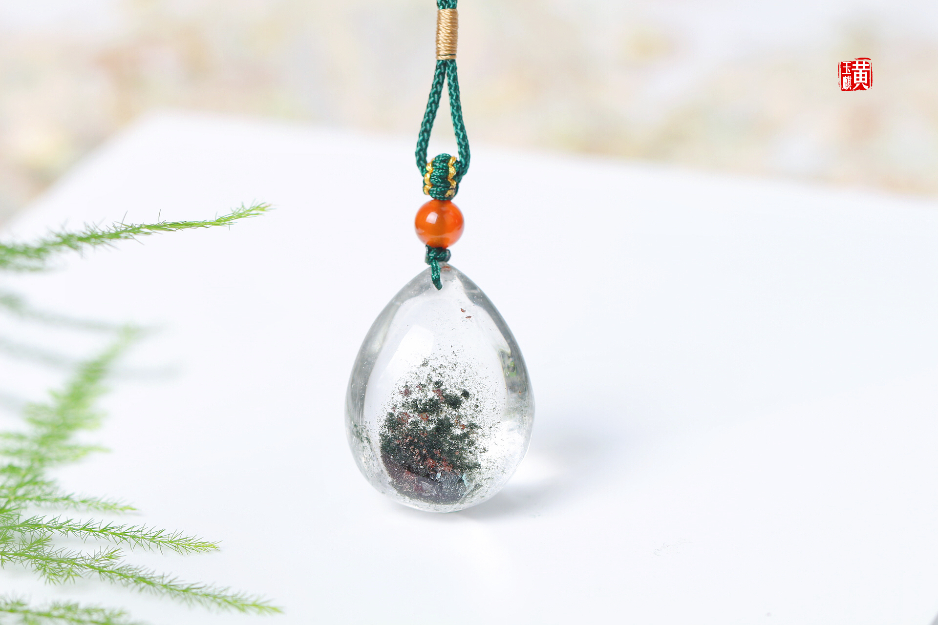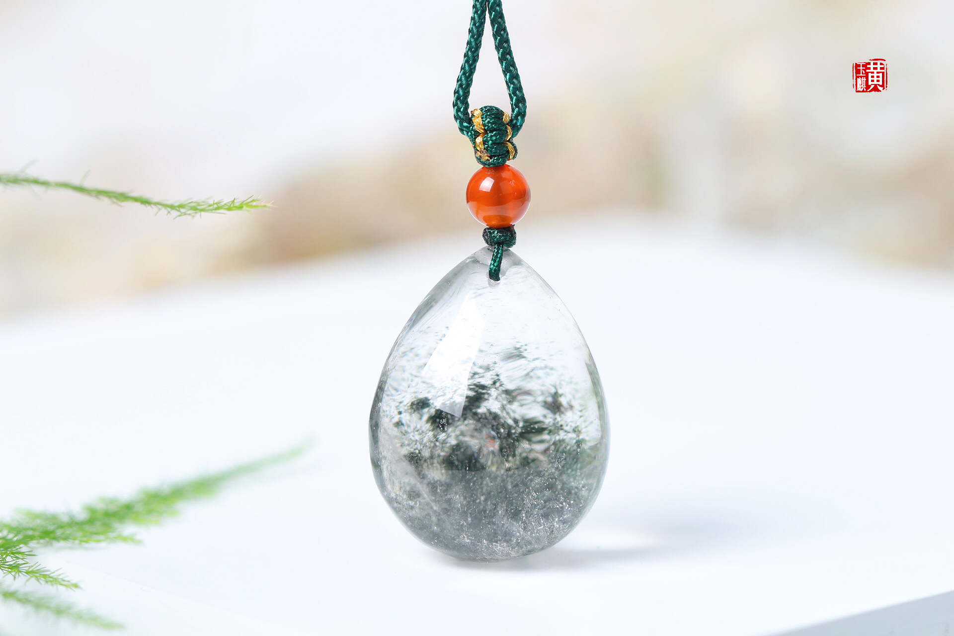 绿幽灵水晶吊坠,晶体通透明亮,一汪春色凝于晶中,如雾锁春山,似林间晨霭,意境优美,寓意能量积聚、财富汇聚。