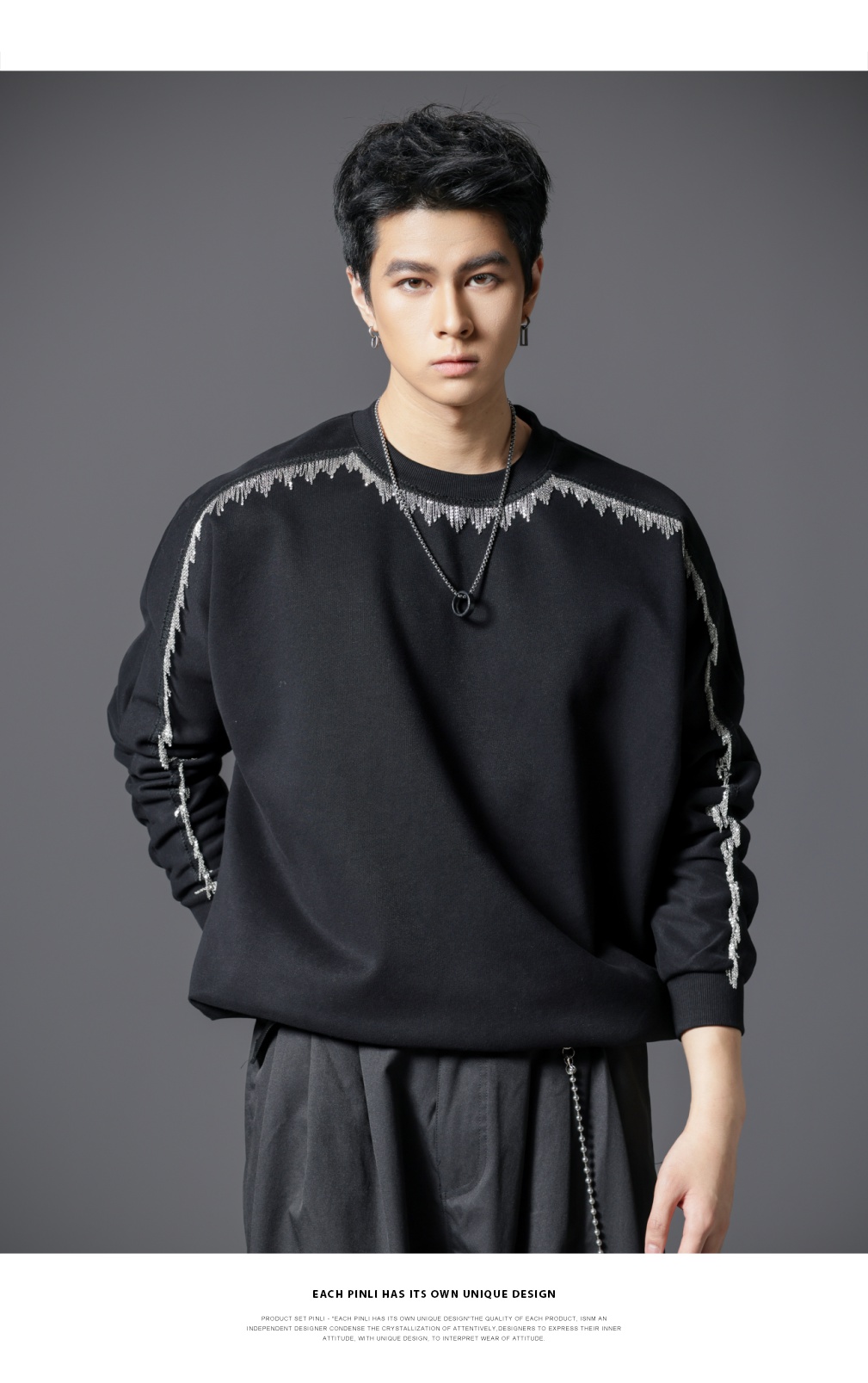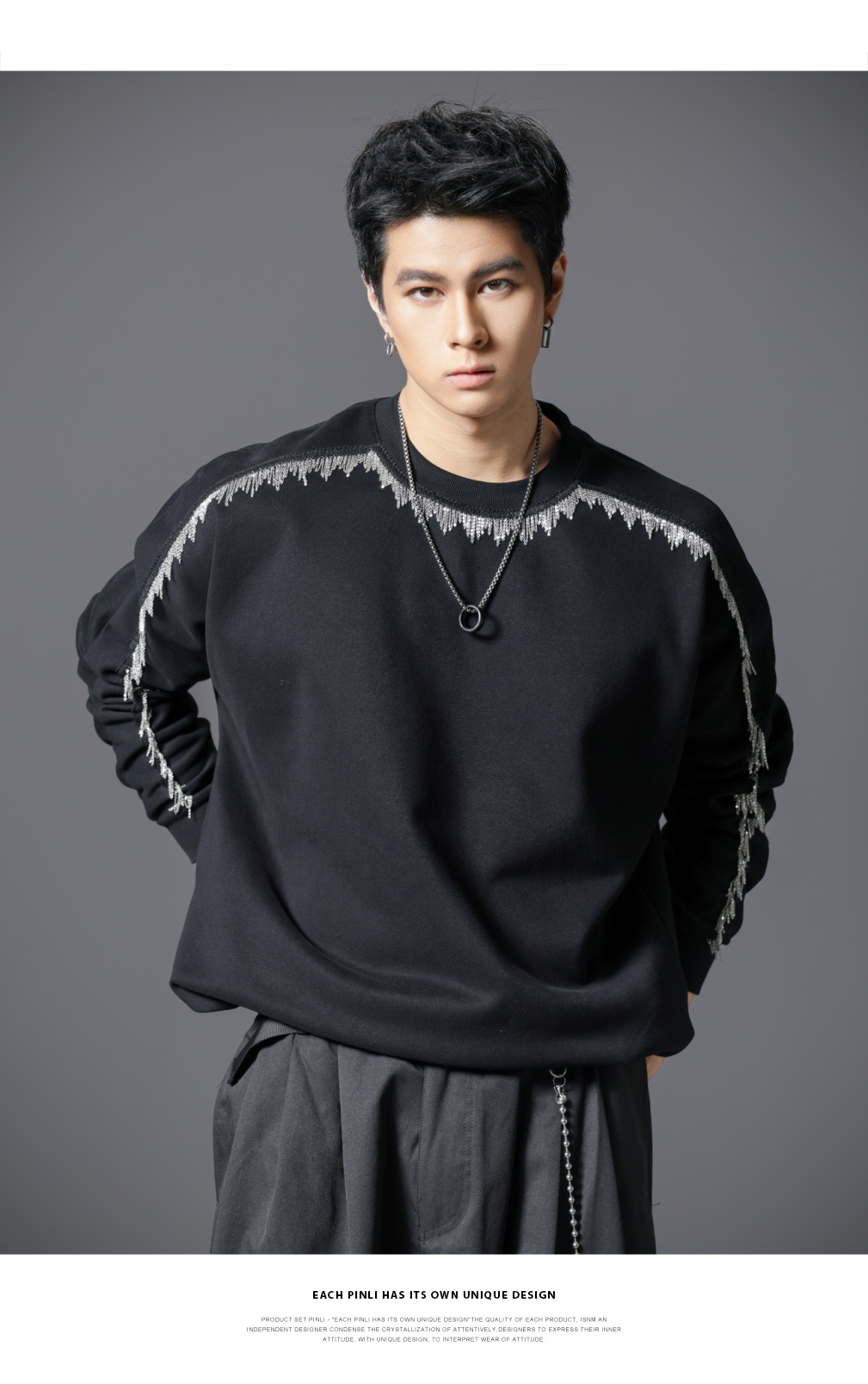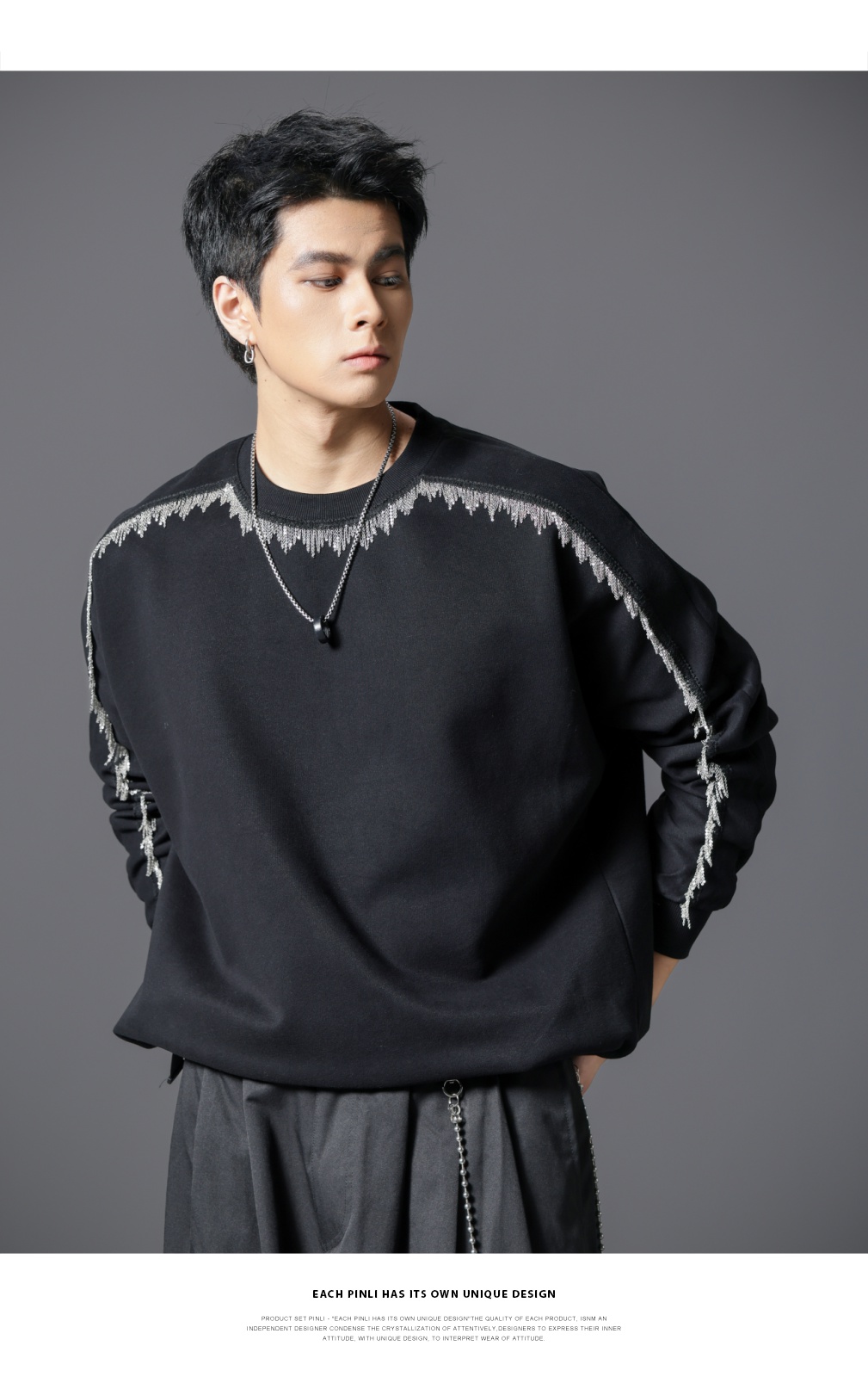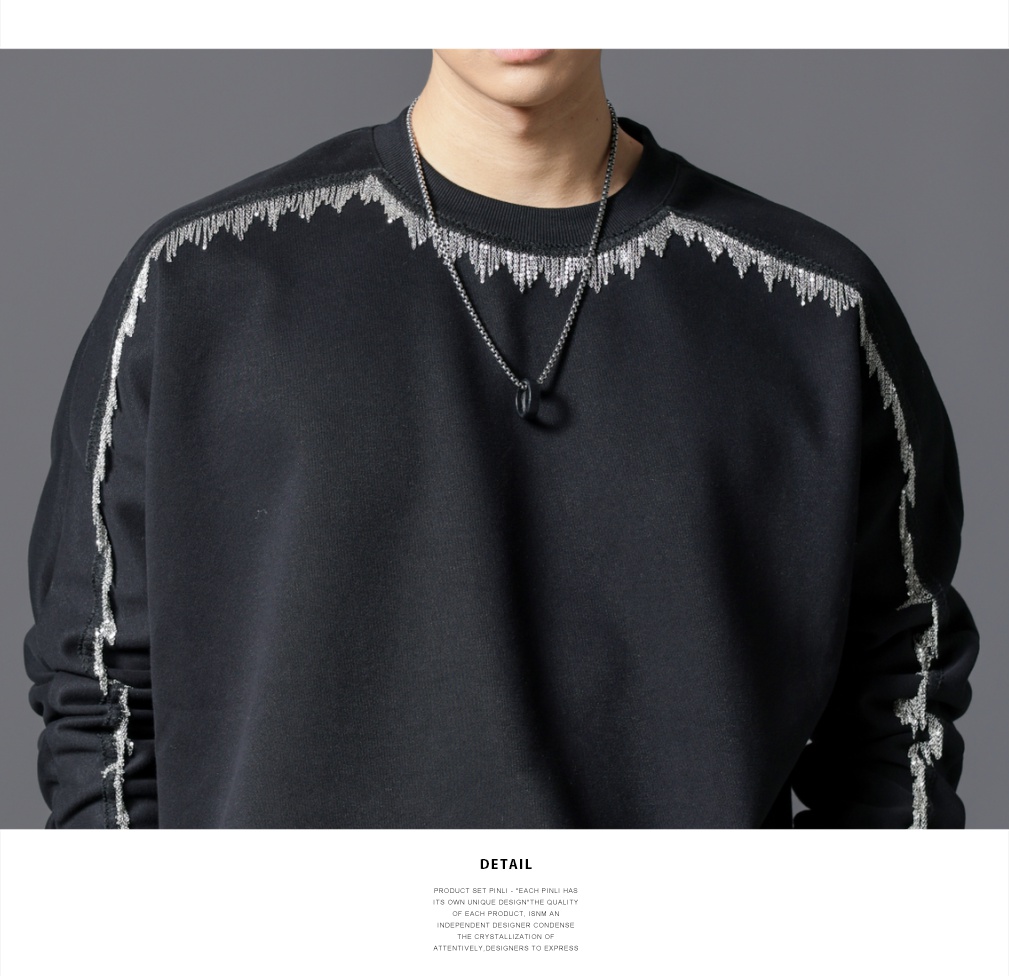 PINLI品立2025秋季新款男士金属流苏织带圆领宽松套头卫衣上衣潮B253109098