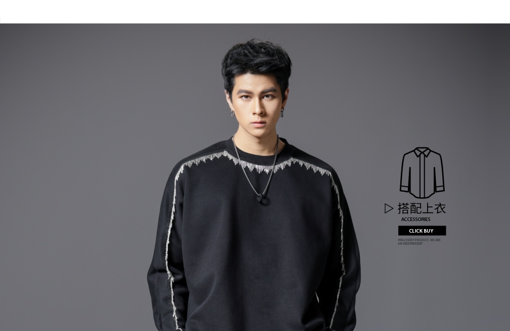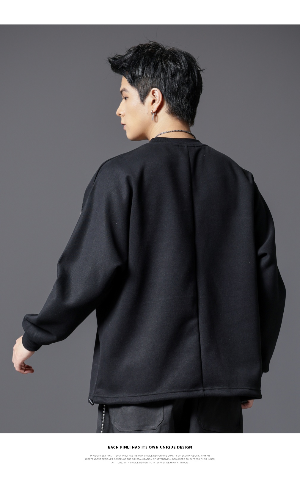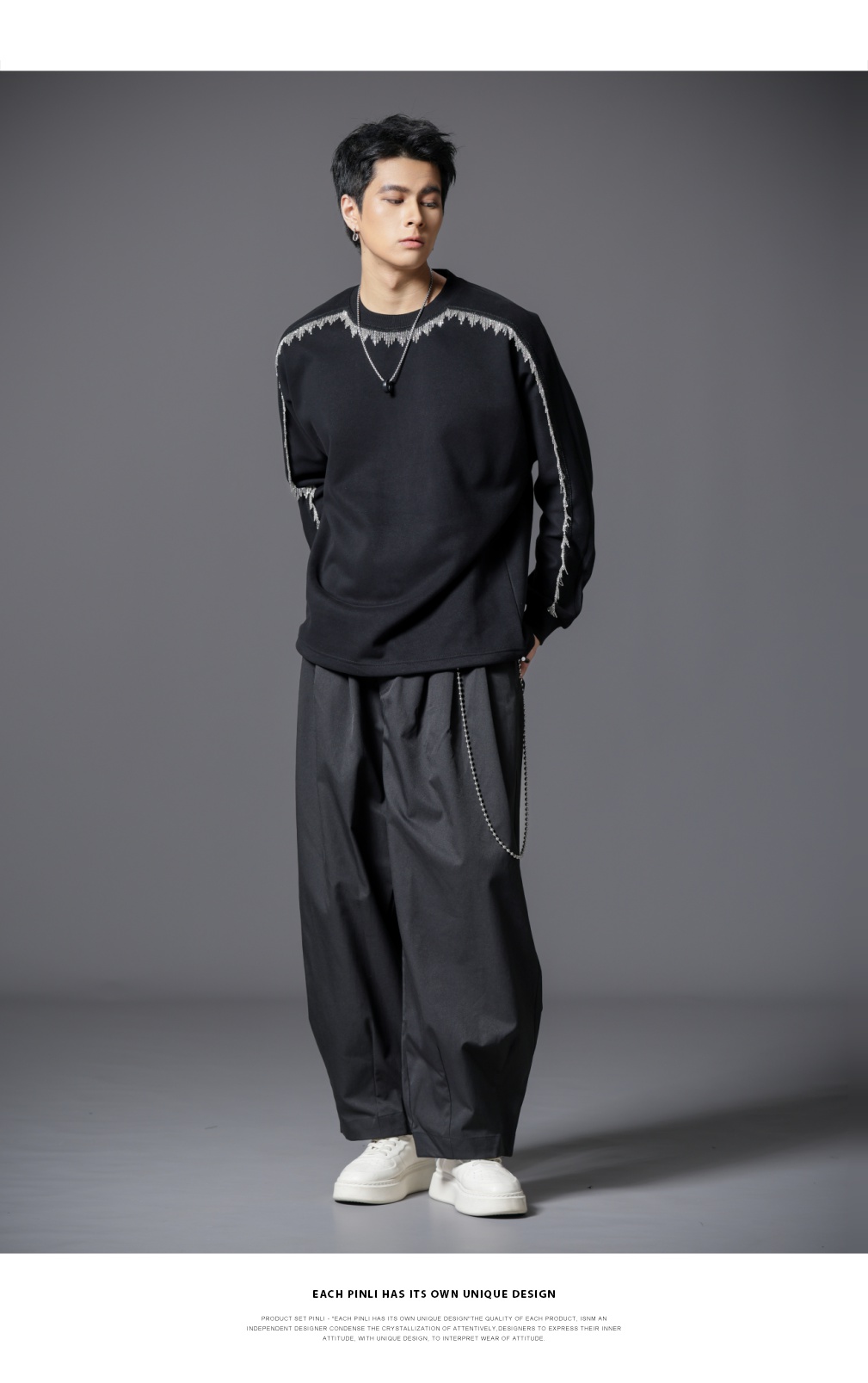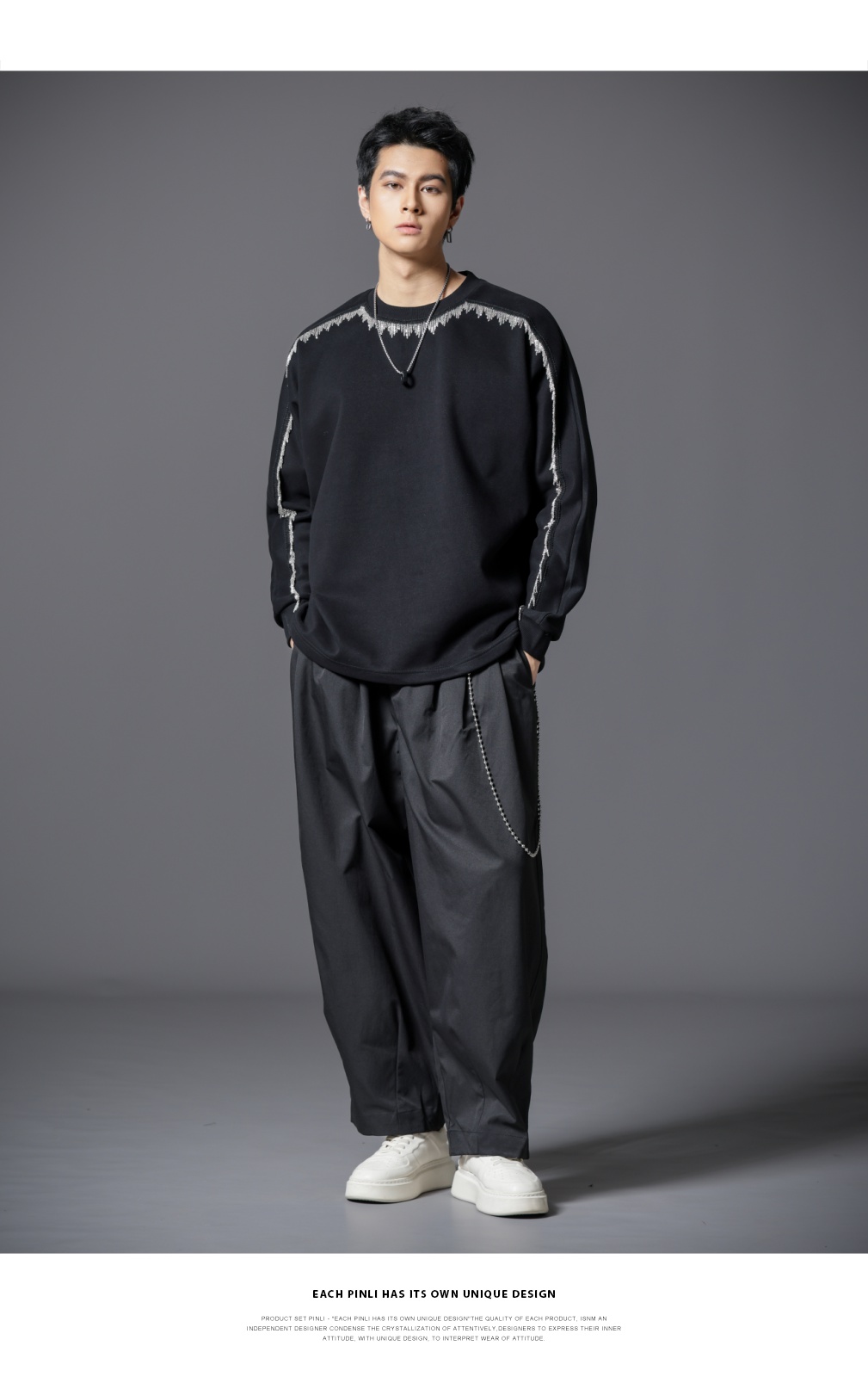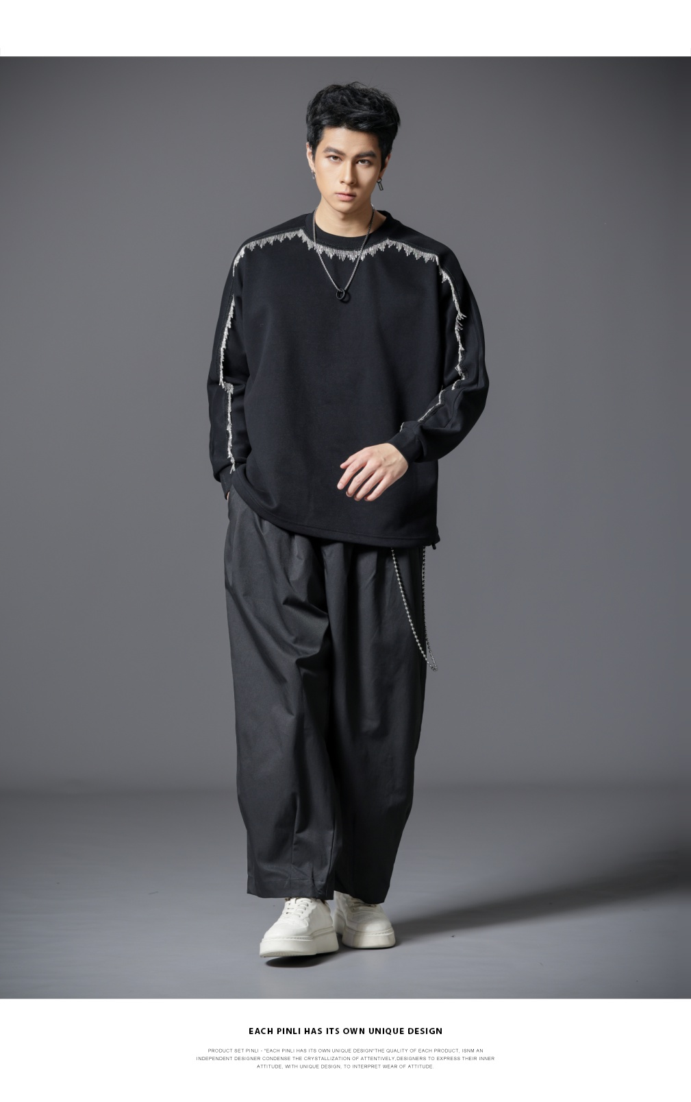 PINLI品立2025秋季新款男士金属流苏织带圆领宽松套头卫衣上衣潮B253109098