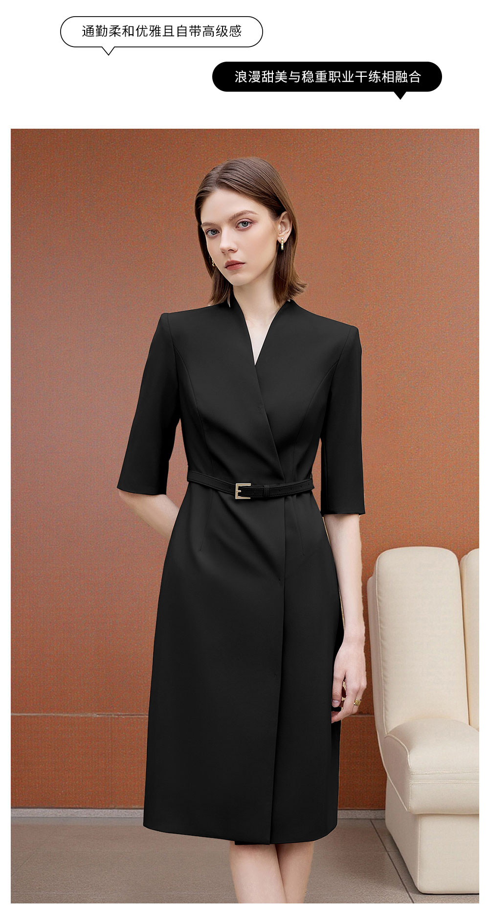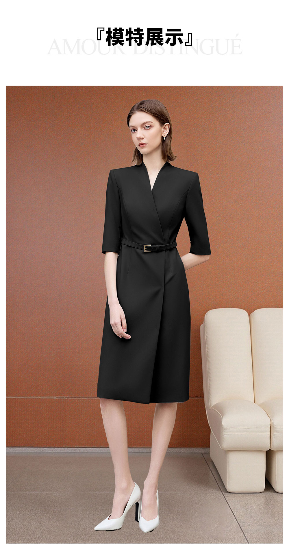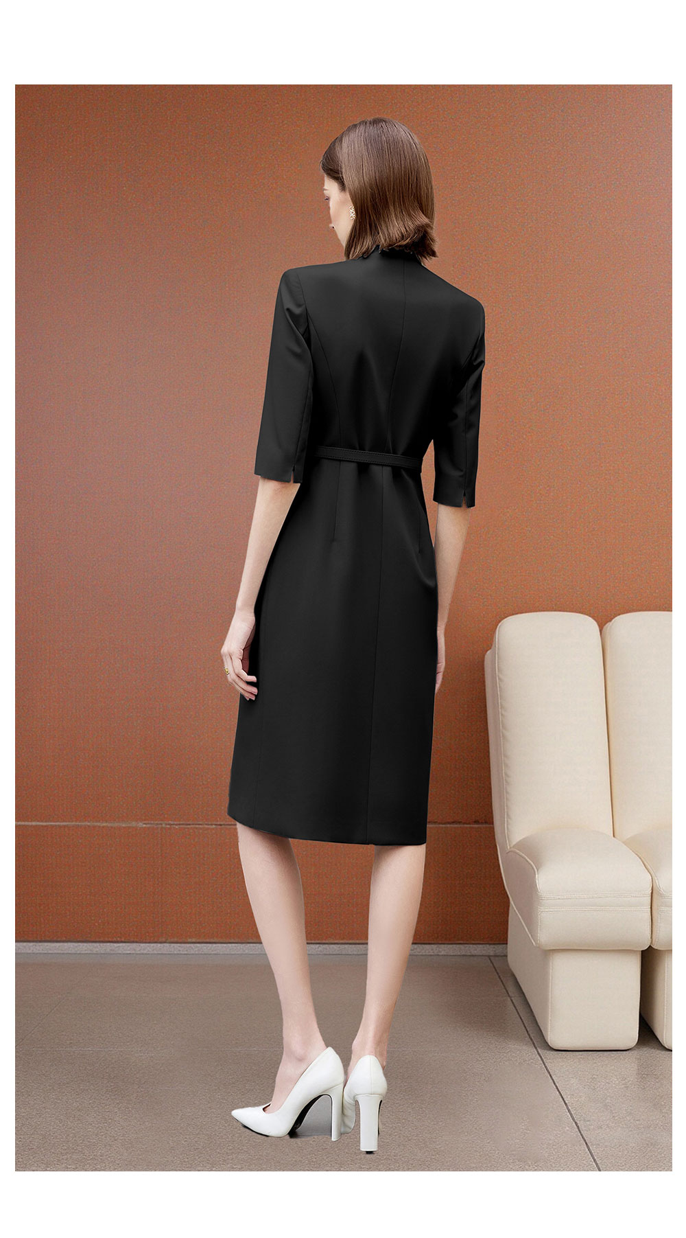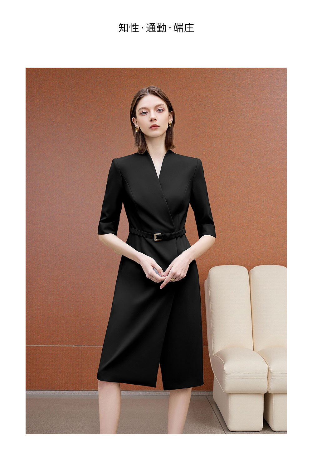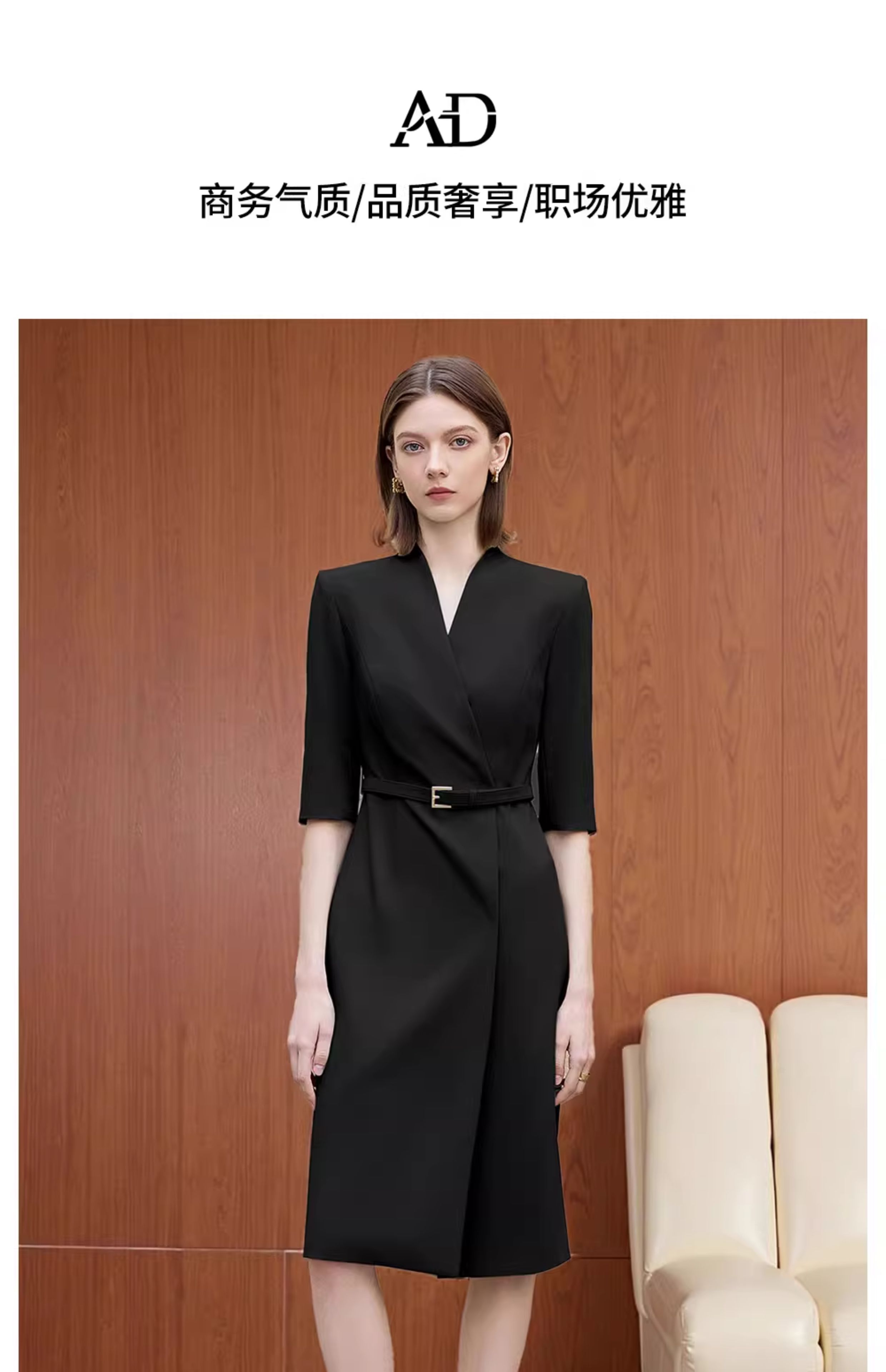 AD黑色工作服女七分袖连衣裙2025秋季新款防走光中长款无领西装裙