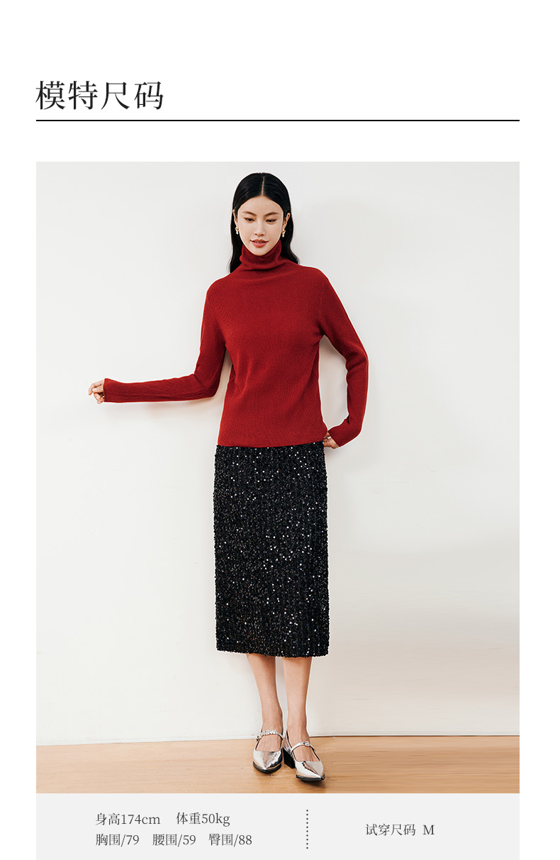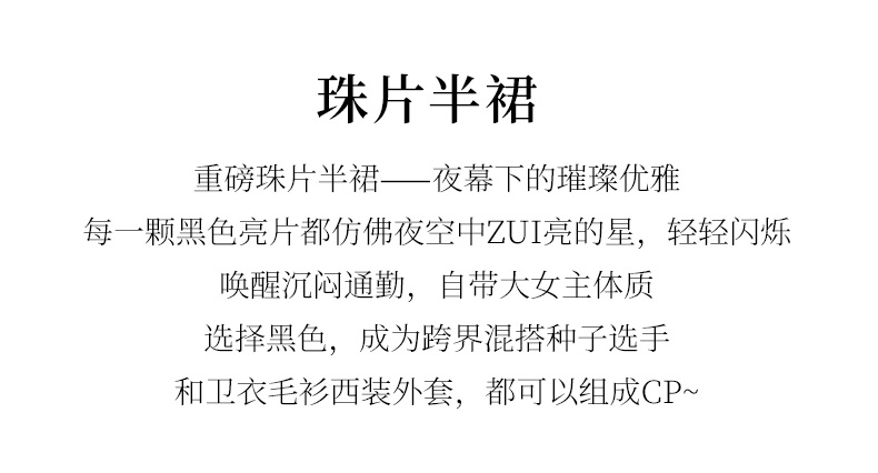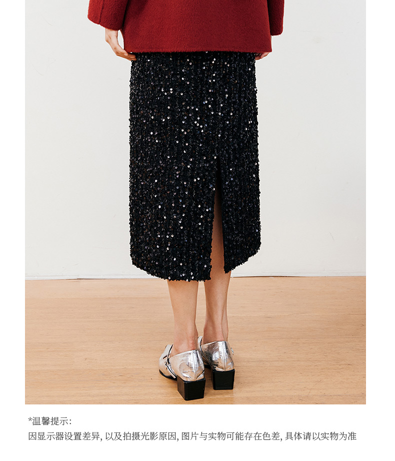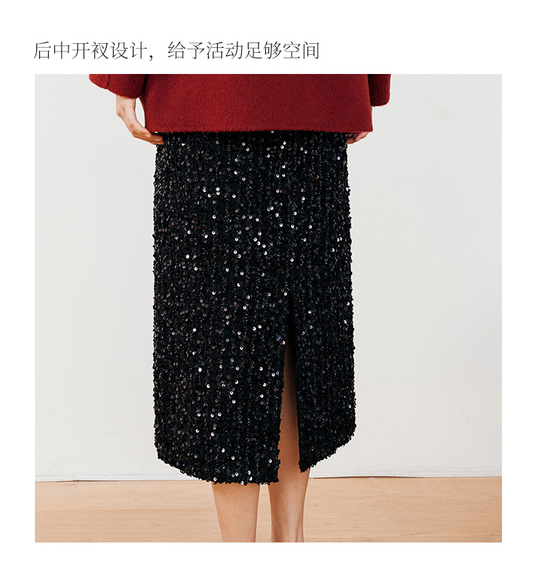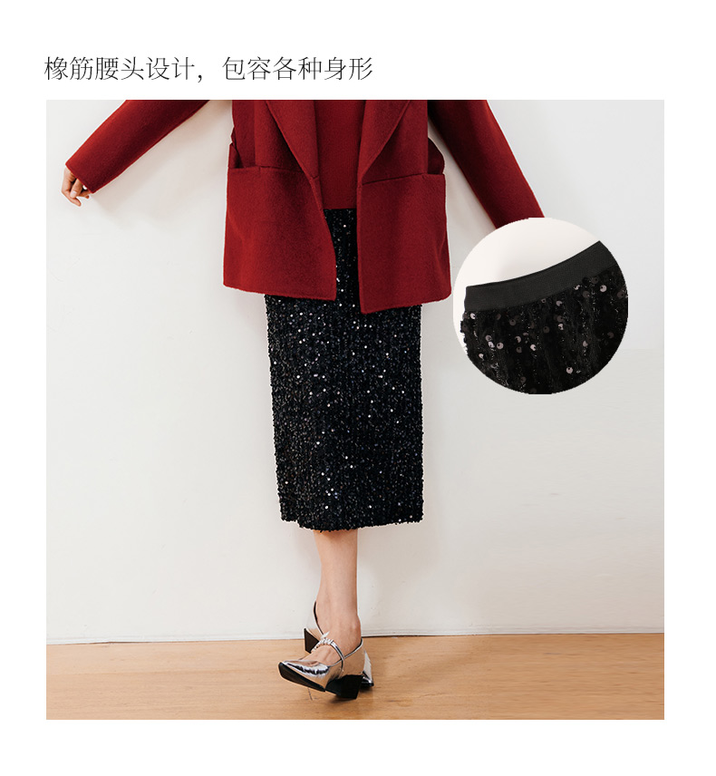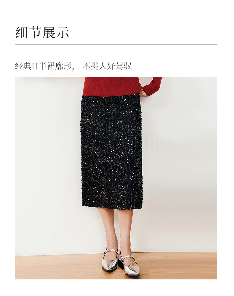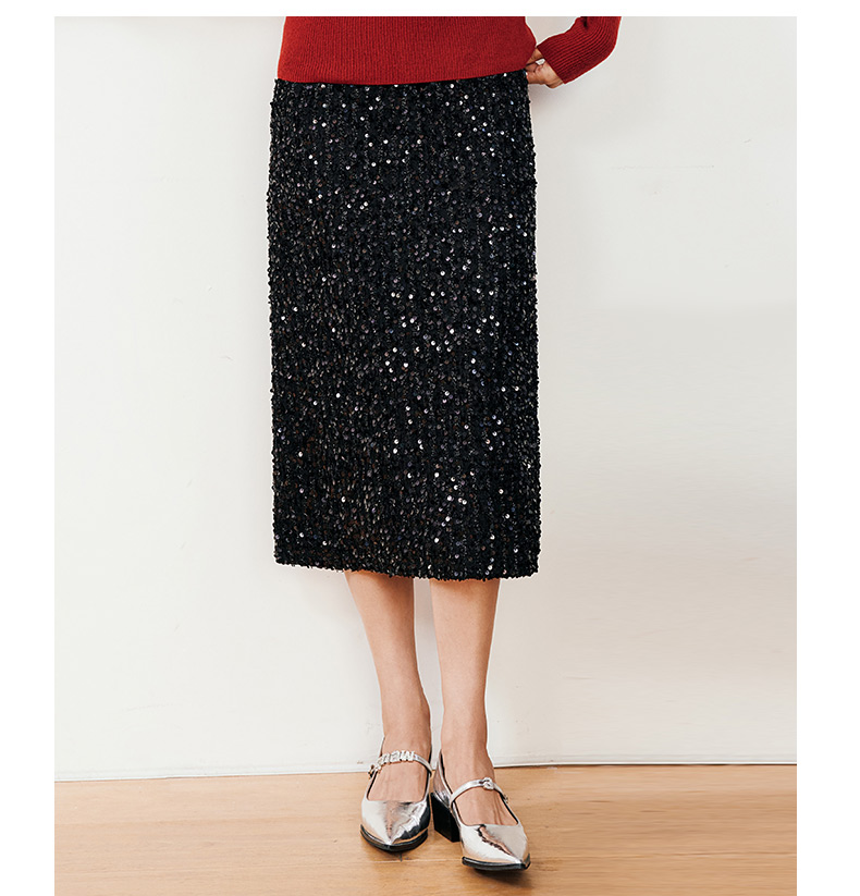 玳莎重工黑色珠片半裙女2024冬季新款流光高级松紧高腰中长裙开衩 ED34306